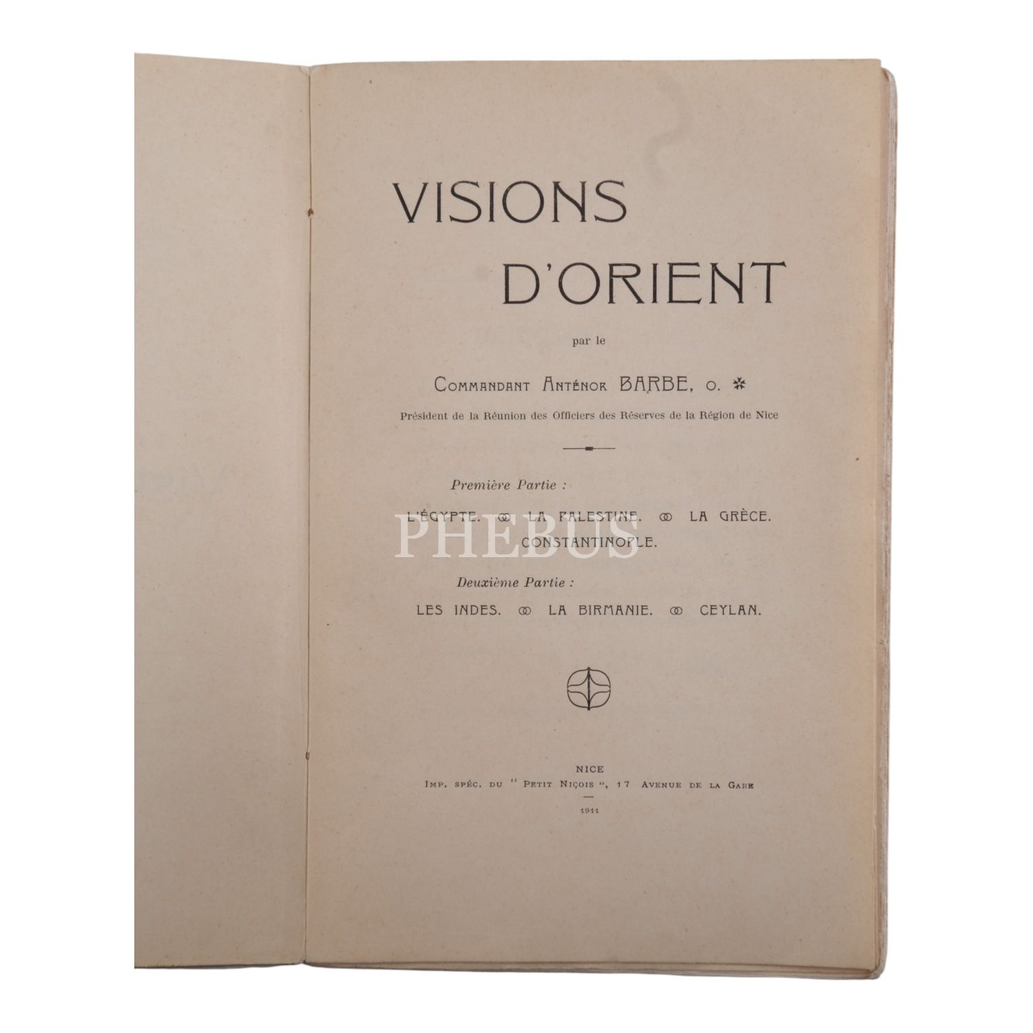 VISIONS D’ORIENT, PREMIÉRE PARTIE: L’ÉGYPTE, LA PALESTINE, LA GRÉCE, CONSTANTINOPLE. DEUXIÉME PARTIE: LES INDES, LA BIRMANIE, CEYLAN, IMP SPÉC, Anténor Barbe, 1911, Du “Petit Niçois”, Nice, 224 sayfa, 18,5x12 cm...