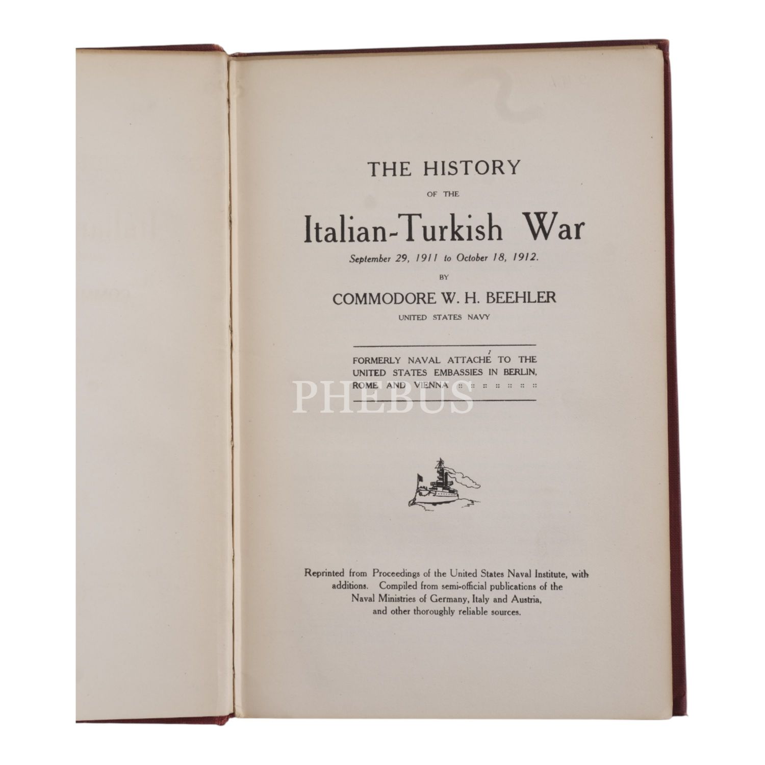1911-12 yılları arasındaki Osmanlı-İtalyan (Trablusgarp) savaşı hakkında, Alman, İtalyan ve Avusturya Bahriye nazırlıklarının yarı resmî yayınları ile başka güvenilir belgelere dayanılarak oluşturulan araştırma. William Henry Beehler (1848-1915), yaklaşık dört yıl boyunca Berlin, Roma ve Viyana’daki Amerikan Büyükelçiliklerinde Deniz Ataşesi olarak görev yapmış olan W. H. Beehler’dir. Rapor önce A.B.D. Deniz Kuvvetleri’ni bilgilendirmek için hazırlanmış, daha sonra da 1912-13 yılları arasında dört bölümde Amerikan Deniz Enstitüsü Bildirileri olarak yayımlanmıştır. Yukarıdaki kitap, bu bildirilerin, birtakım ilavelerle yapılmış baskısıdır. Metin içinde harita ve planlar, metin dışında 1 katlanan harita, ön kapak içinde yazarın ıslak imzasını taşıyan bir mektup bulunmaktadır. Bez cildinde.