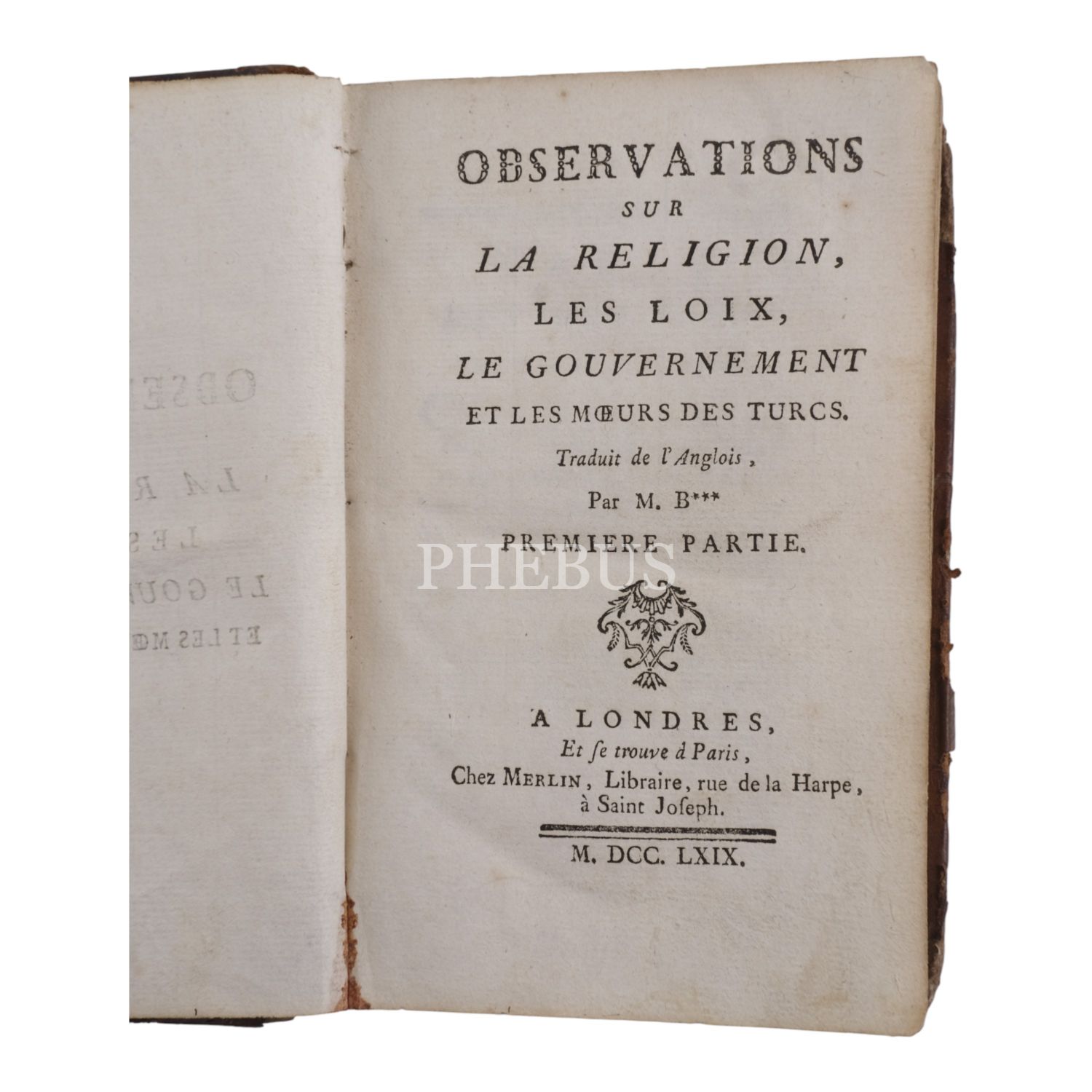 OBSERVATIONS SUR LA RELIGION, LES LOIX, LE GOUVERNEMENT ET LES MOEURS DES TURCS (2 cilt bir arada), Sir James Porter, 1769, [Bergier], Chez Merlin, 149; 144 sayfa, 17x11 cm...
