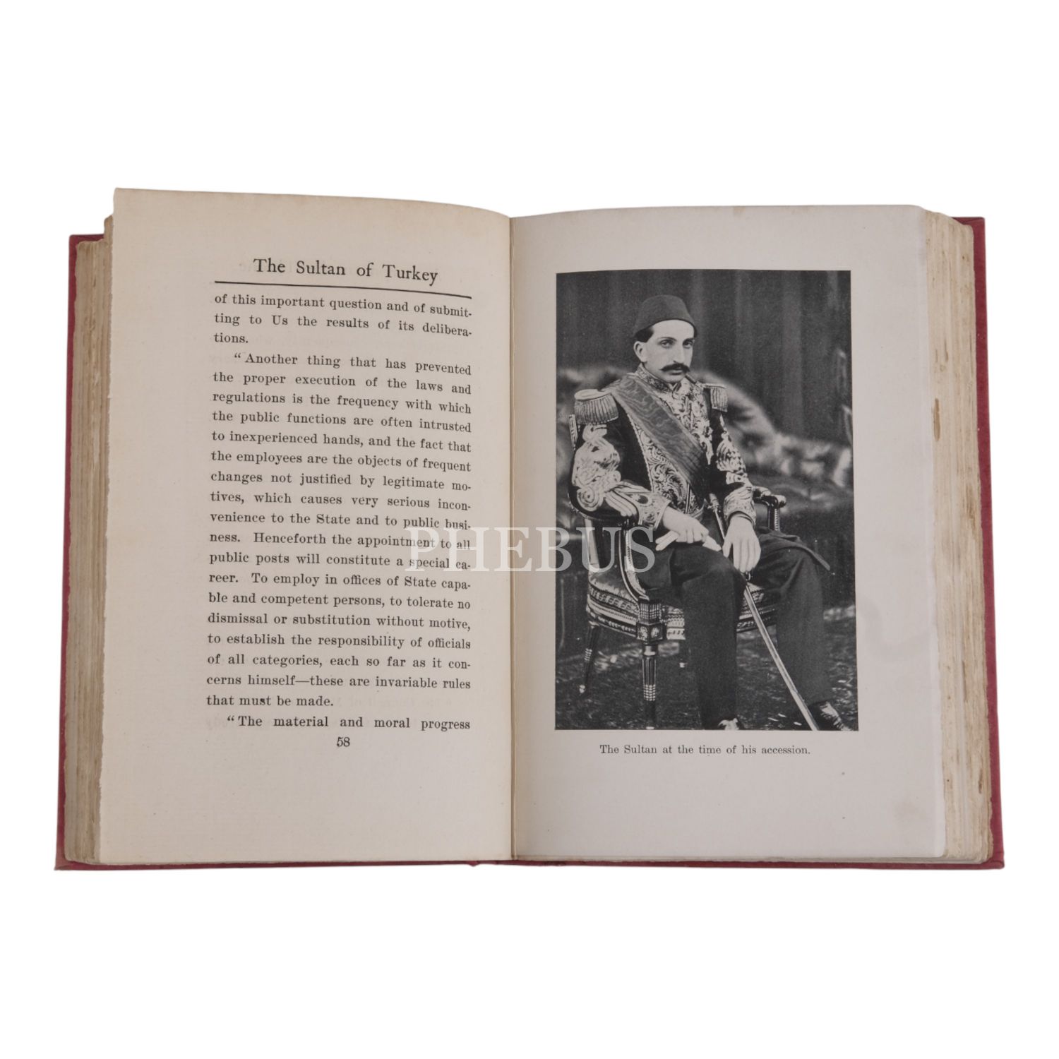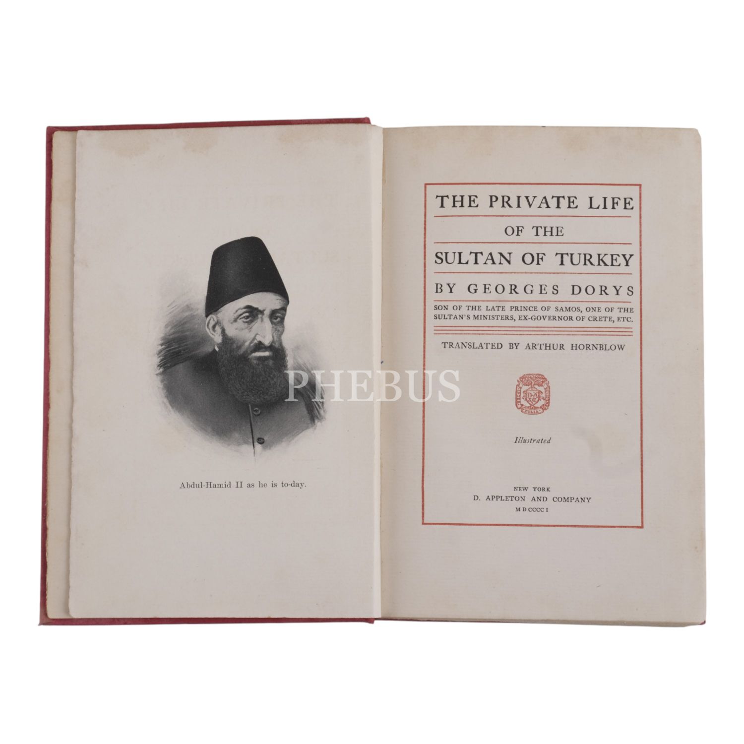 Fransızca’dan çeviren ve önsözü yazan Arthur Hornblow. Georges Dorys yazarın kullandığı mütear isimdir. Yazarın babası Konstantin Adossidi Paşa 1872-1874 ve 1878-1884 yılları arasında Sisam Adası Beyliğinde, Girit Valiliğinde bulunmuş, ayrıca Osmanlı başkentinde bakanlık yapmıştı. Yazar eserini oluştururken babasının siyasi arenanın tam merkezinde bulunması sayesinde birinci elden topladığı meteryali kullanmış; materyalin diğer bir kısmı ise yazarın London Times’ın muhabiri olarak görev yaptığı dönemde bir araya gelmiştir. Kitabın yazarı Jön Türk hareketinde aktif olarak çalışmış, Paris’e kaçmış, kitabı da orada yazmıştır. Yıldız Sarayı'na yakın olduğu için II. Abdülhamid’i yakından tanıma fırsatını bulan yazar Sultan’a ve yönetimine muhaliftir. Kitabında özel olarak korunan sarayında her an korku içinde yaşayan, zehirlenme korkusu nedeniyle yiyeceği yemeği önce kedi ve köpeklere tattıran, yaşadığı korkunun bir göstergesi olarak sarayı gece gündüz aydınlık tutan bir sultan portesi çizmektedir. Doğal olarak II. Abdülhamid kitabın basımından sonra kitabın basımını engellemek üzere girişimlerde bulunmuş, örneğin iş İsveç’te kitabın satışını engellemekle sınırlı kalmamış, kitabı aldığından şüphe edilenlerin evleri basılmıştır. Sultan, Fransızca basımın yapıldığı Fransa’da kitabın satışını engellemeye çalışmışsa da kitabın kamuoyunda yarattığı heyecan bunun yapılmasına imkan vermemiştir. Kitap önce Fransızca olarak Abdul-Hamid Intime (Paris, 1901) adıyla basılmış, hemen ardından müzayedemizde sunulan İngilizce baskısı yayınlanmıştır. Çift renk başlık sayfası, başlık sayfası önünde 1 levha (II. Abdülhamid’in siyah-beyaz resmi), metin dışında 12 levhada siyah-beyaz fotoğraflar mevcuttur. Üst kenarı altın yaldızlı bez cildinde.