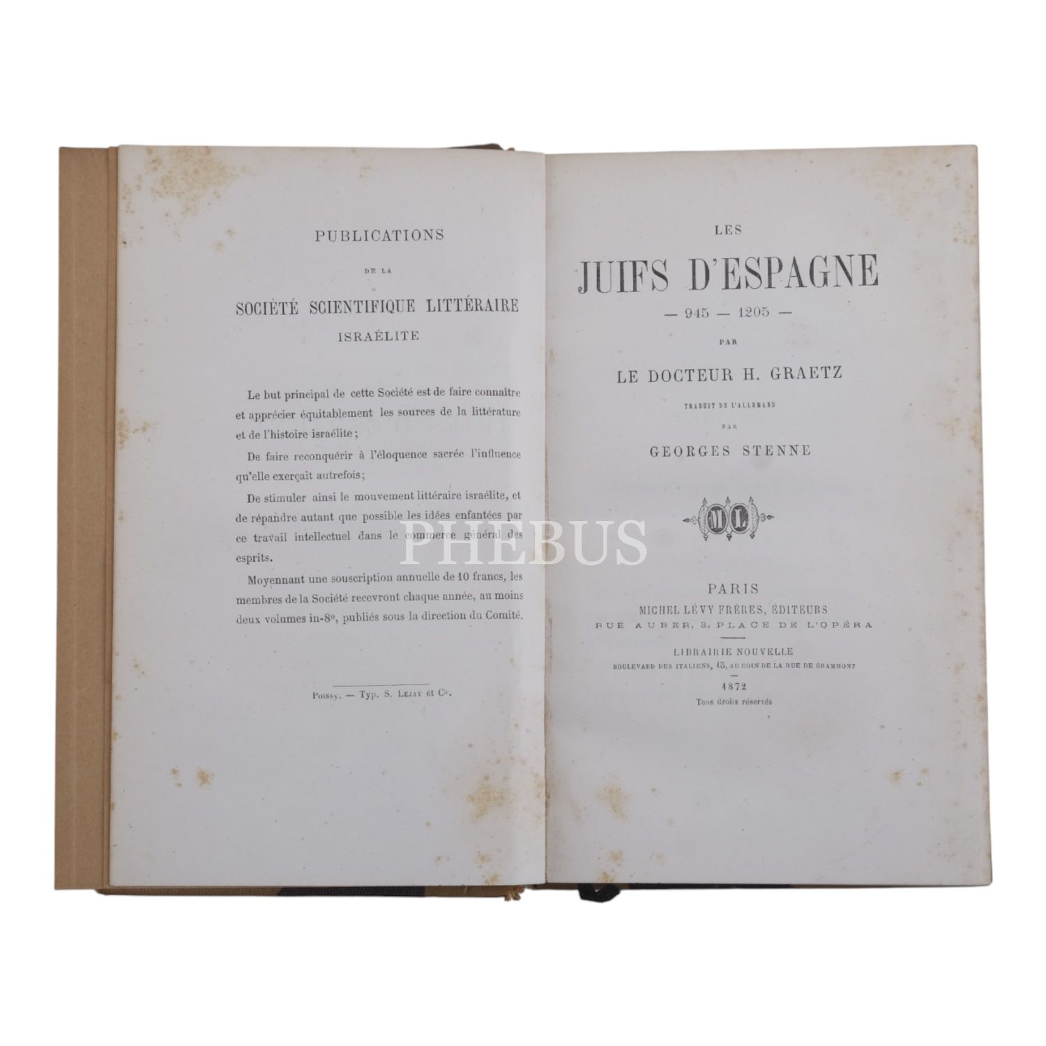 LES JUIFS D´ESPAGNE (945-1205), Docteur H. Graetz, (çeviren: Georges Stenne), 1872, Michel Levy Freres, Editeurs, Paris, 436 sayfa, 14x22 cm...