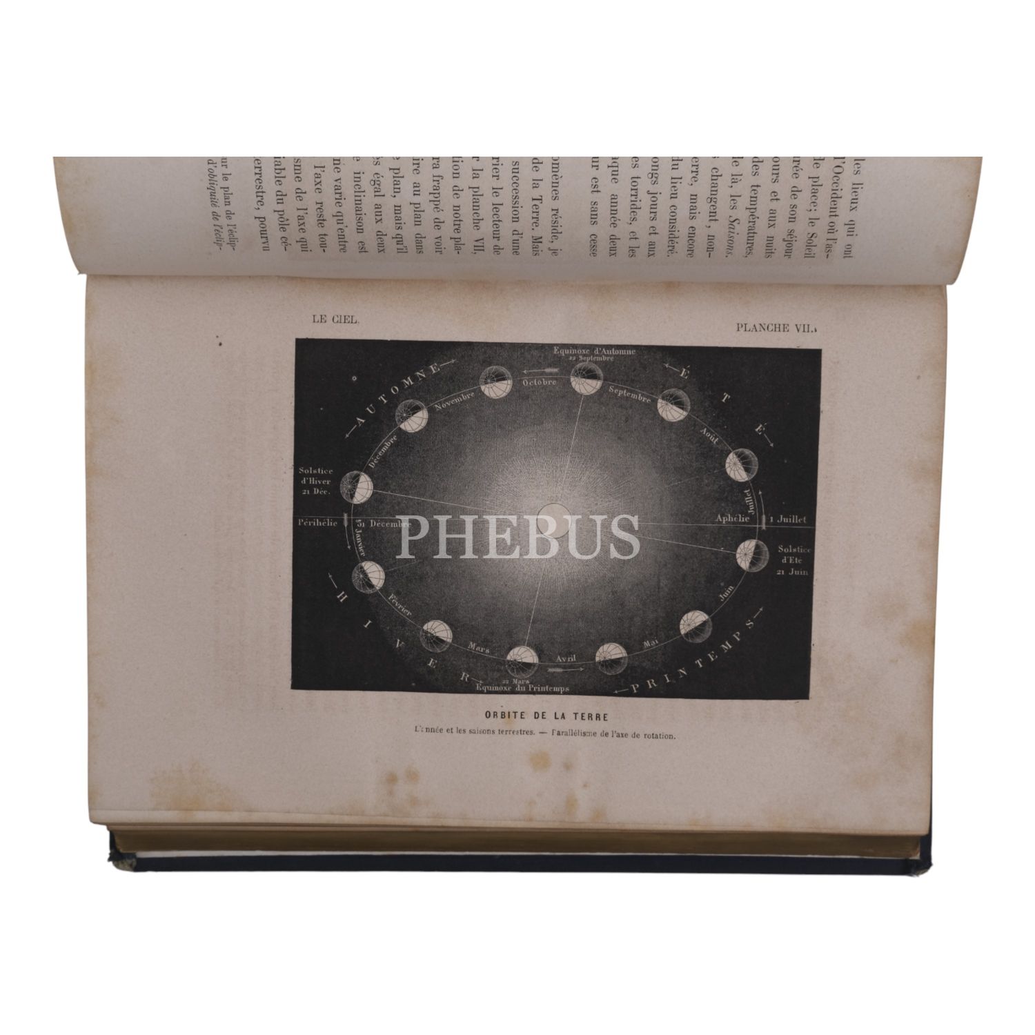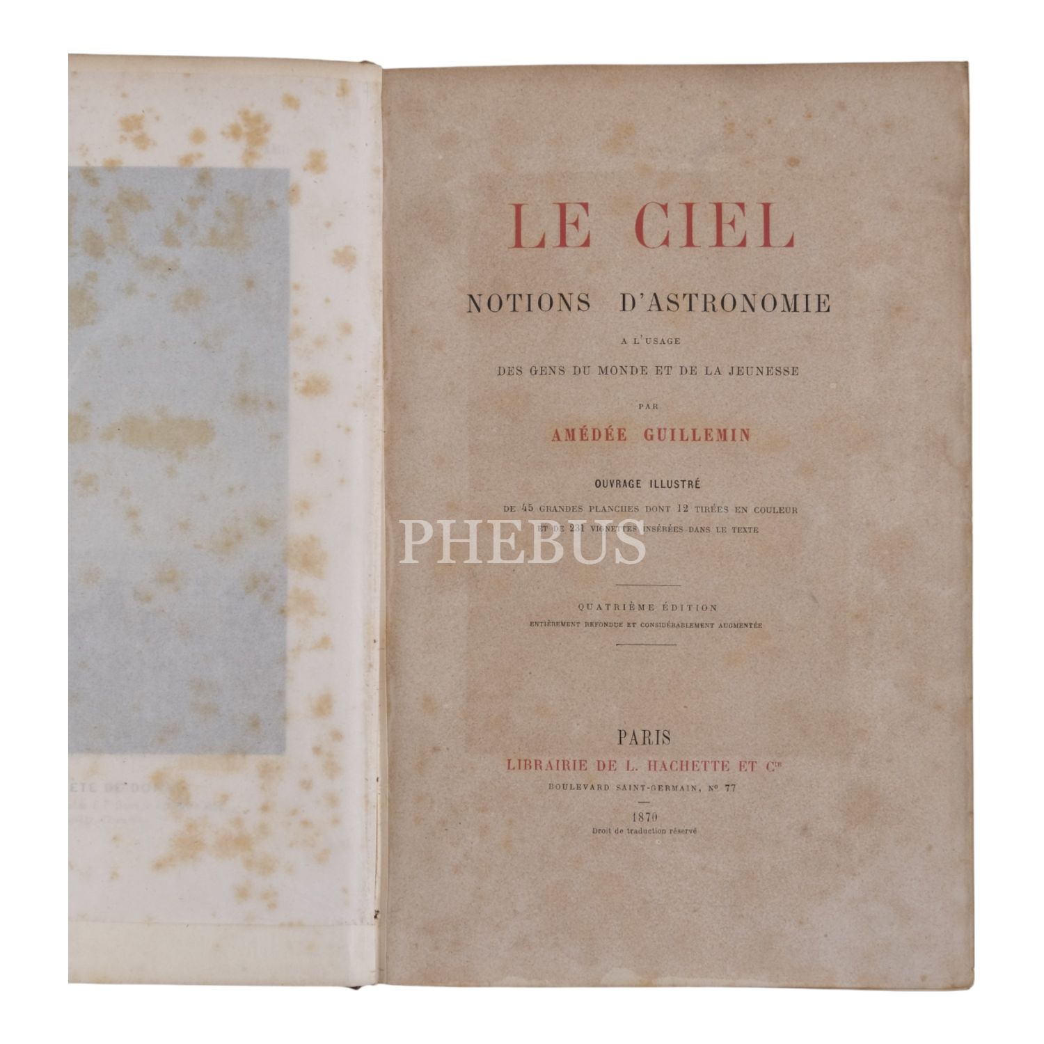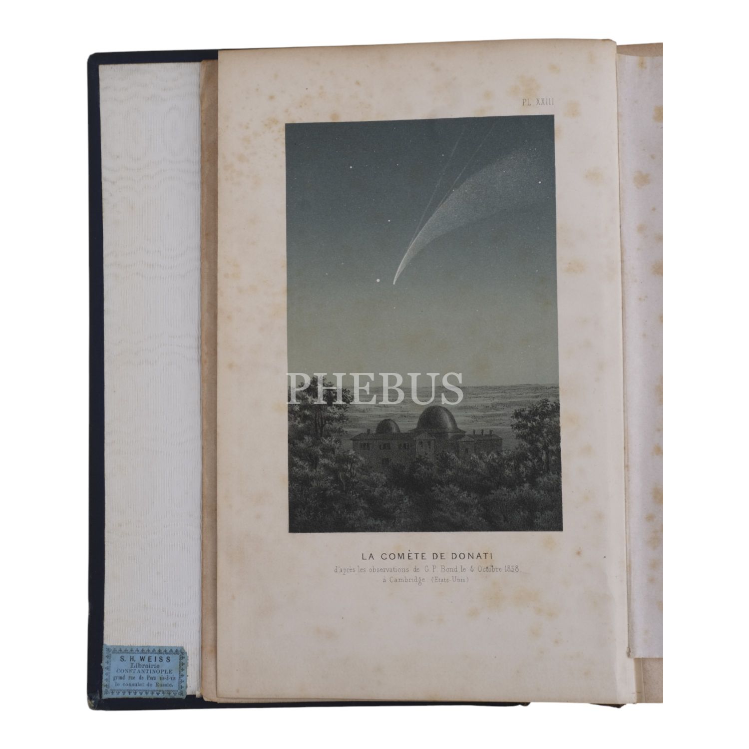 Çok sayıda görsel ve planş eşliğinde gökyüzüne, gezegenlere ve evrene dair kapsamlı bir çalışma... Sırtı panelli ve altın yaldız dekorlu dönem cildinde. Ön iç kapağında İstanbul merkezli kitapçı etiketi yer almaktadır: "S. H. Weiss Librairie - Constantinople, Grand rue de Pera" *Sırtında açılma mevcuttur.