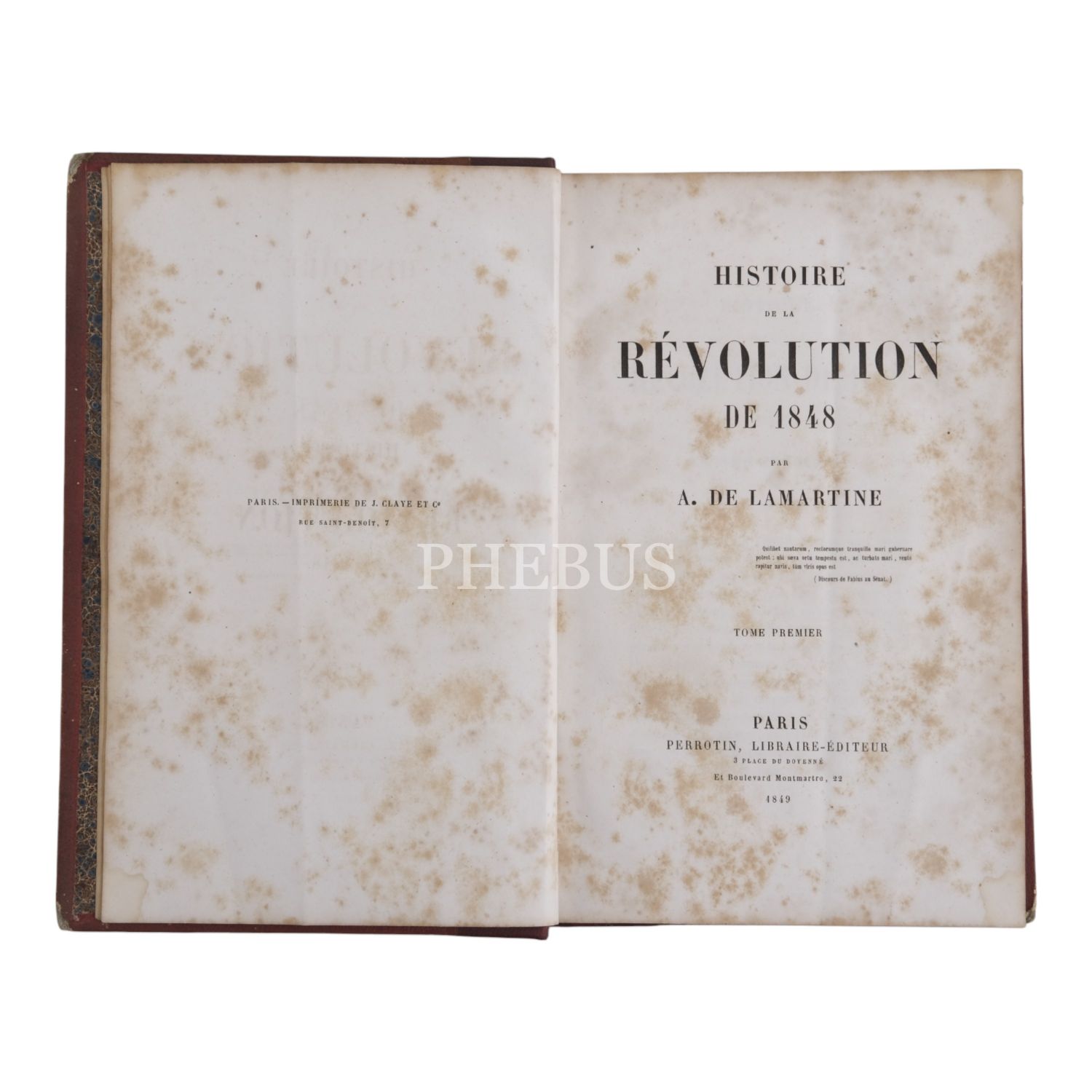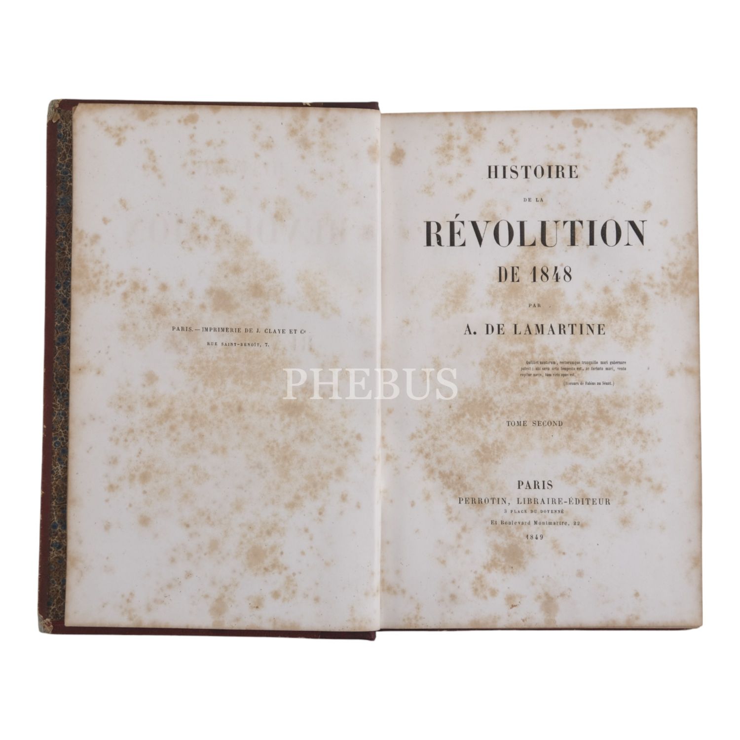 Olayların başrol oyuncularından biri olan Fransız yazar, şair ve politikacı Alphonse de Lamartine´den, 2. Cumhuriyet´in kurulmasıyla neticelenen 1848 Fransız Devrimi (Şubat Devrimi) üzerine sıcağı sıcağına, 1849 tarihli kapsamlı bir tahlil... Sırtları panelli, altın yaldız dekor ve başlıklı deri ciltlerinde. İç kapakları ebru desenlidir.