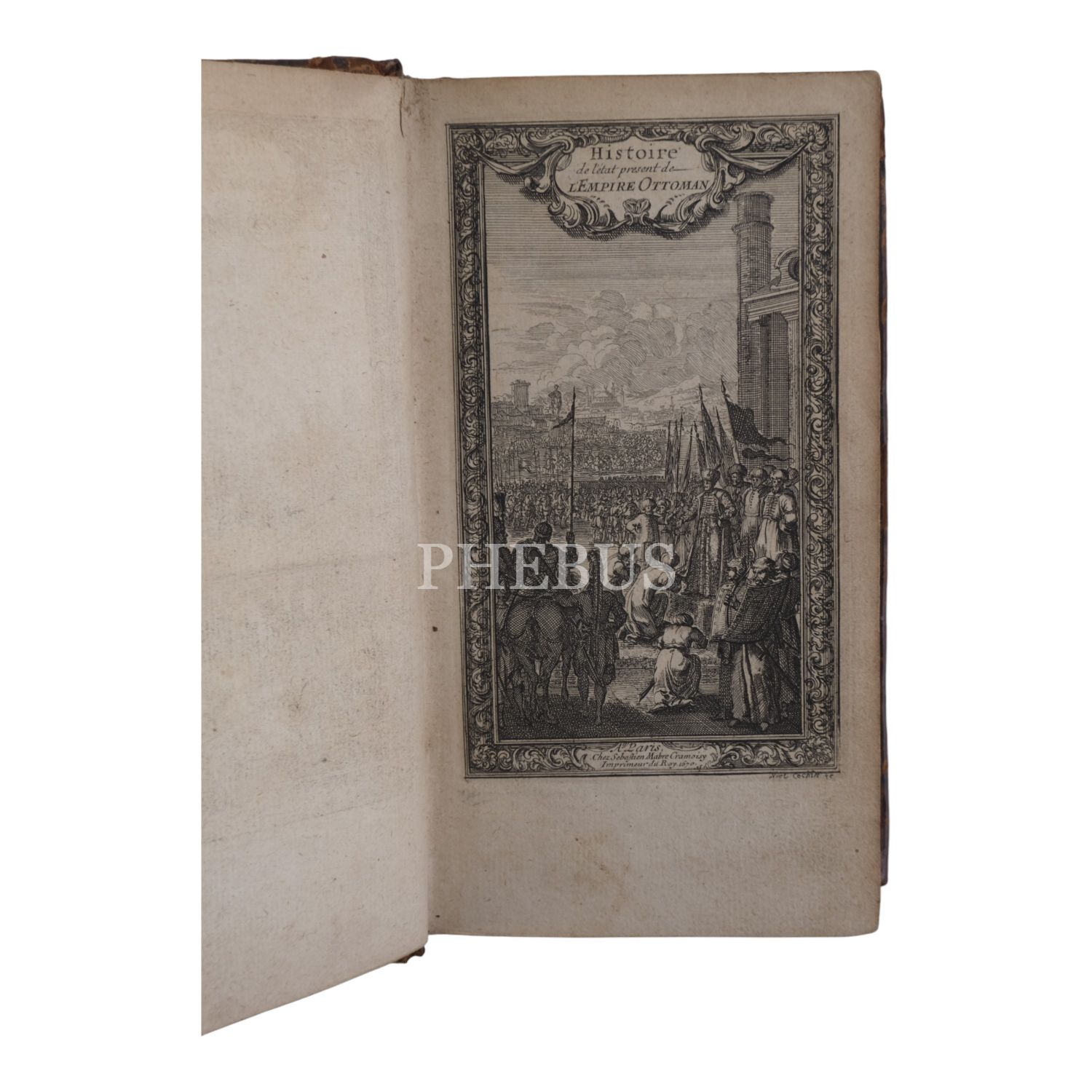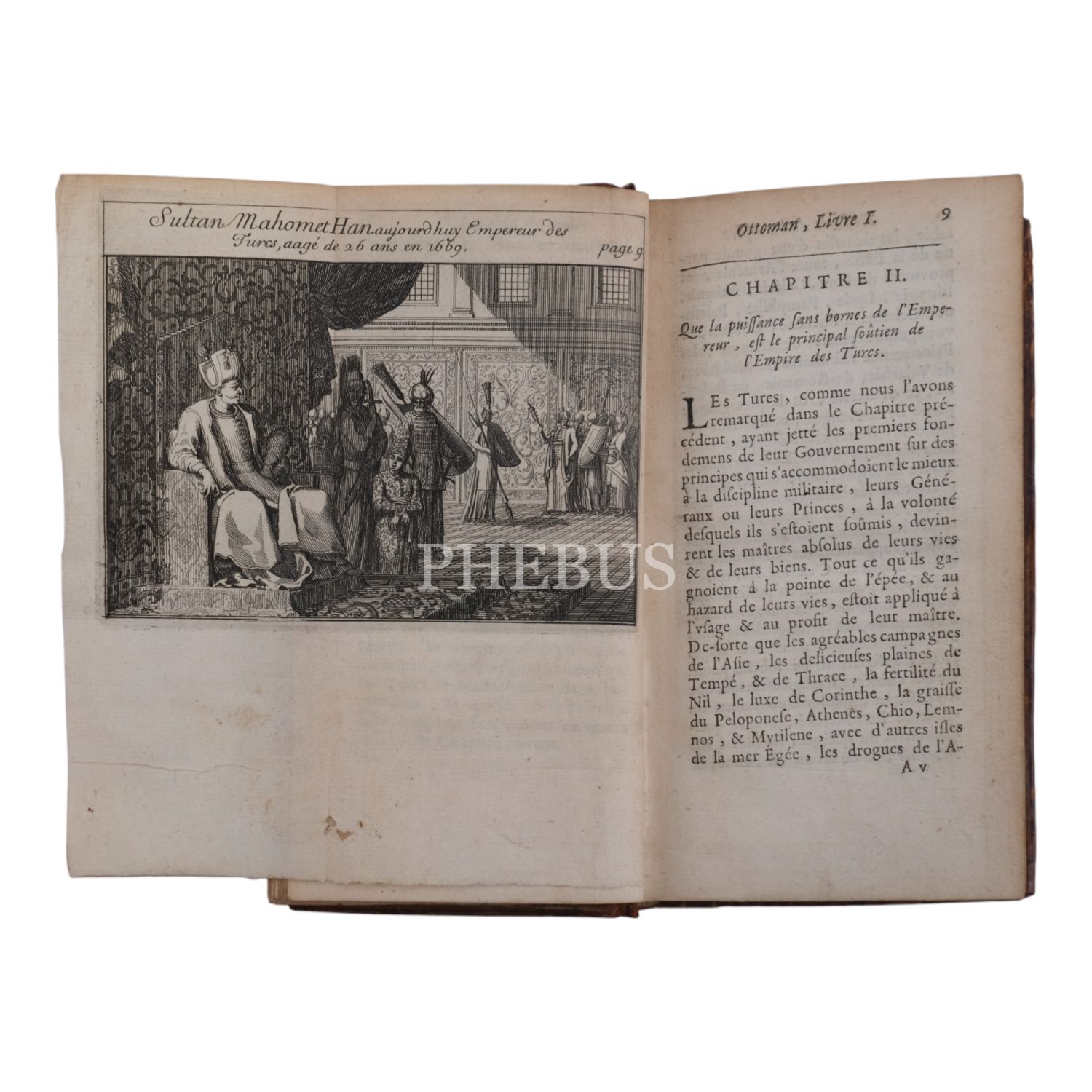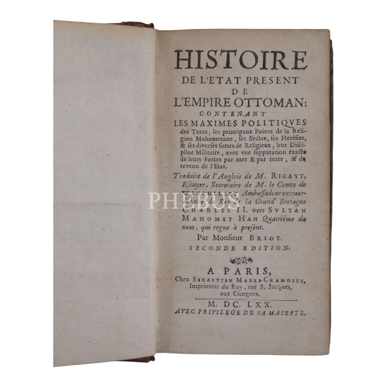 İngiliz diplomat, tarihçi ve Osmanlı İmparatorluğu uzmanı Sir Paul Rycaut (1629-1700) tarafından kaleme alınan ve Osmanlı İmparatorluğu´nun o dönemdeki durumunu tahlil eden eserin Fransızca çevirisi. Alanının en muteber eserlerinden biri olarak halen daha araştırmacıların en çok başvurduğu kaynaklar arasında yer alan kitap; Türklerin politikaları, İslam dininin imparatorluğa etkileri ve Osmanlıların askeri disiplini olmak üzere üç bölümden meydana gelmektedir. Sırtı panelli, altın yaldız dekor ve başlıklı (yer yer silinmiş) deri dönem cildinde. Ön iç kapağında ex libris yer almaktadır.