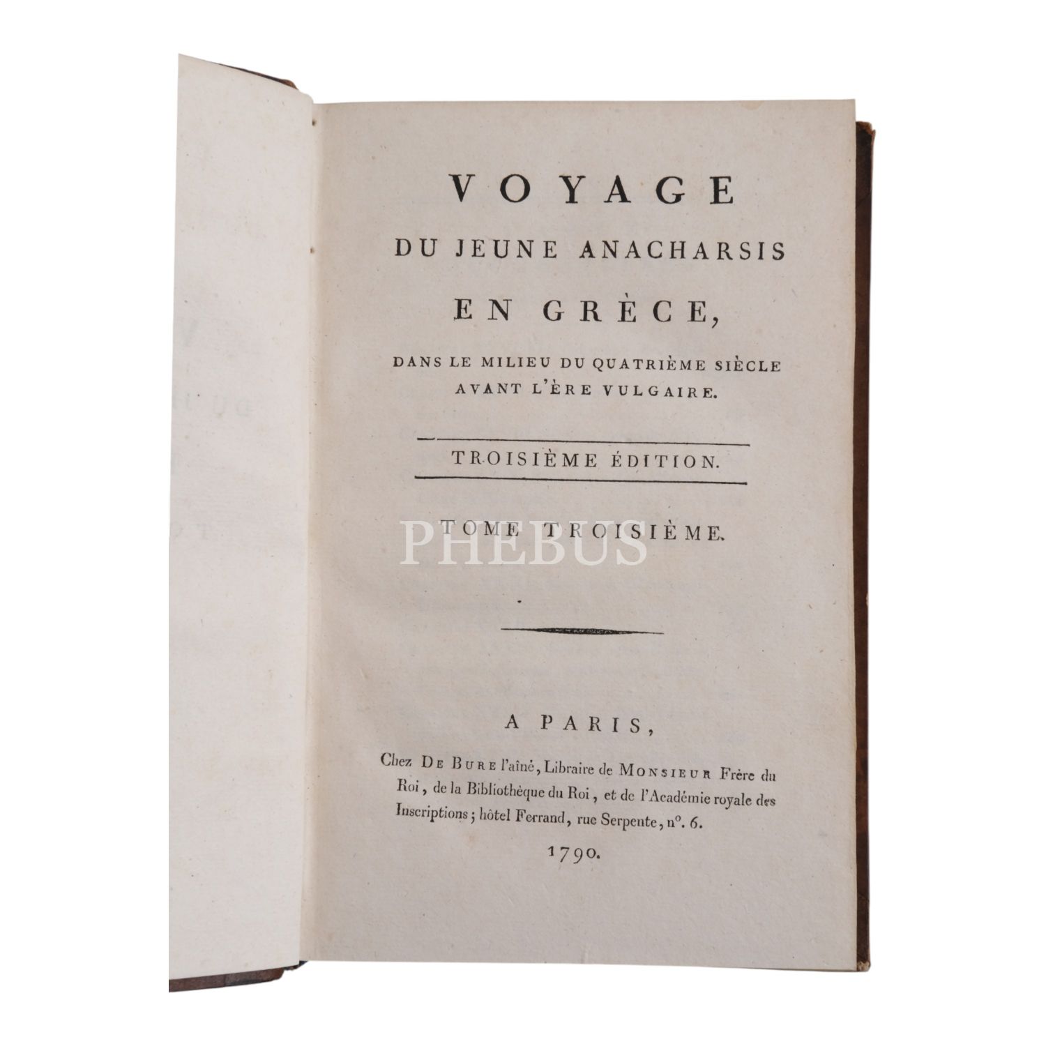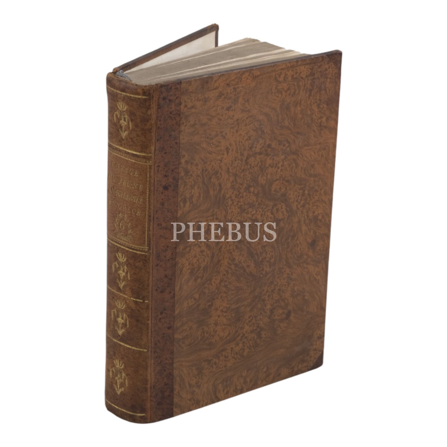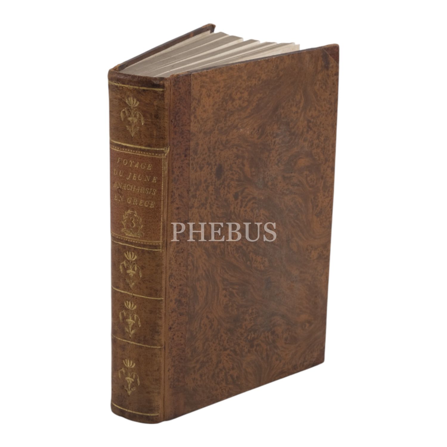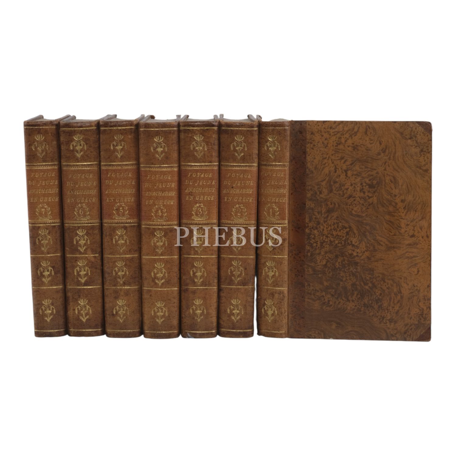 Fransız tarihçi ve aydın Barthelemy´nin, MÖ 363 yılında Antik Yunan dünyasında gezinen Anacharsis ağzından Trakya, İstanbul, Bizans, Anadolu, İran, Mısır, Ege Adaları, Mora Yarımadası ve Atina´yı içeren seyahatnamesi... Sırtı altın yaldız dekor ve başlıklı, ebru kapaklı deri ciltlerinde. 1. cildin ön iç kapağında ex libris yer almaktadır.