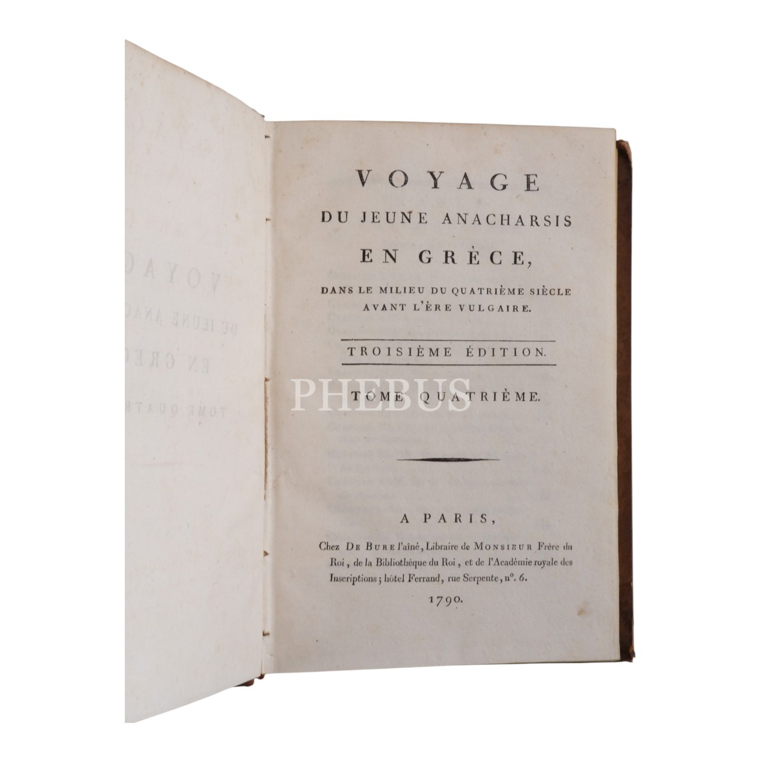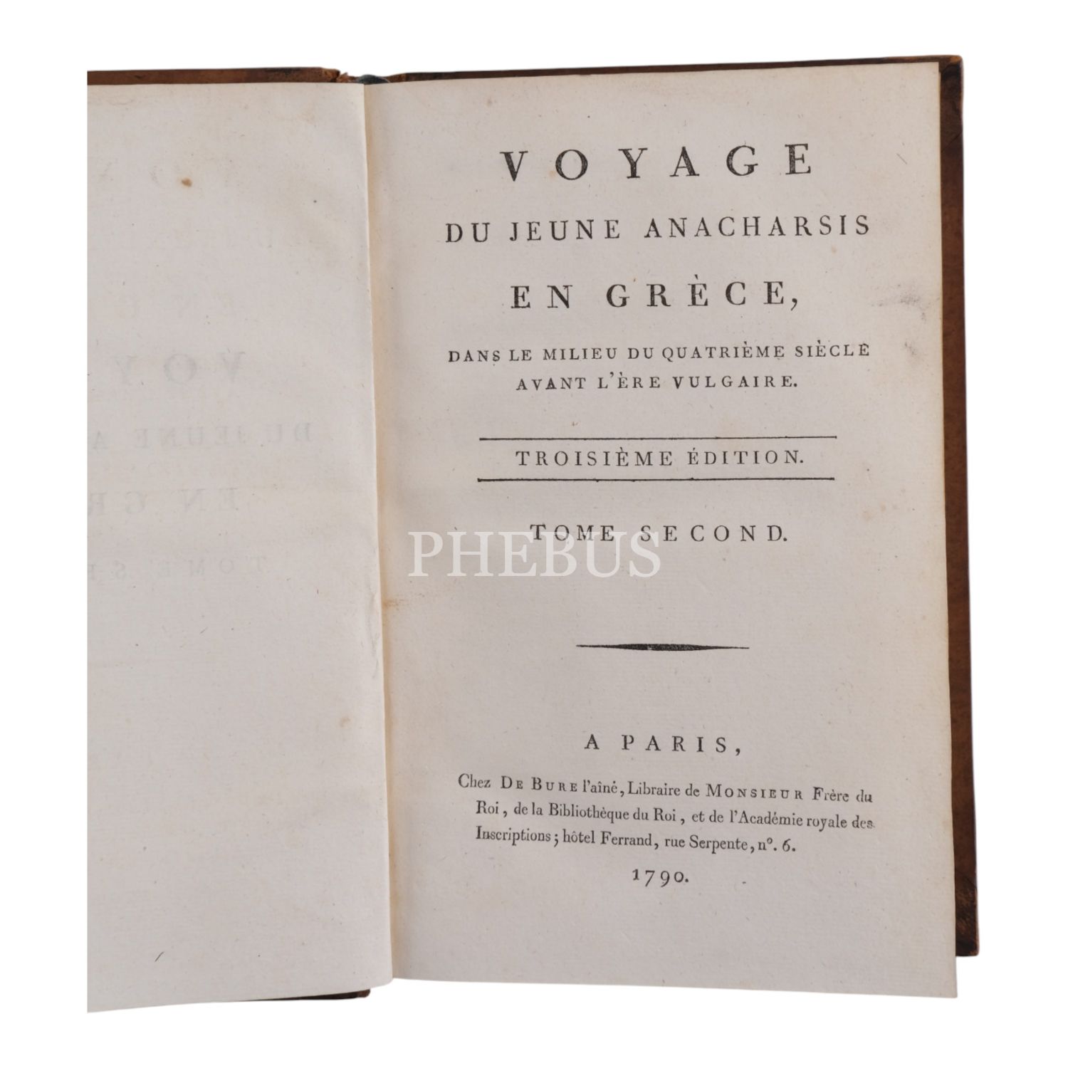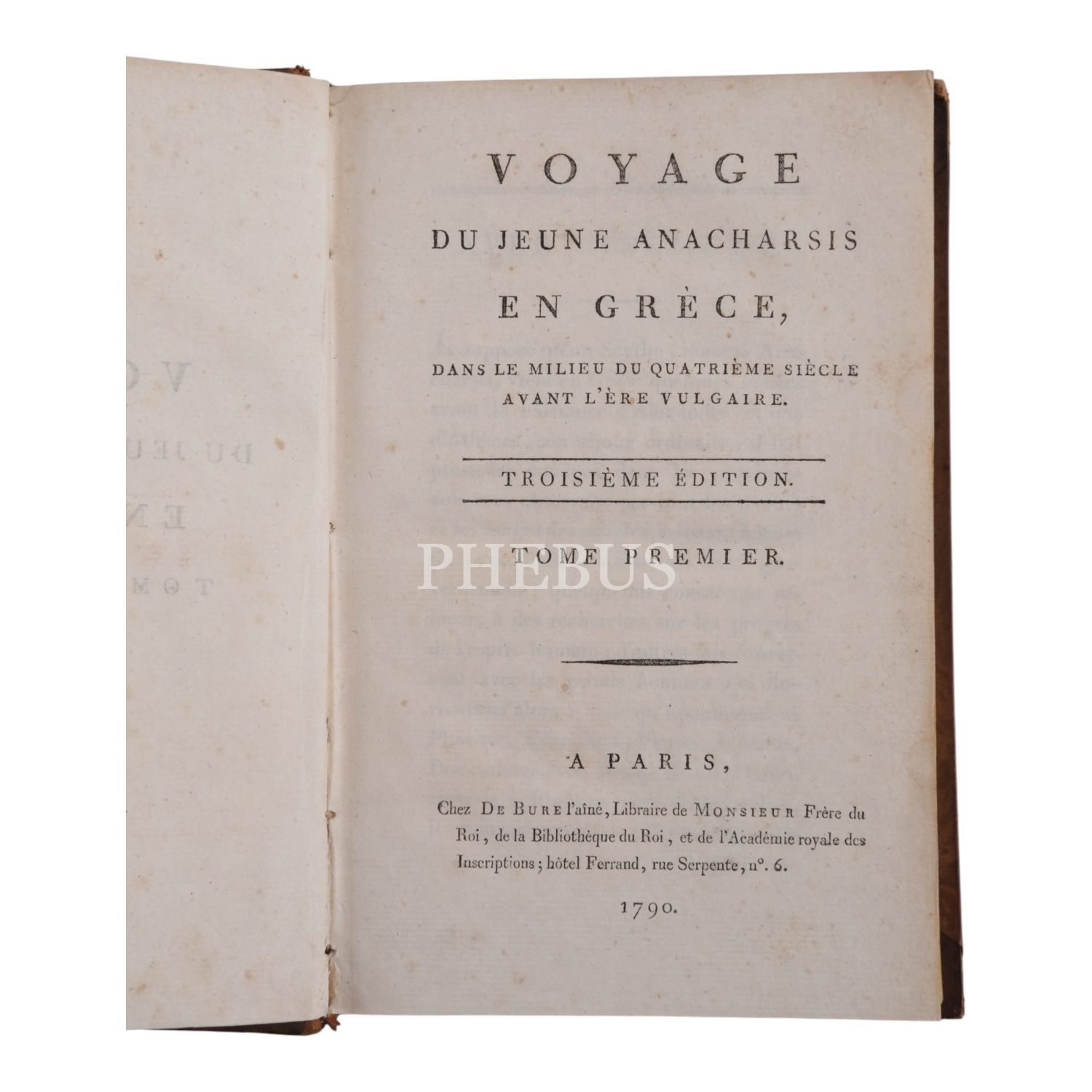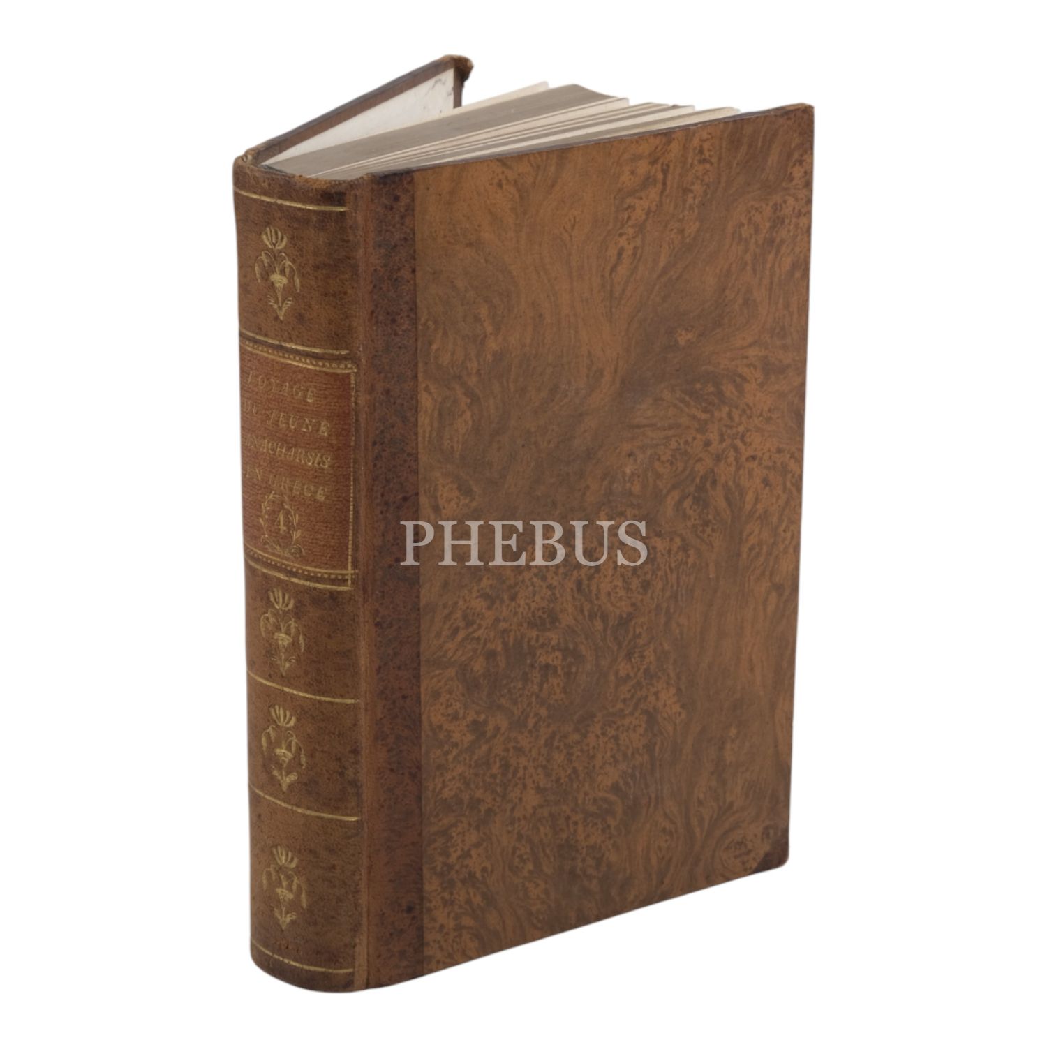 Fransız tarihçi ve aydın Barthelemy´nin, MÖ 363 yılında Antik Yunan dünyasında gezinen Anacharsis ağzından Trakya, İstanbul, Bizans, Anadolu, İran, Mısır, Ege Adaları, Mora Yarımadası ve Atina´yı içeren seyahatnamesi... Sırtı altın yaldız dekor ve başlıklı, ebru kapaklı deri ciltlerinde. 1. cildin ön iç kapağında ex libris yer almaktadır.