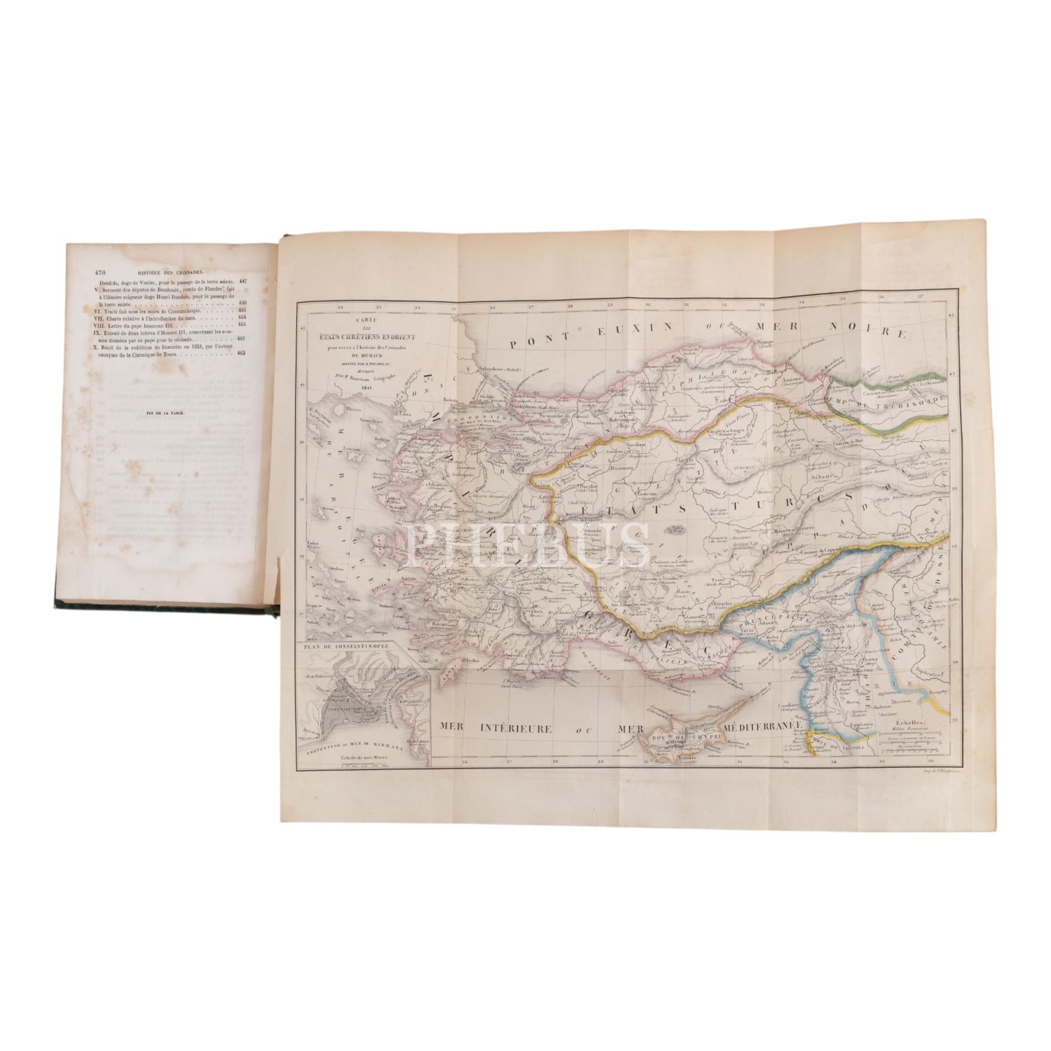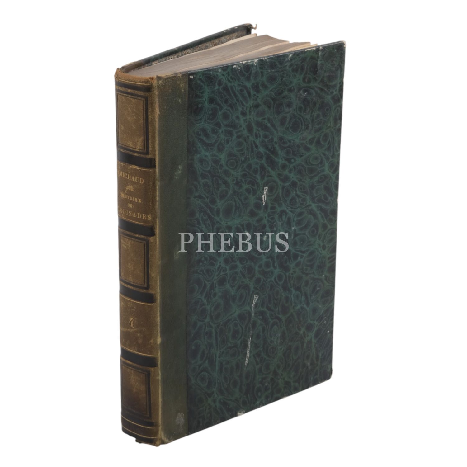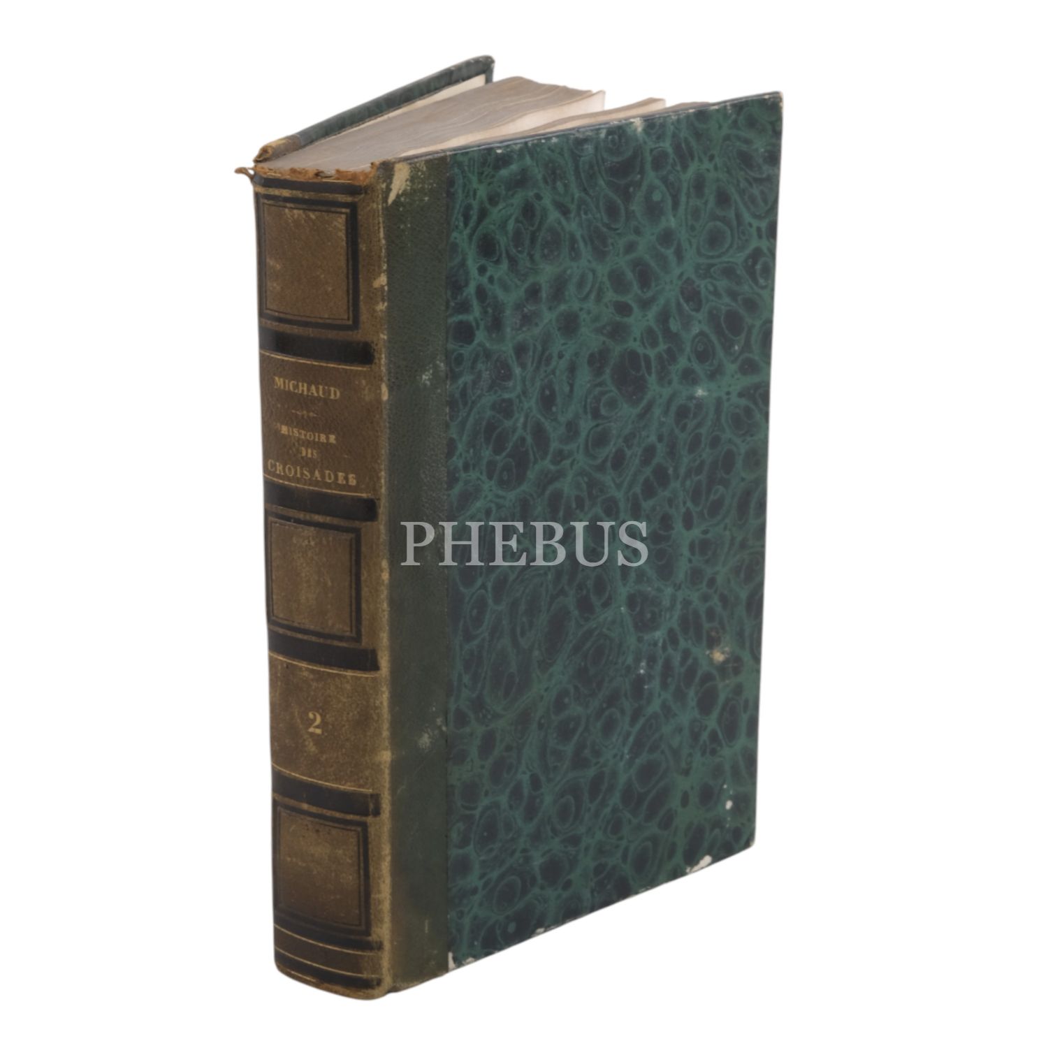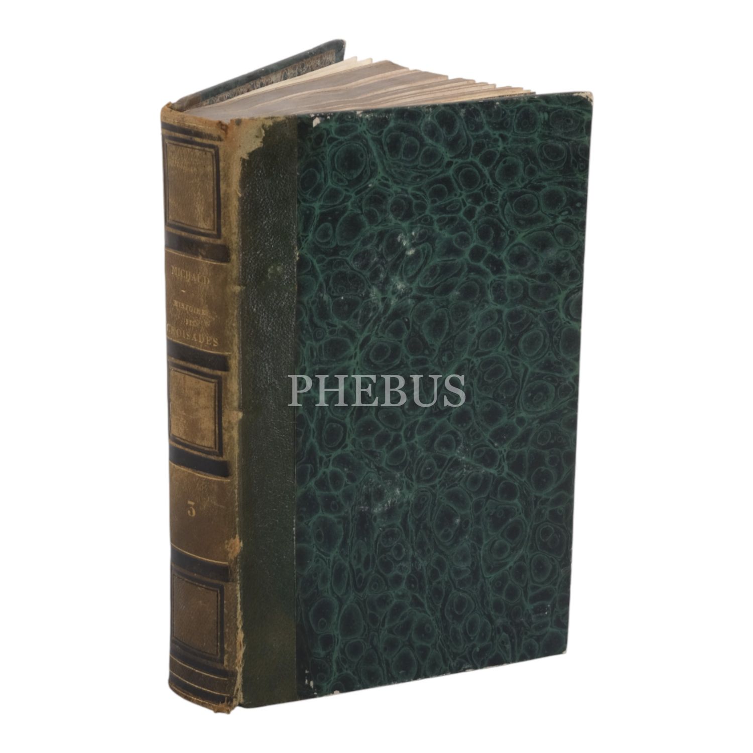 Tam sayfa gravürler ve katlanır haritalar eşliğinde kronolojik Haçlı Seferleri tarihi... Deri sırtları panelli ve altın yaldız başlıklı, iç ve dış kapakları ebru desenli dönem ciltlerinde.