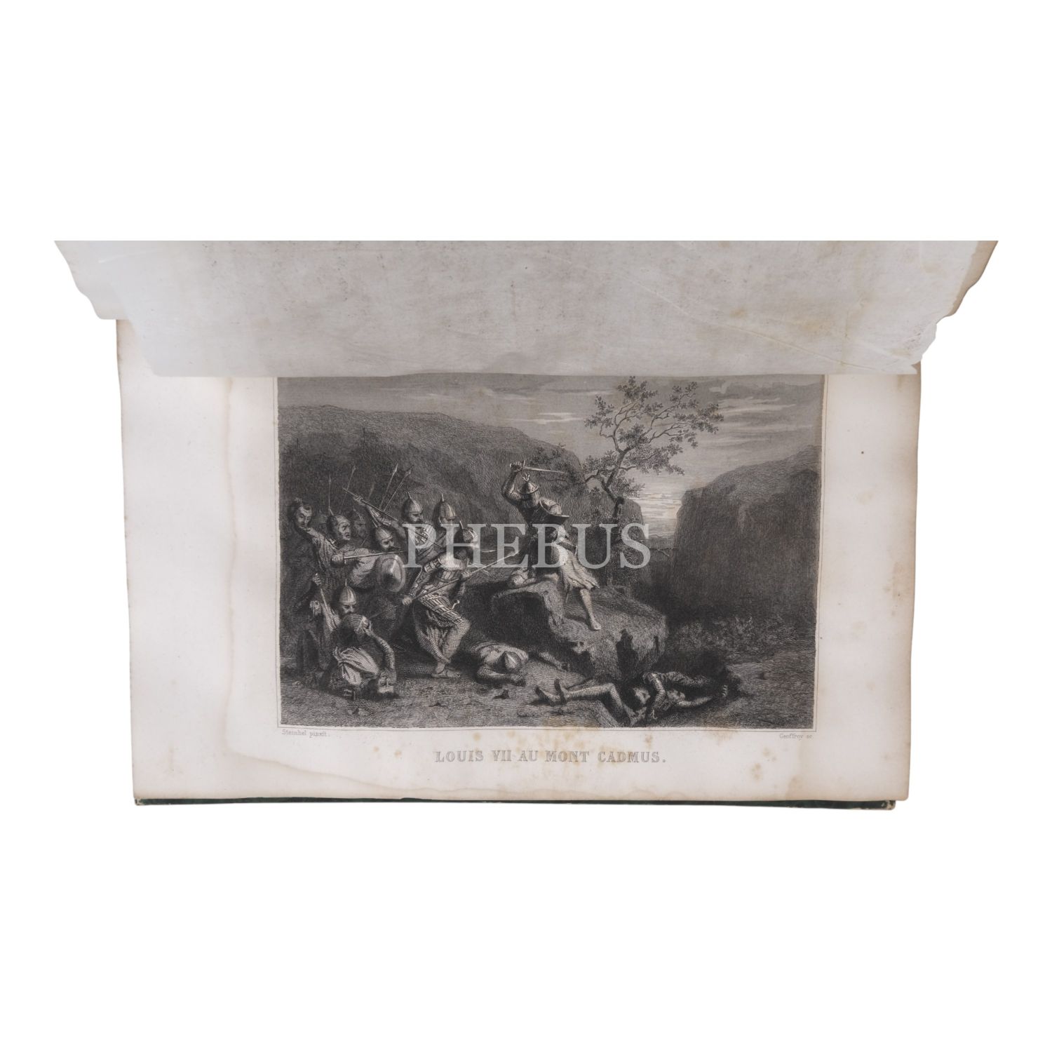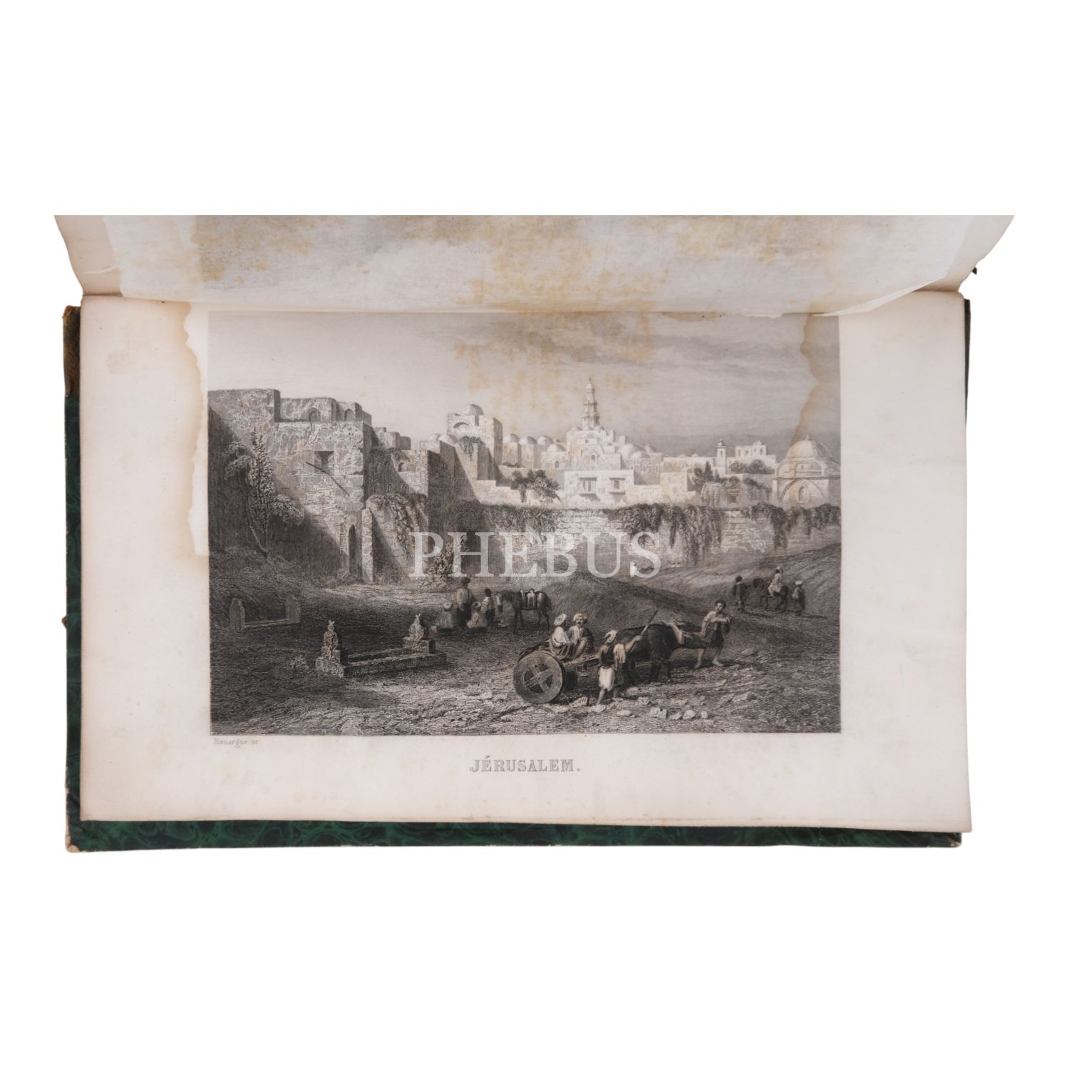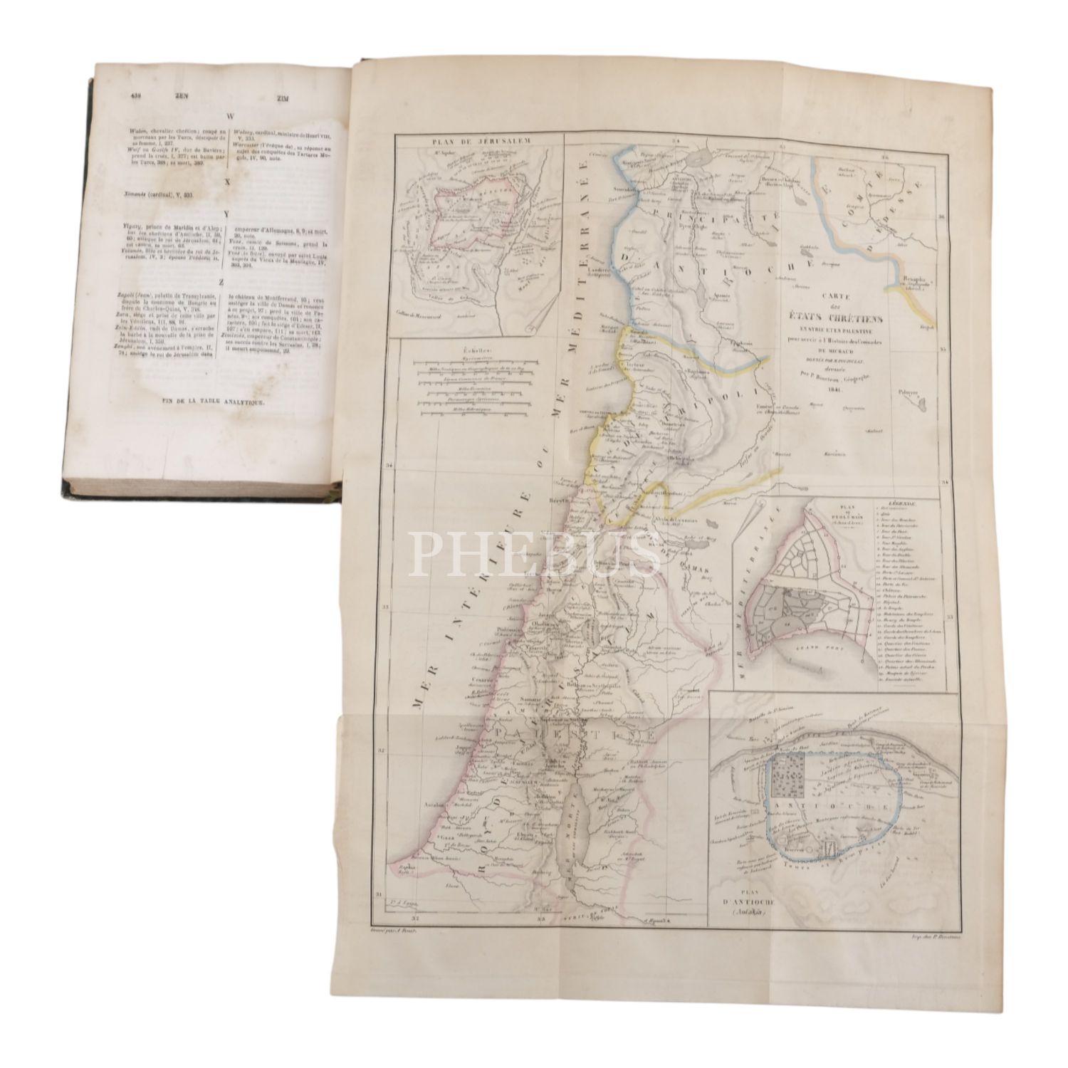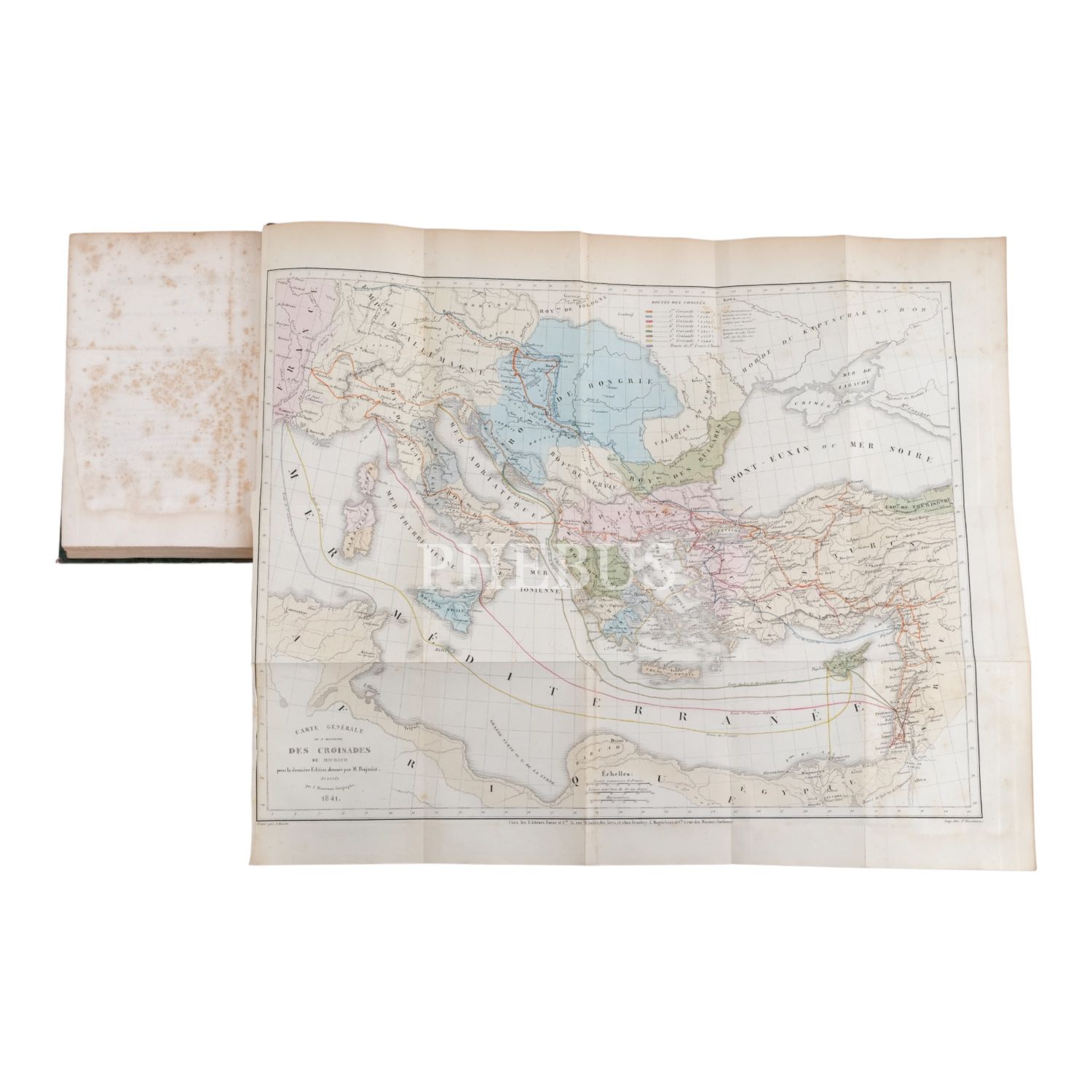 Tam sayfa gravürler ve katlanır haritalar eşliğinde kronolojik Haçlı Seferleri tarihi... Deri sırtları panelli ve altın yaldız başlıklı, iç ve dış kapakları ebru desenli dönem ciltlerinde.