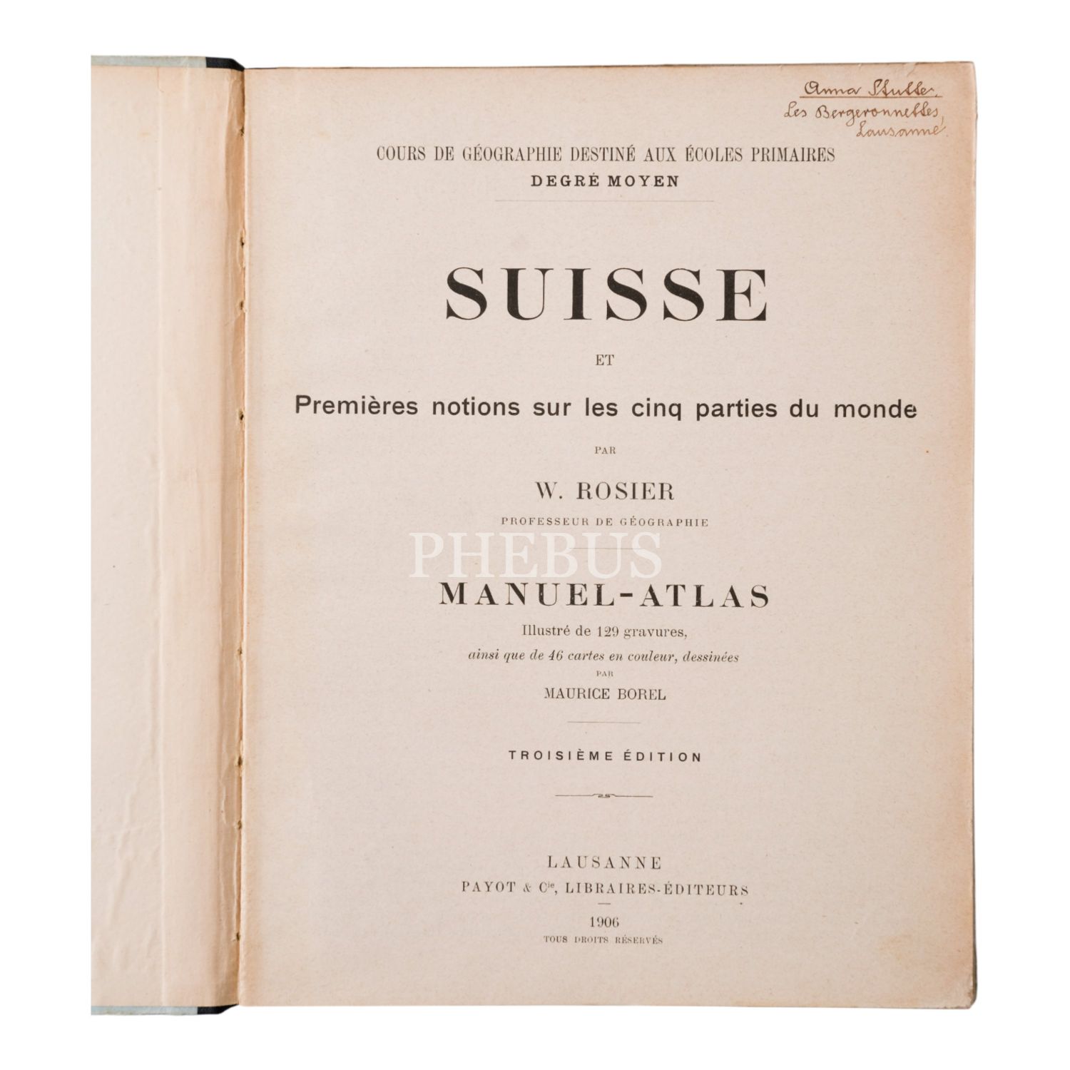 SUISSE ET PREMIERES NOTIONS SUR LES CINQ PARTIES DU MONDE, W. Rosier, 1906, Payot & Cie, Librairies - Editeurs (Lozan), 111 sayfa, 18x23 cm...