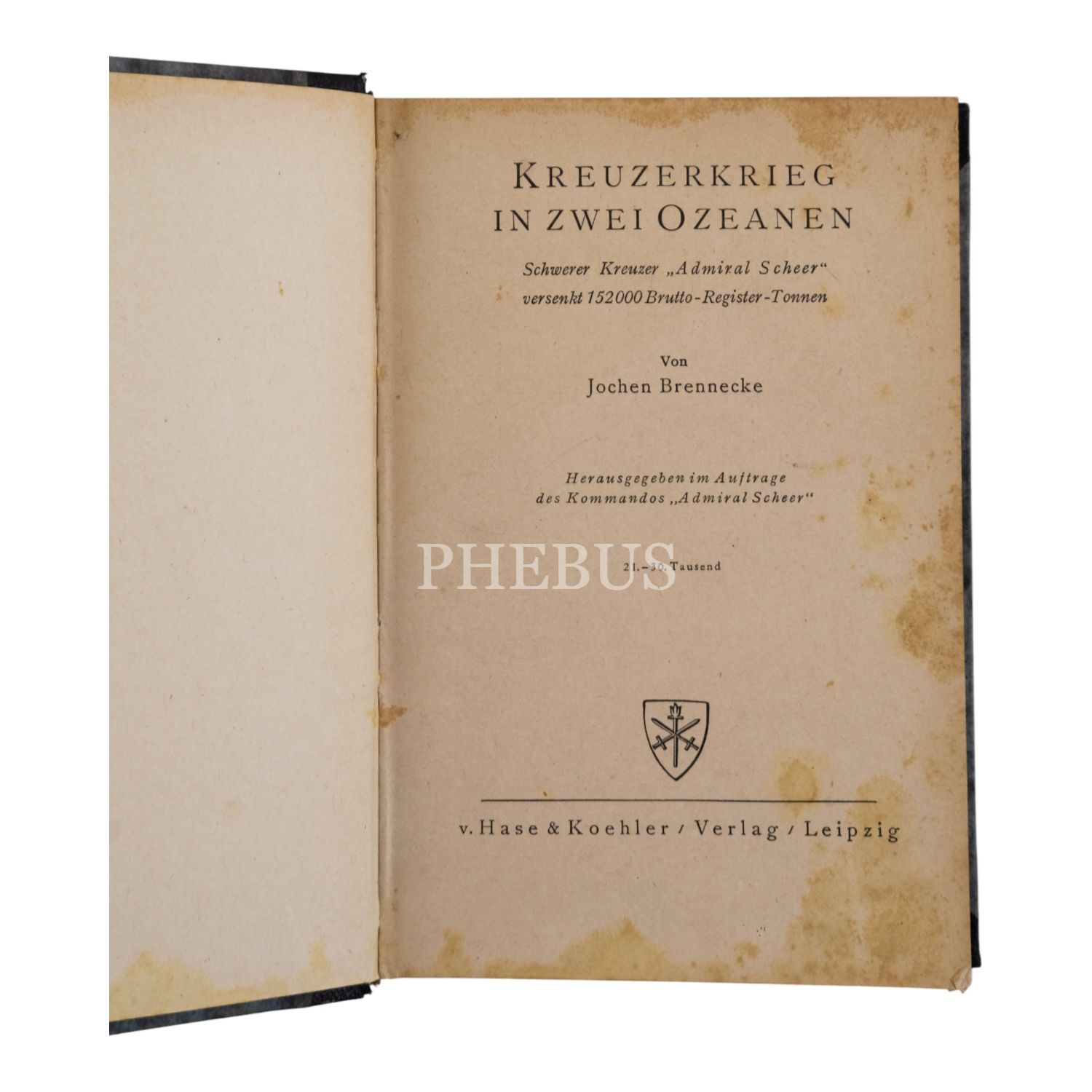 KREUZERKRIEG IN ZWEI OZEANEN, Jochen Brennecke, 1942, V. Hase & Koehler Verlag (Leipzig), 523 sayfa, 13x19 cm...