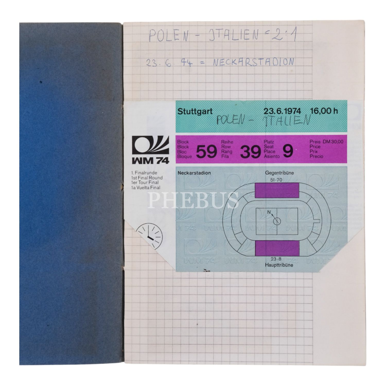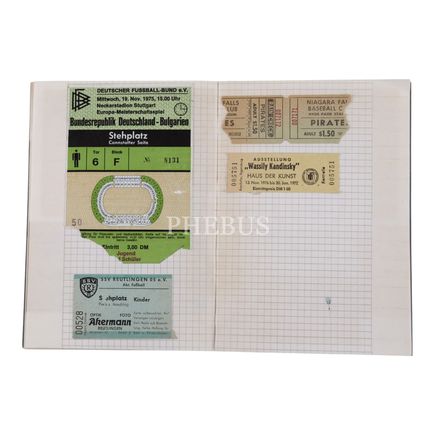 1974 Dünya Kupası'nda Stuttgart'ta oynanan Polonya'nın İtalya'yı 2 golle yendiği maçın bileti de arasında yer alan, 1974-1977 yılları arasında Almanya´da düzenlenen tenis maçlarının biletlerini (31 adet) içeren koleksiyon defteri, 15x21 cm...