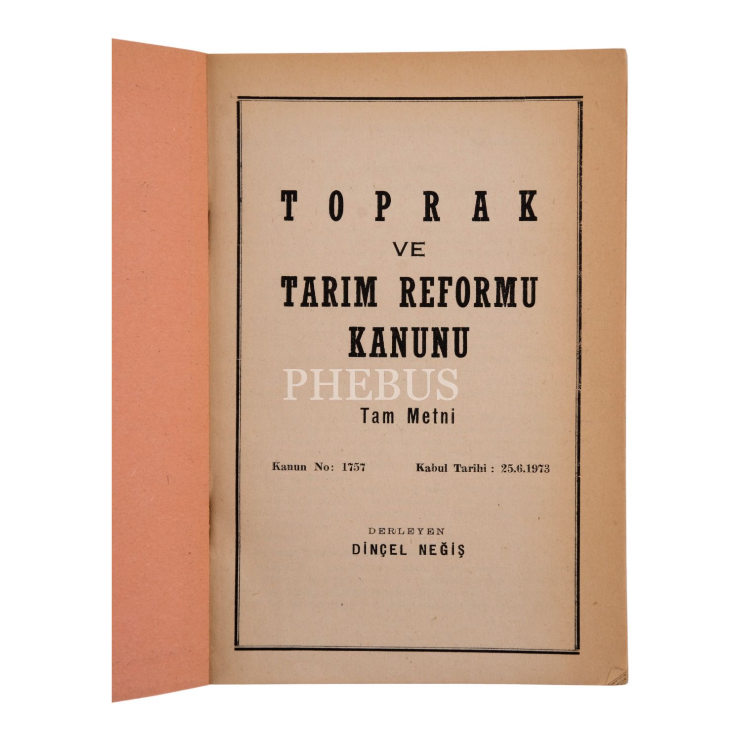 TOPRAK VE TARIM REFORMU KANUNU (Tam Metni / Kanun No: 1757 - Kabul Tarihi: 25.6.1973), (derleyen: Dinçel Neğiş), Gürsoy Matbaacılık Sanayi, 87 sayfa, 14x20 cm...