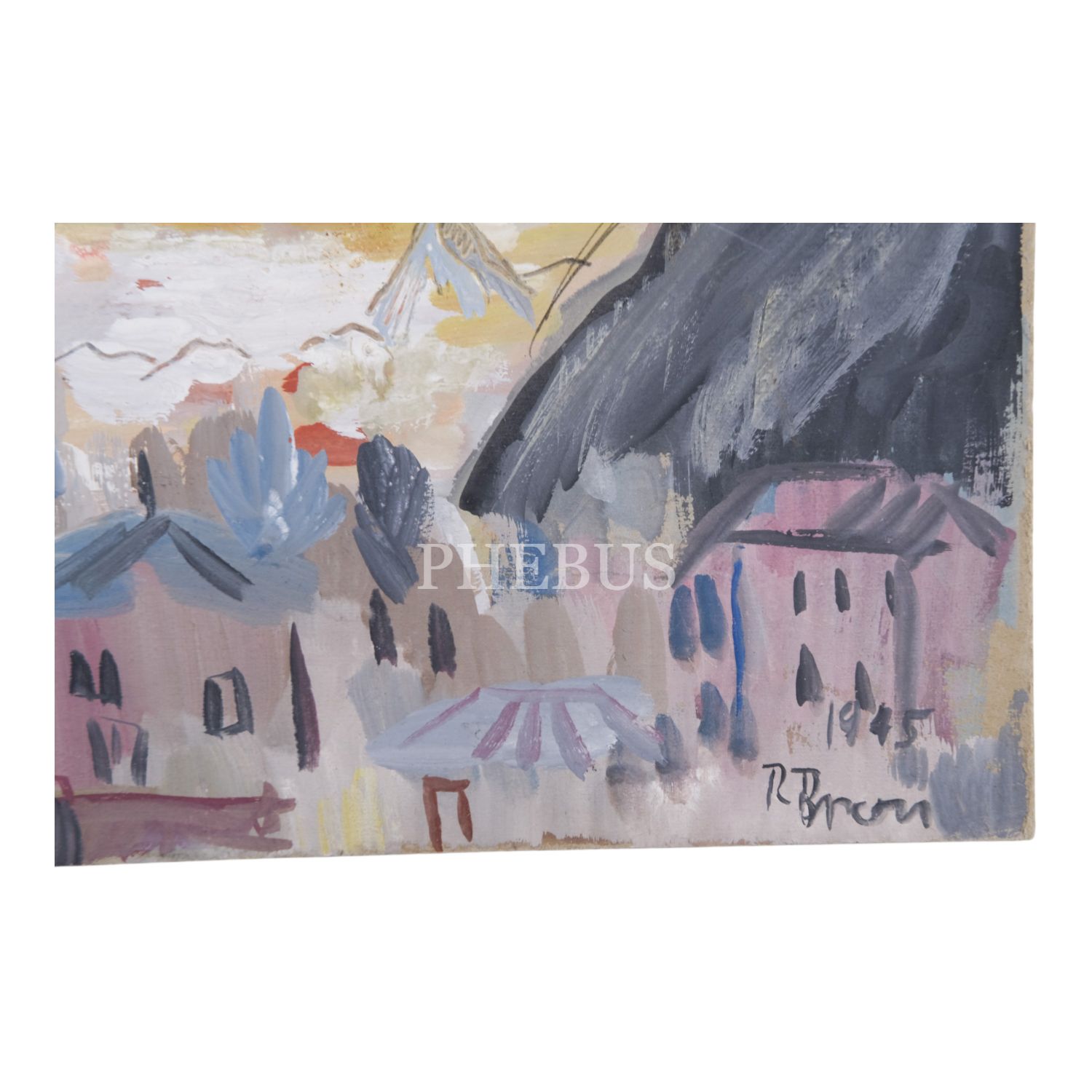 "R. Brosi 1945" imzalı, duralit üzerine guaj boya şehir manzarası, 29x22 cm...