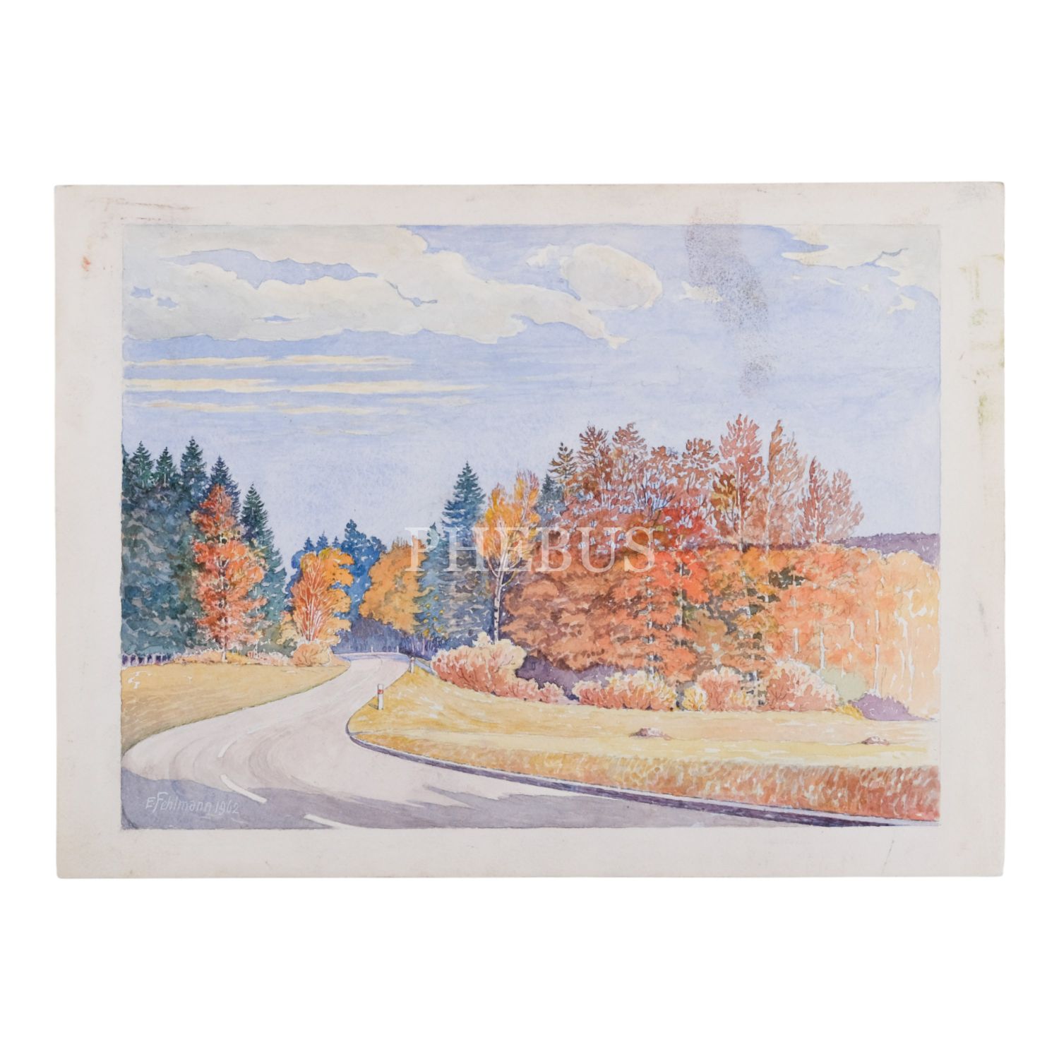 "E. Fehlmann" imzalı ve 1962 tarihli, kâğıt üzerine sulu boya peyzaj, 37x27 cm...