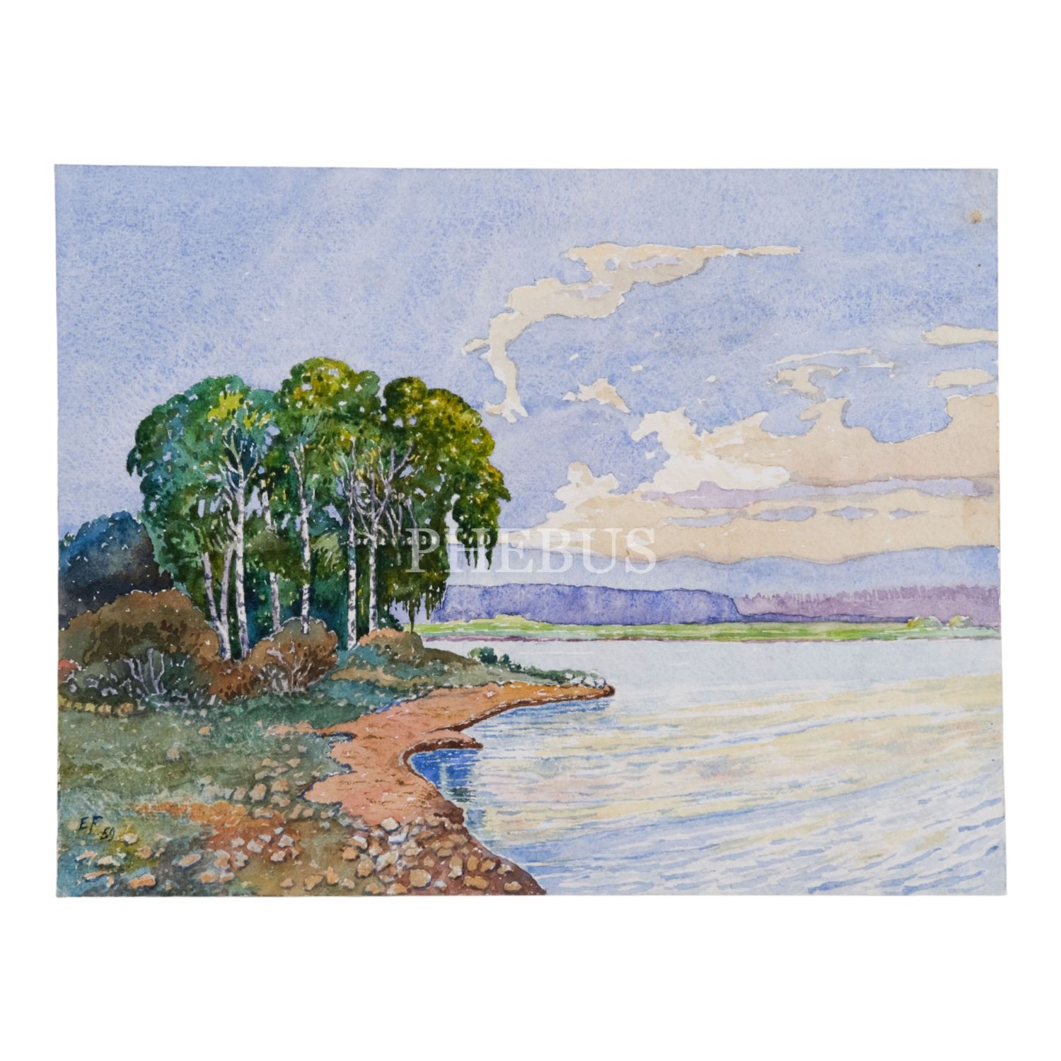 "E. F." (E. Fehlmann) imzalı ve 1959 tarihli, kâğıt üzerine sulu boya peyzaj, 29,5x23 cm...