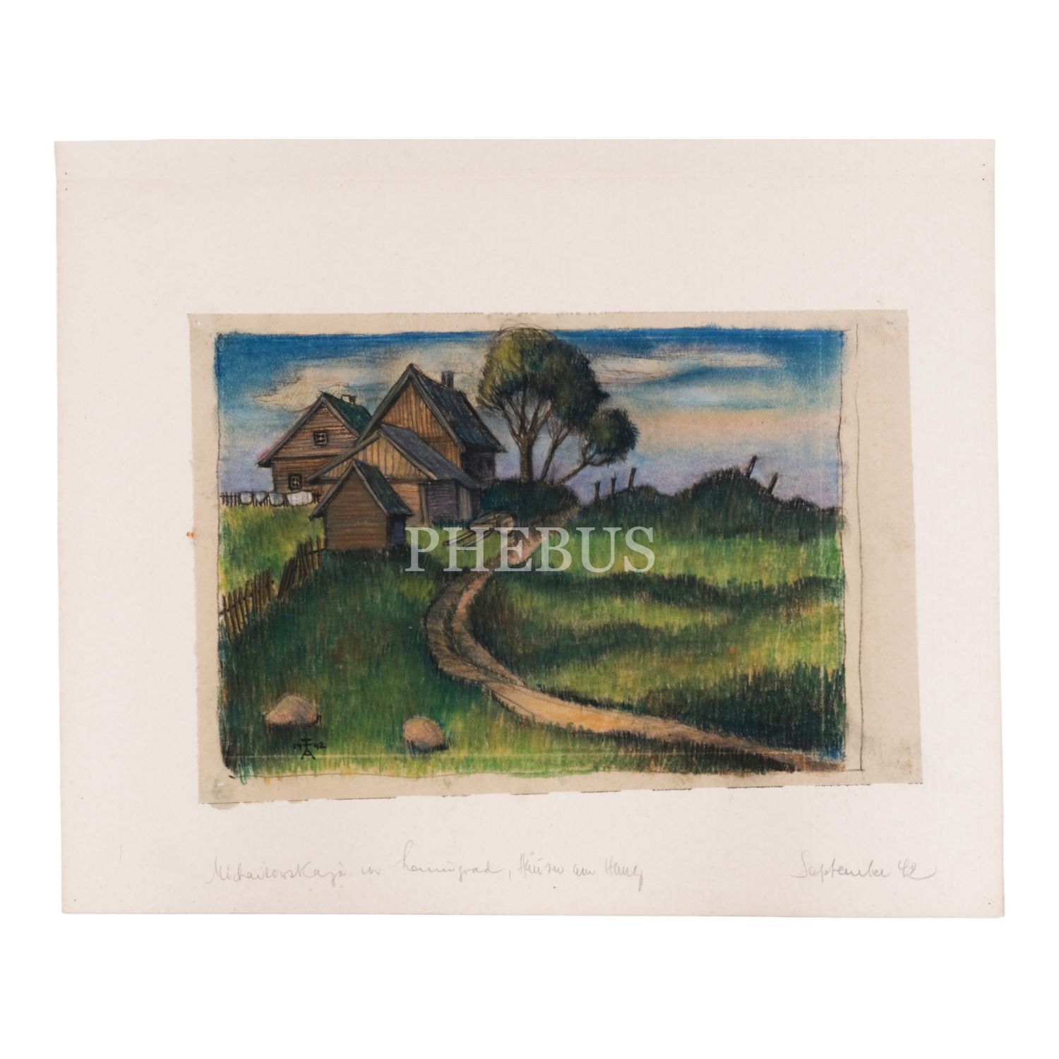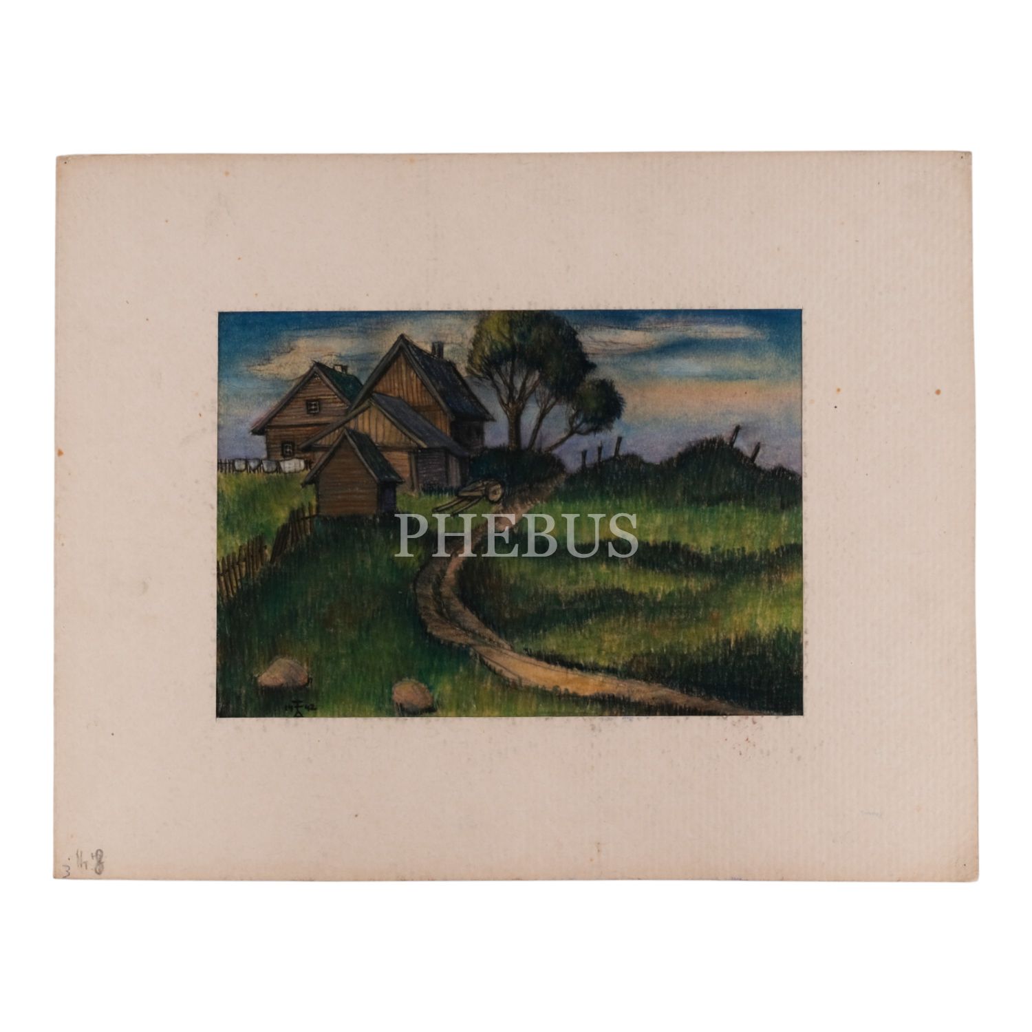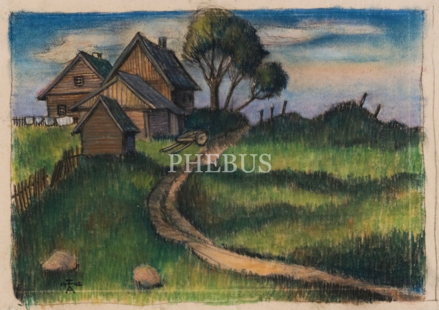 "FA" imzalı ve Eylül 1942 tarihli, kâğıt üzerine kuru boya ev resmi, paspartulu, resim 34x22 cm, paspartu 45x35 cm...