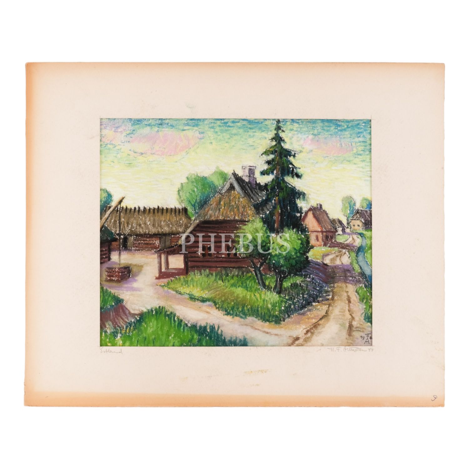 "FA" imzalı ve 1944 tarihli, kâğıt üzerine pastel boya kasaba resmi, paspartulu, resim 31x24 cm, paspartu 43x35 cm...