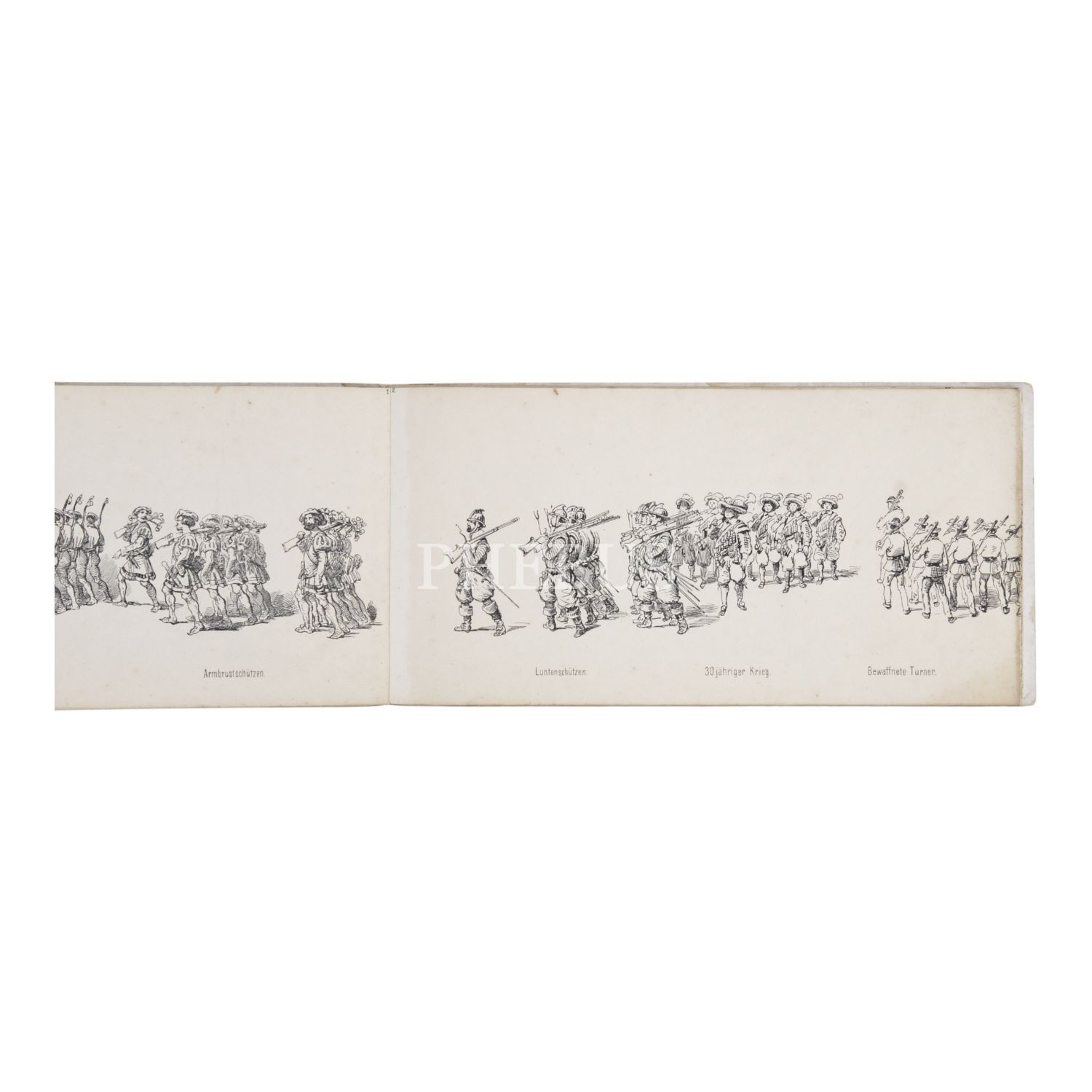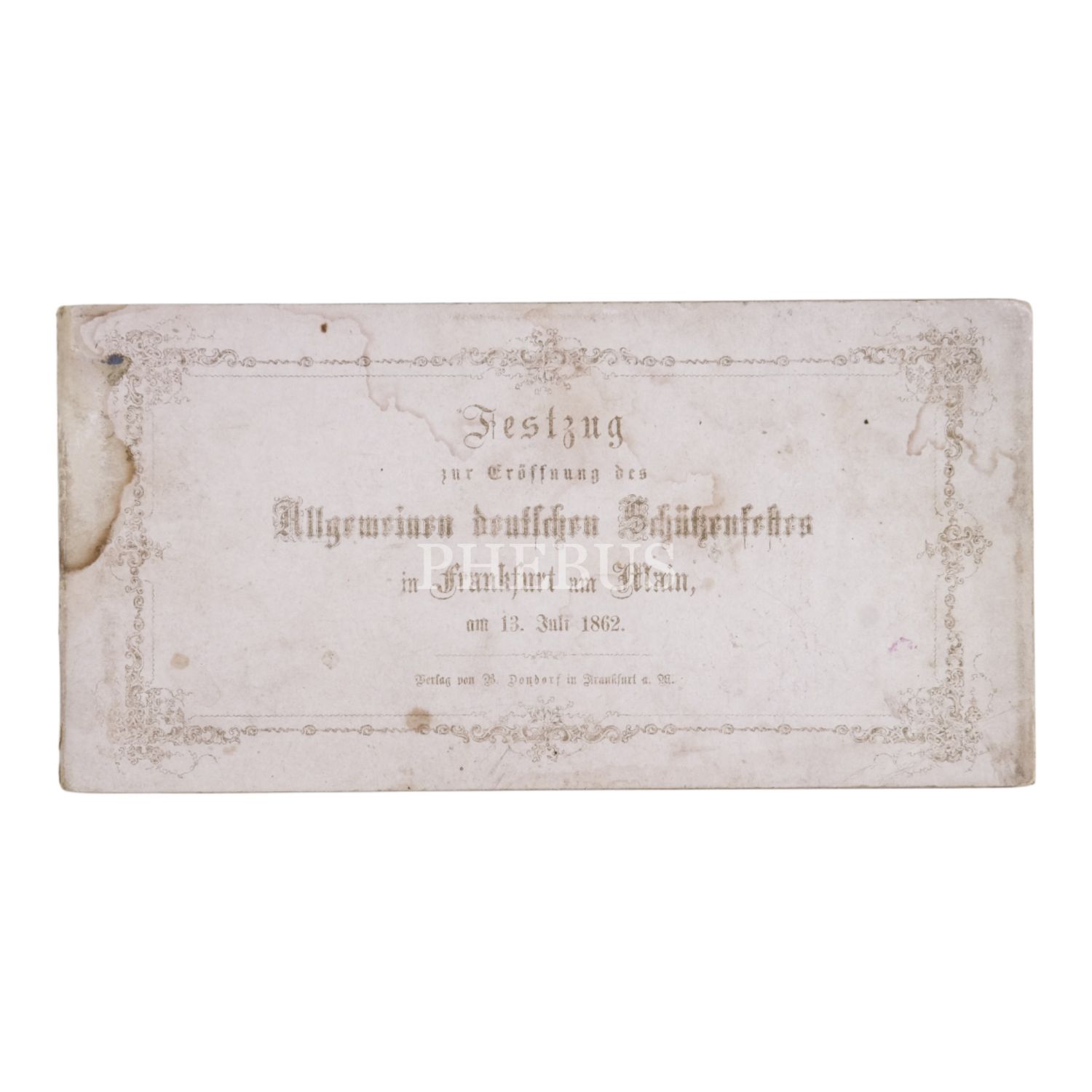 13 Temmuz 1862 tarihinde Frankfurt´ta düzenlenen Alman Atıcılık Festivali´nin açılış töreni geçit töreninin tasvir edildiği panoramik gravür: "Festzug zur Eröffnung des ALLGEMEINEN DEUTSCHEN SCHÜTZENFESTES in Frankfurt am Main, am 13 Juli 1862", açık halde 229x11,5 cm, kapalı halde 23,5x12 cm...