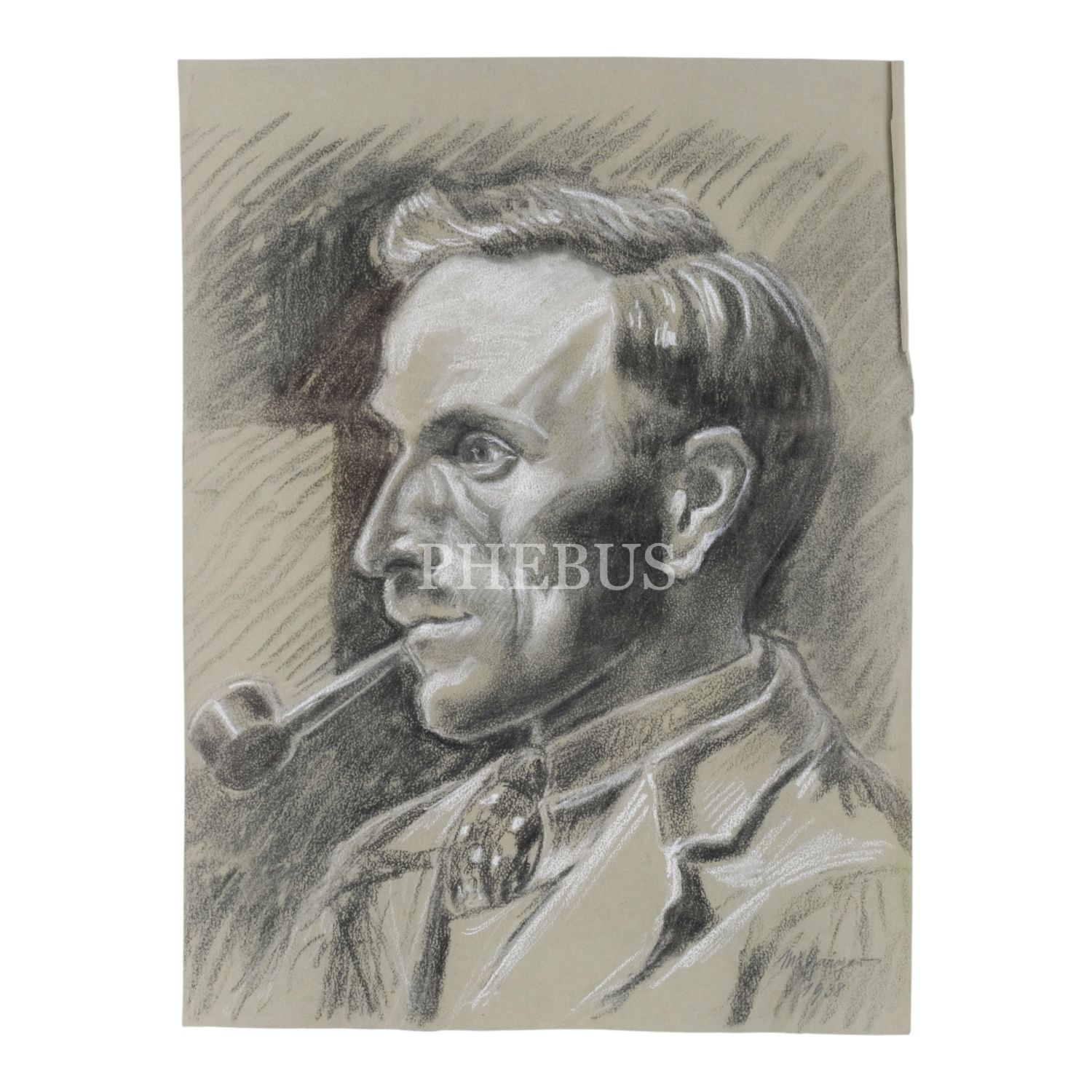 Sanatçı imzalı ve 1938 tarihli, kâğıt üzerine kara kalem erkek portresi, 34x45 cm...