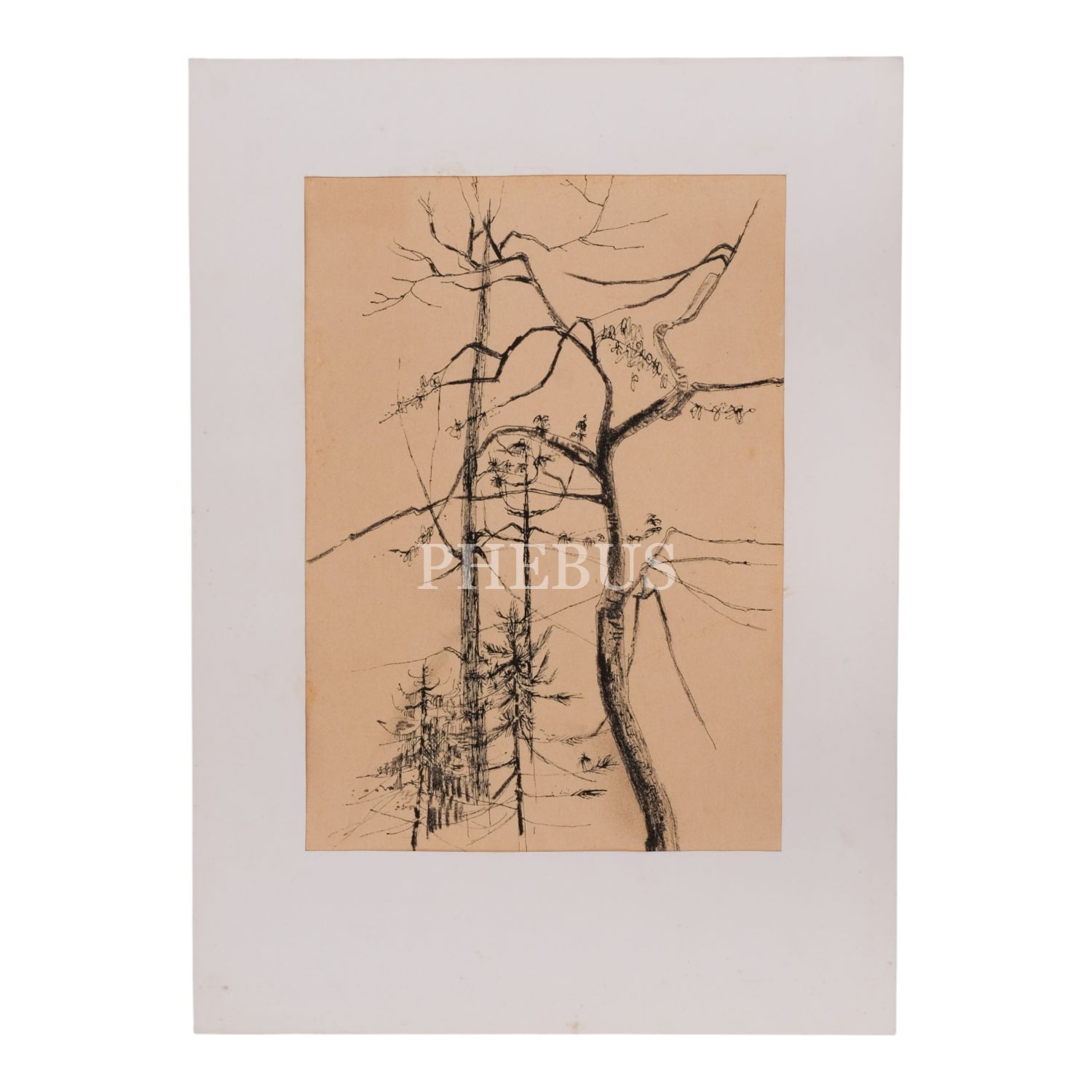 Kâğıt üzerine mürekkeple çizilmiş peyzaj resmi, 24x34 cm...