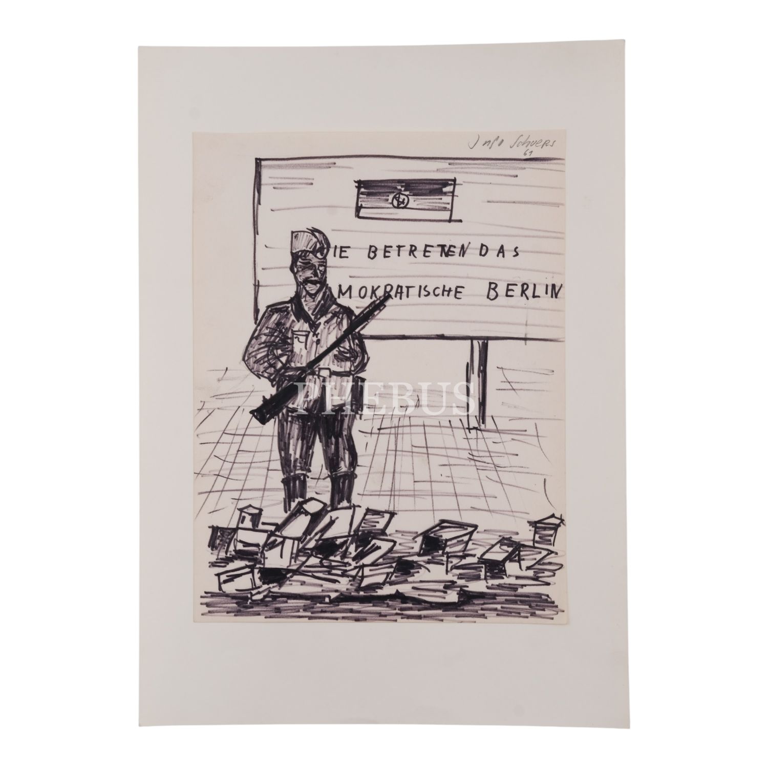 Sanatçı imzalı, Berlin Duvarı önünde nöbet tutan bir askerin tasvir edildiği ve "Sie Betreten Das Demokratische Berlin" (Demokratik Berlin´e Giriyorsunuz) yazılı tabelanın görüldüğü resim, 1961, 24x32 cm...