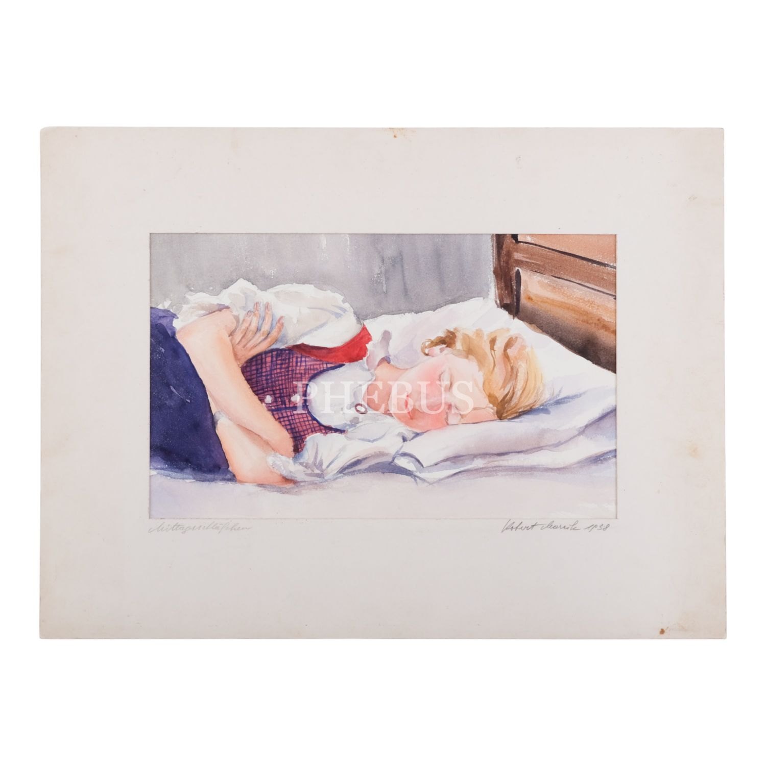 Sanatçı imzalı ve 1938 tarihli uyuyan kadın resmi, kâğıt üzerine sulu boya, paspartulu, resim 34x24 cm, paspartu 44x33 cm...