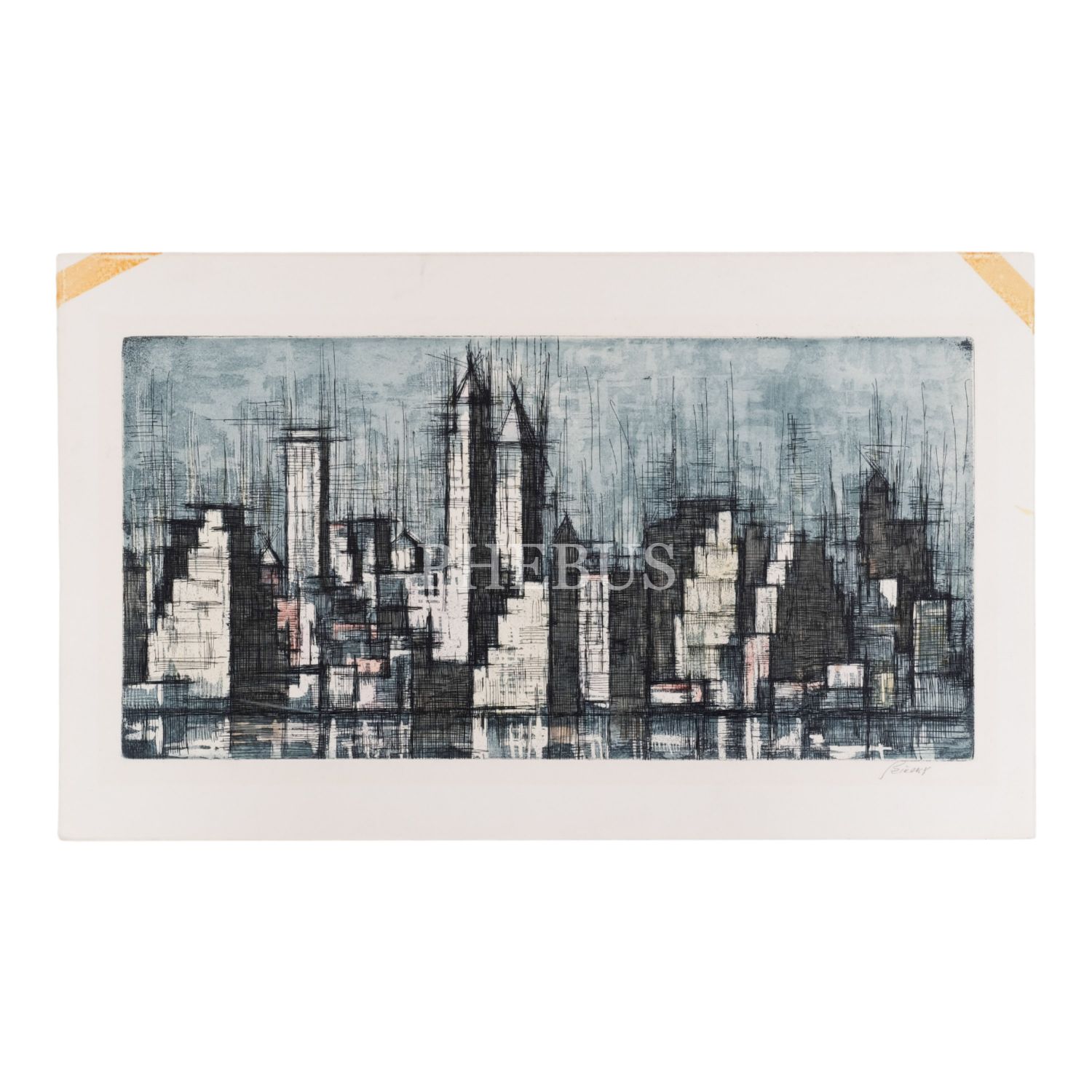 Sanatçı imzalı ve bir nehir kenarındaki şehrin tasvir edildiği gravür, 50x30 cm...