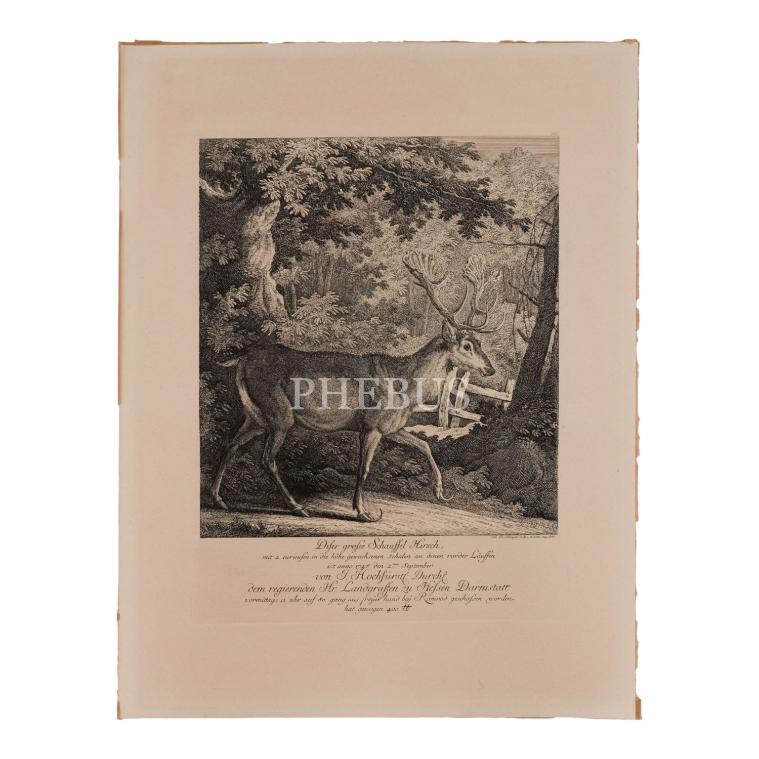 1748 yılında bir prens ya hanedan mensubu tarafından avlanmış geyiğin gravürü, 35x46 cm...