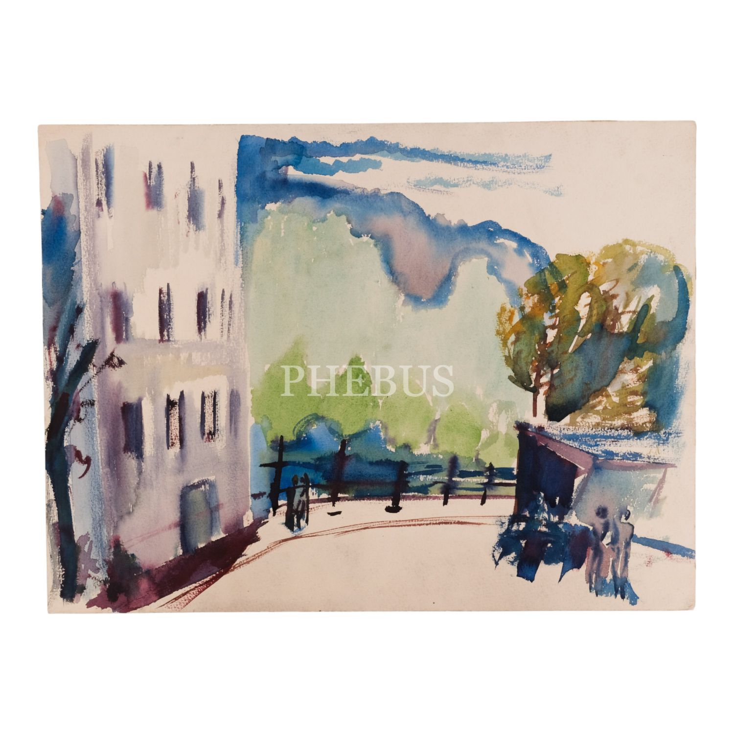 Albert Kley´den damgalı, kâğıt üzerine sulu boya sokak manzarası, 48x36 cm...