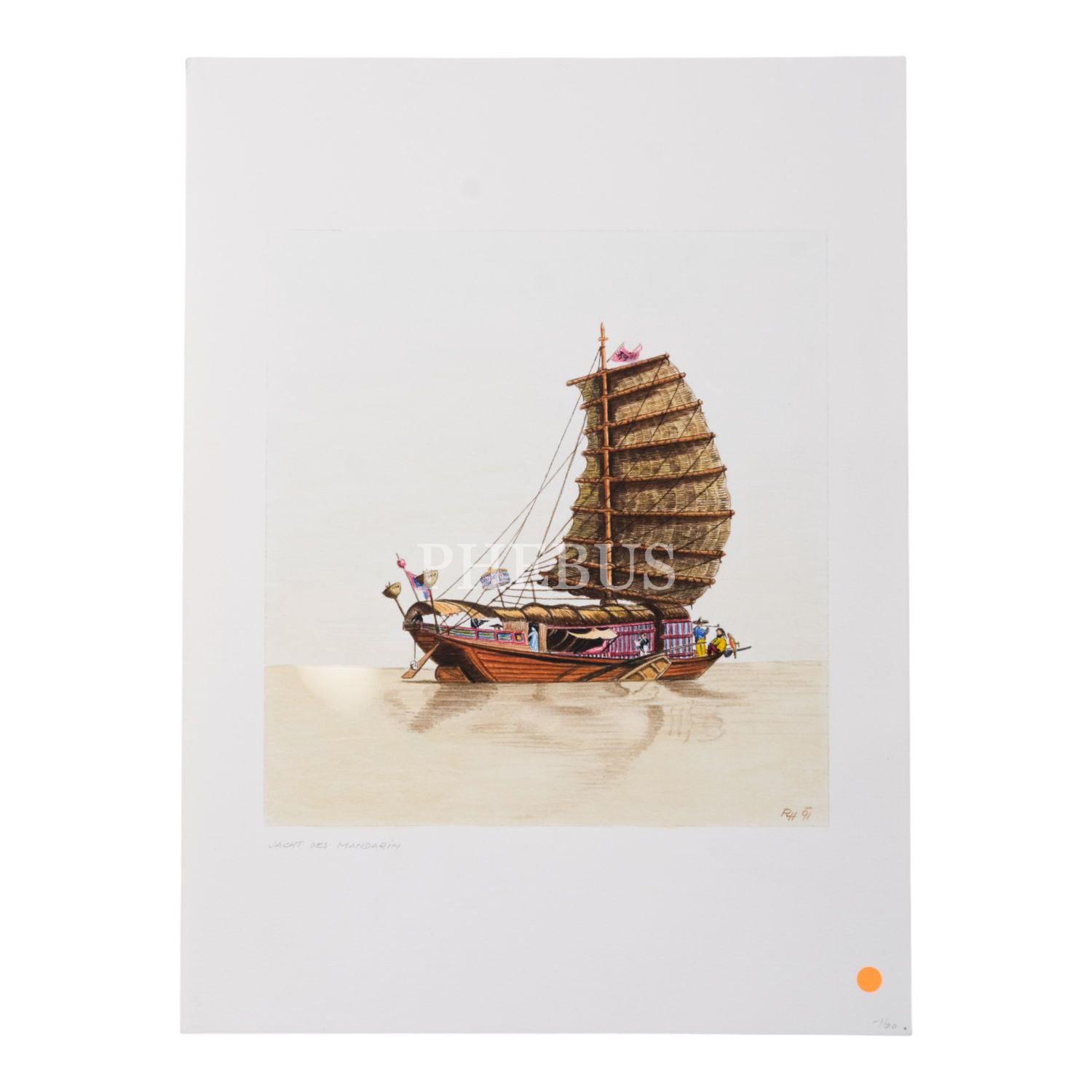 "RH ´91" imzalı, "Jacht Des Mandarin" başlıklı resim, kâğıt üzerine kuru boya, 23x31 cm...