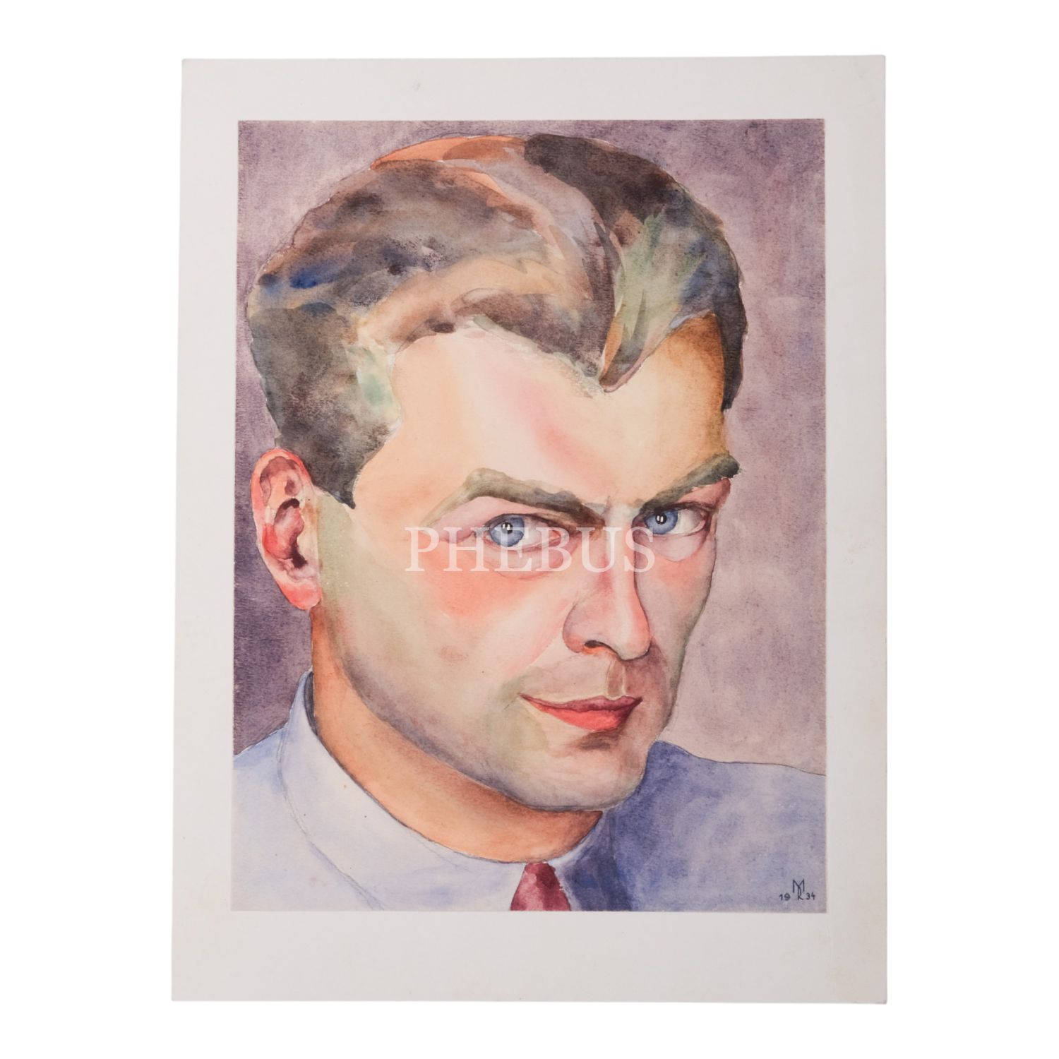 "M. R. 1934" imzalı, kâğıt üzerine sulu boya erkek portresi, kartona yapışık, resim 20x26 cm, karton 24x32 cm...