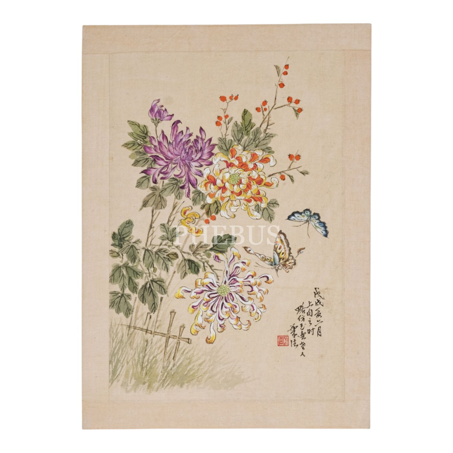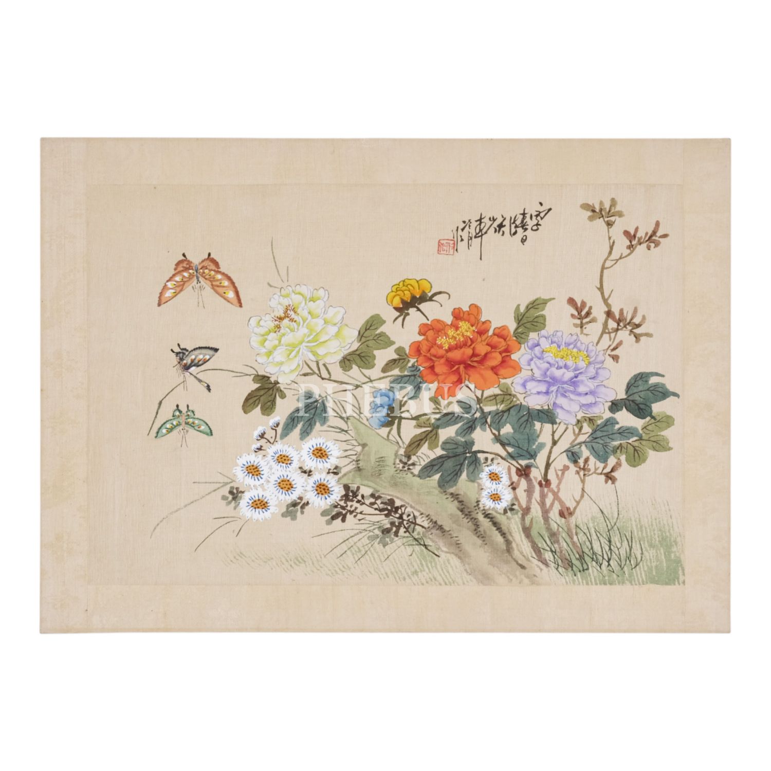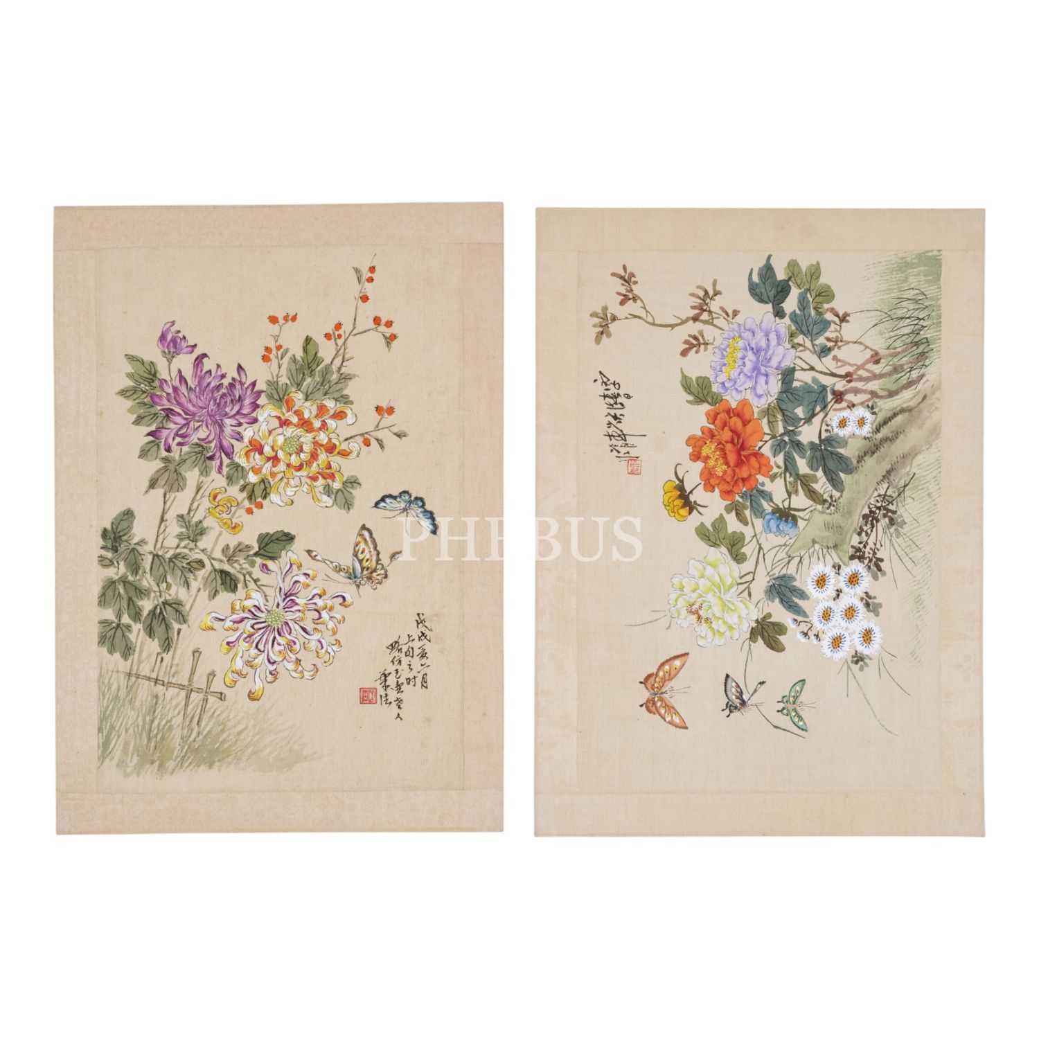 Kâğıt üzerine yedirilmiş dokuma kumaş üzerine el boyama çiçek kompozisyonları (iki adet), her ikisinin üzerinde Çince yazılar mevcut, 35,5x25,5 cm...