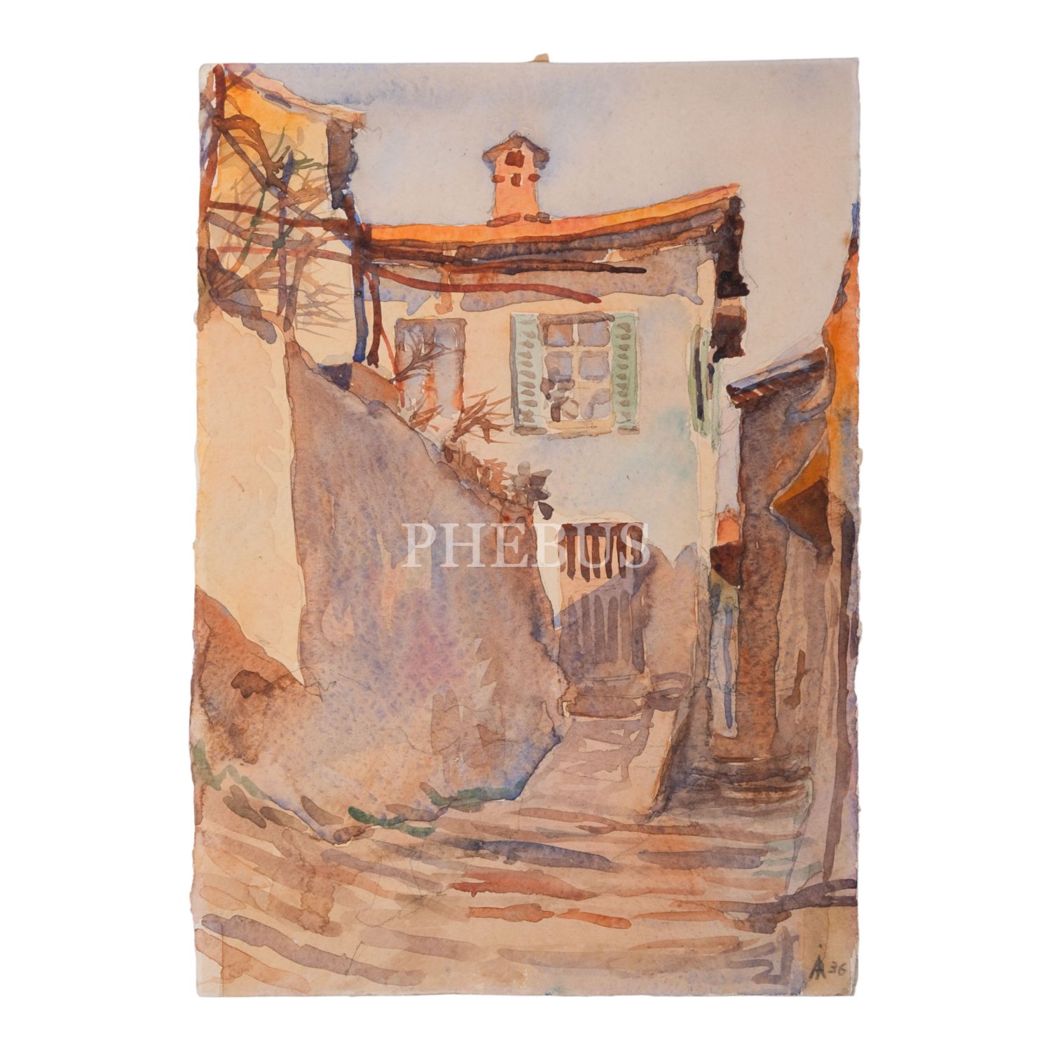 "A 36" imzalı, kâğıt üzerine sulu boya sokak manzarası resmi, 26x36 cm...
