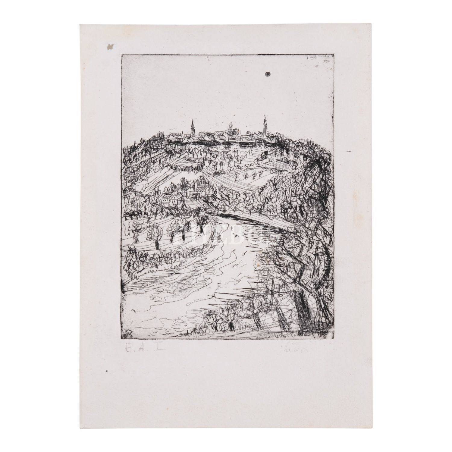 "E. A. I.." ibareli, şehir konulu gravür, 20,5x28 cm...