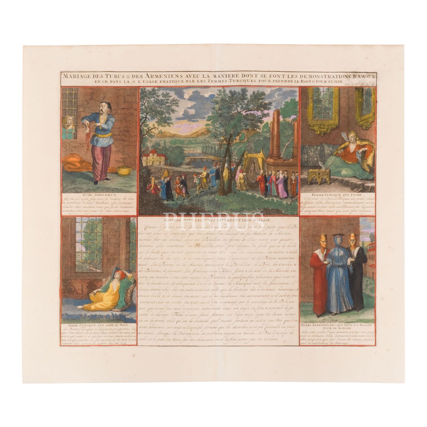 Türkler ve Ermenilerin evlilik seromonileriyle sevgi gösterilerinin açıklamalarıyla birlikte resmedildiği renkli bakır baskı gravür, "Mariage des Turcs & des Armeniens avec la maniere dont se font les demonstrations d´Amour", 1720, Amsterdam, 51x45 cm...