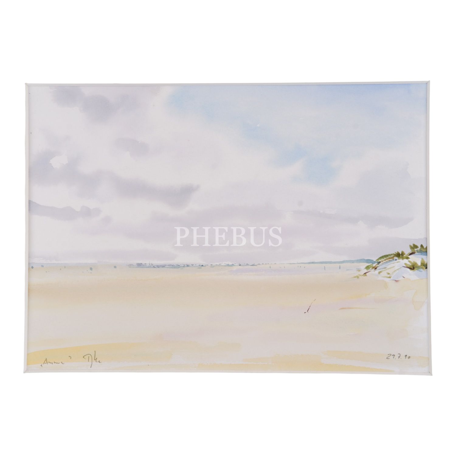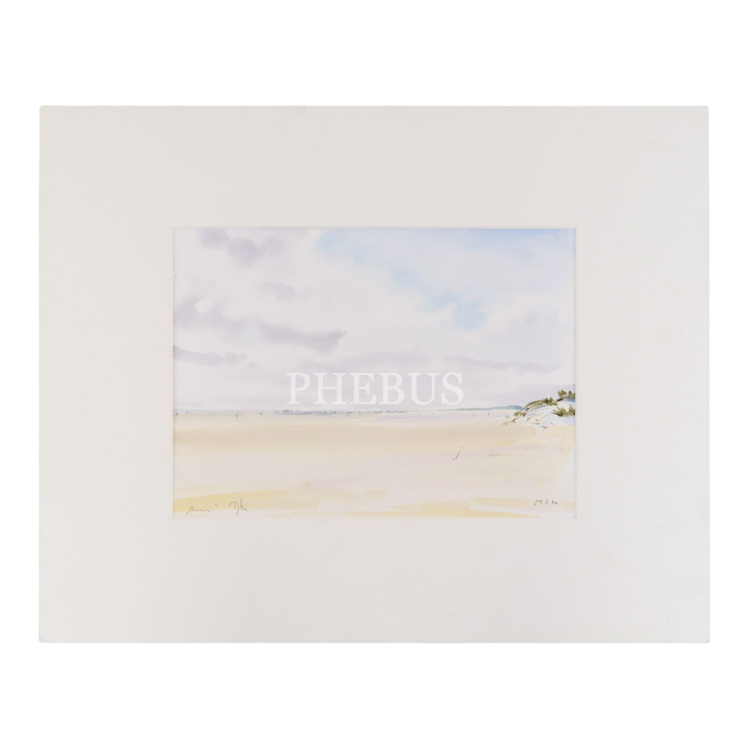 Sanatçı imzalı ve 29 Temmuz 1990 tarihli, kâğıt üzerine sulu boya plaj resmi, paspartulu, resim 32x24 cm, paspartu 50x40 cm...