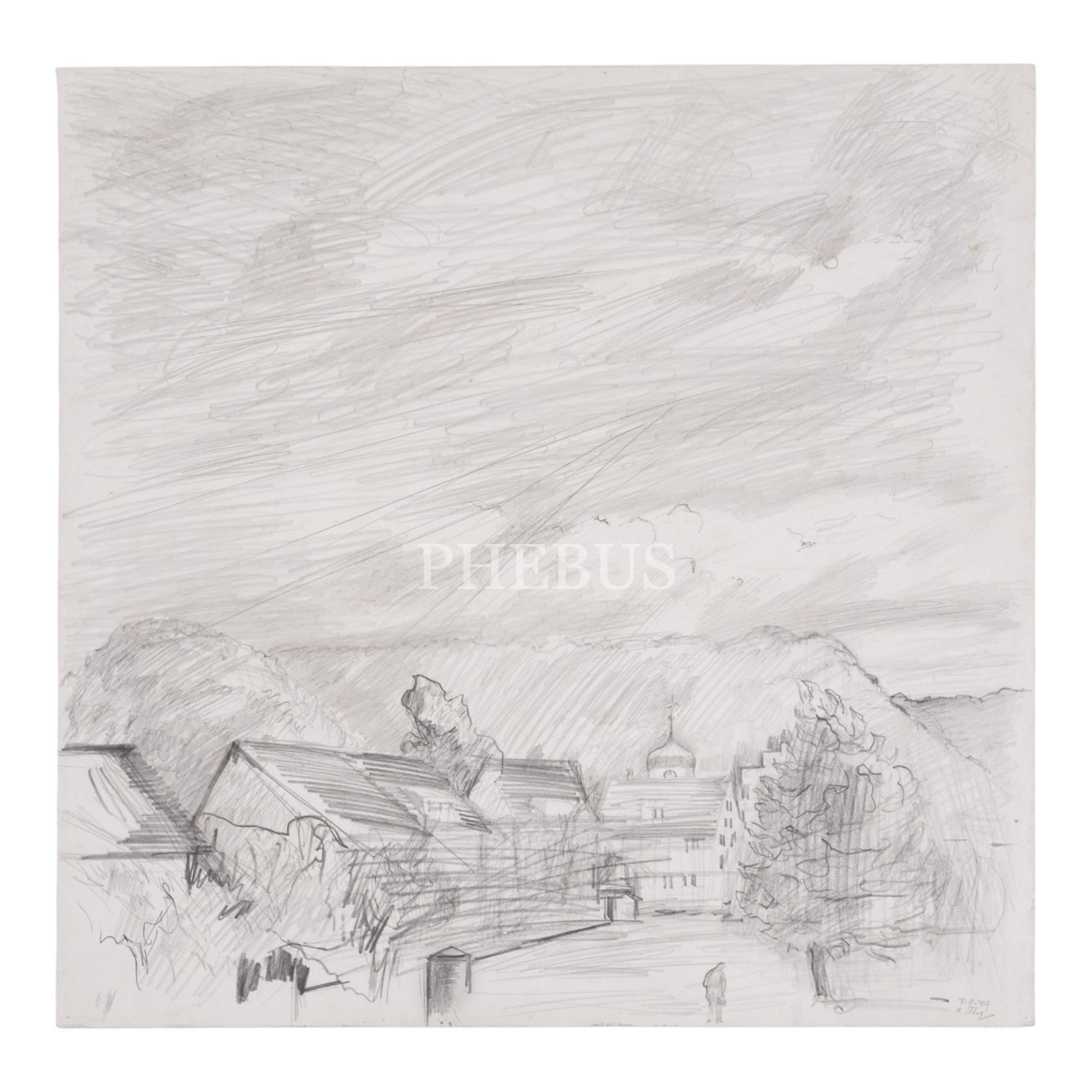 Sanatçı imzalı ve 7 Ağustos 1979 tarihli, kâğıt üzerine karakalem şehir eskizi, 50x49 cm...