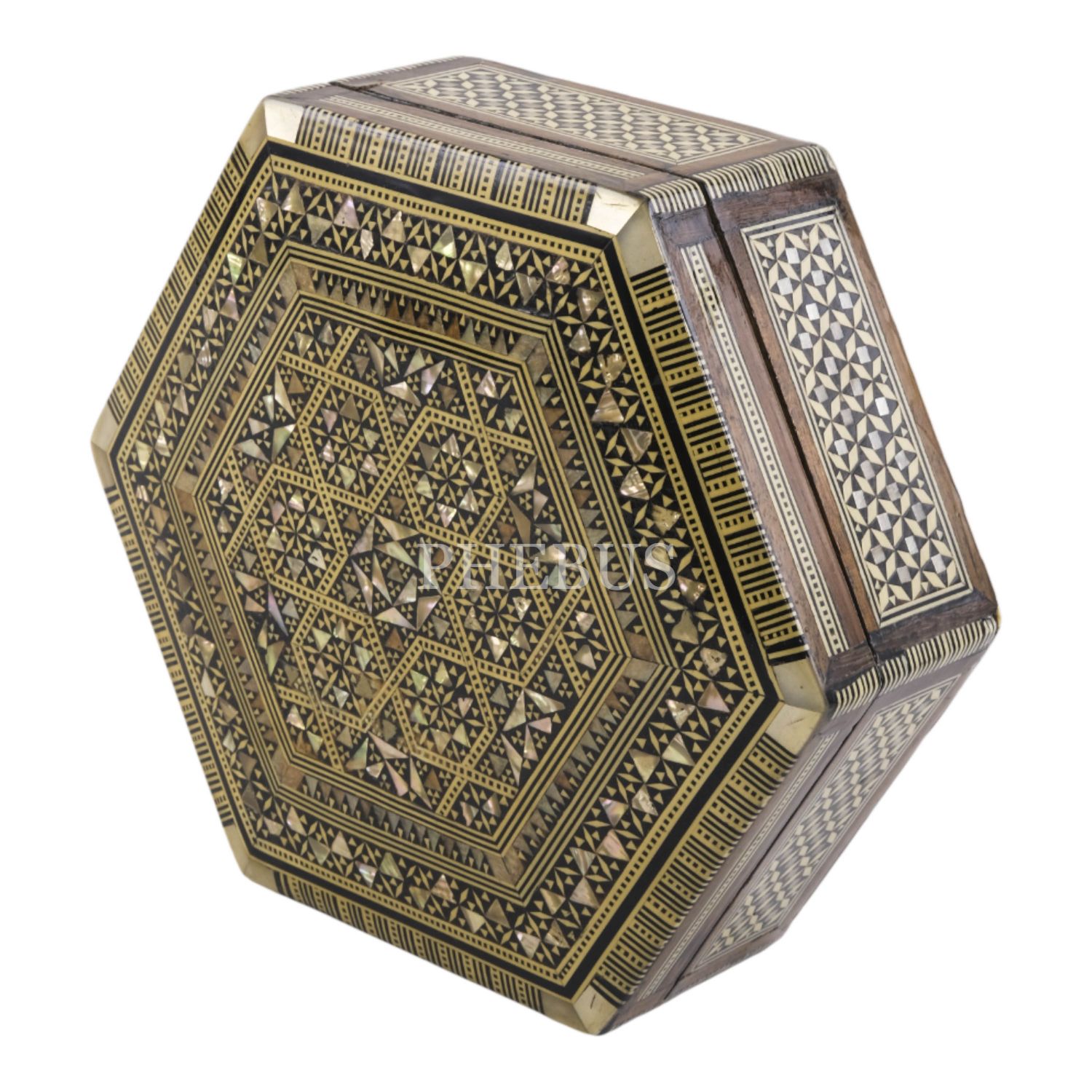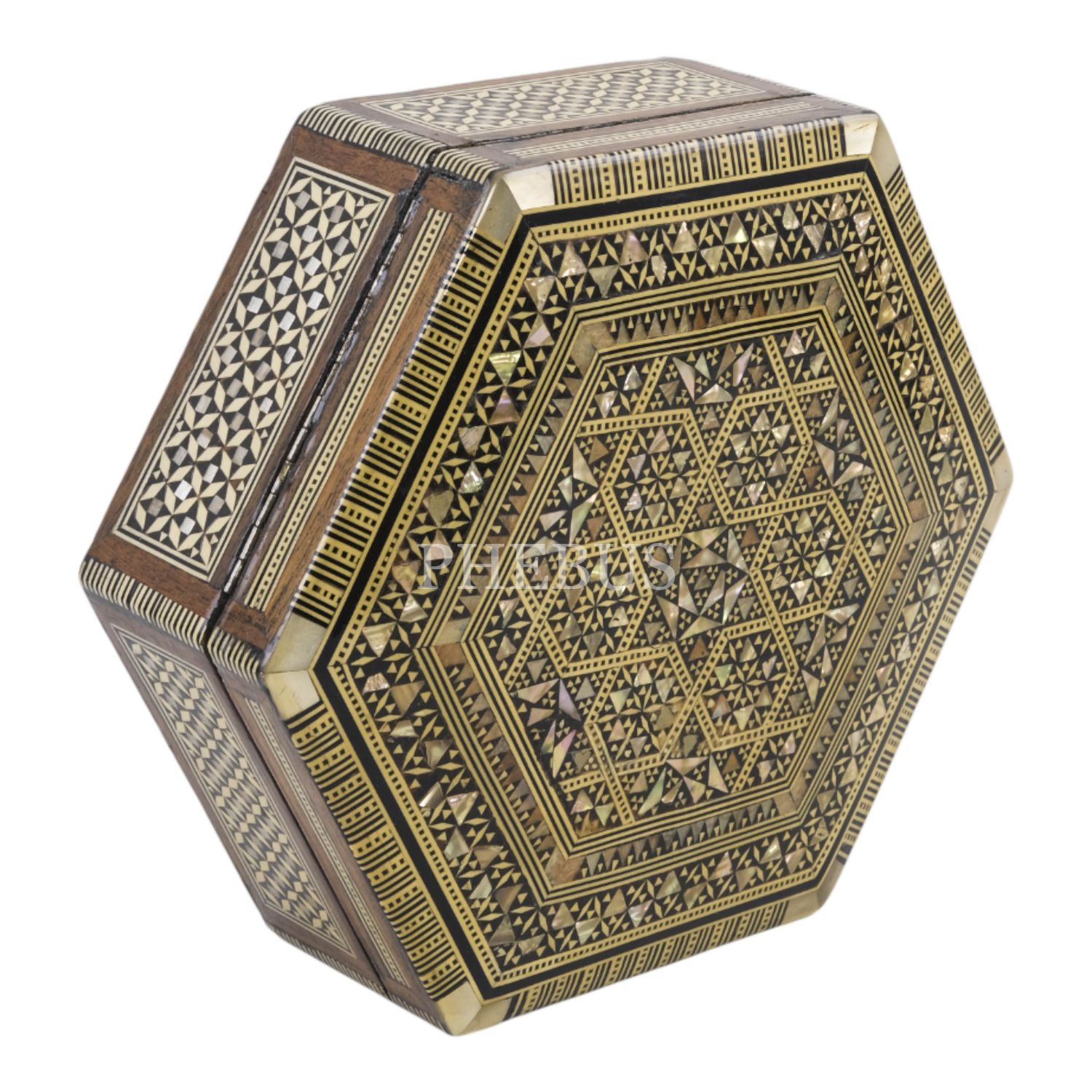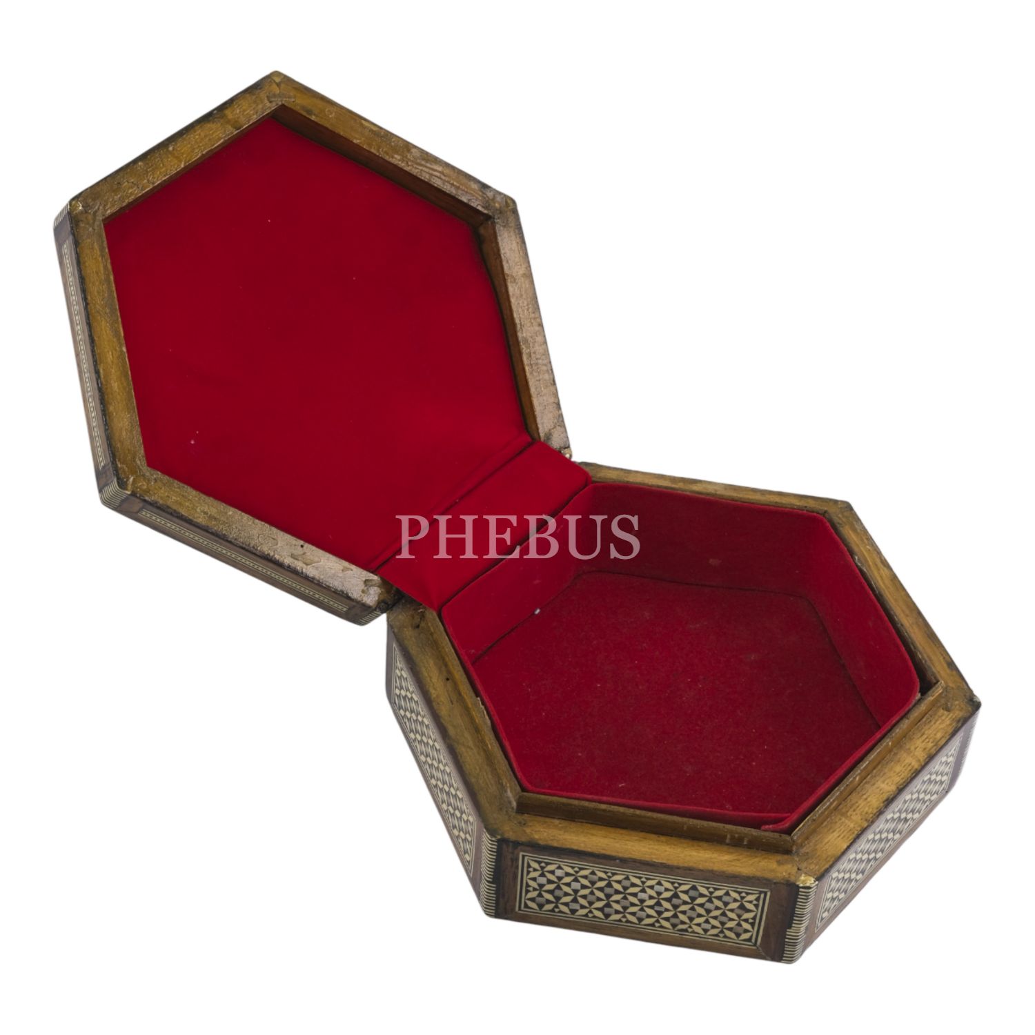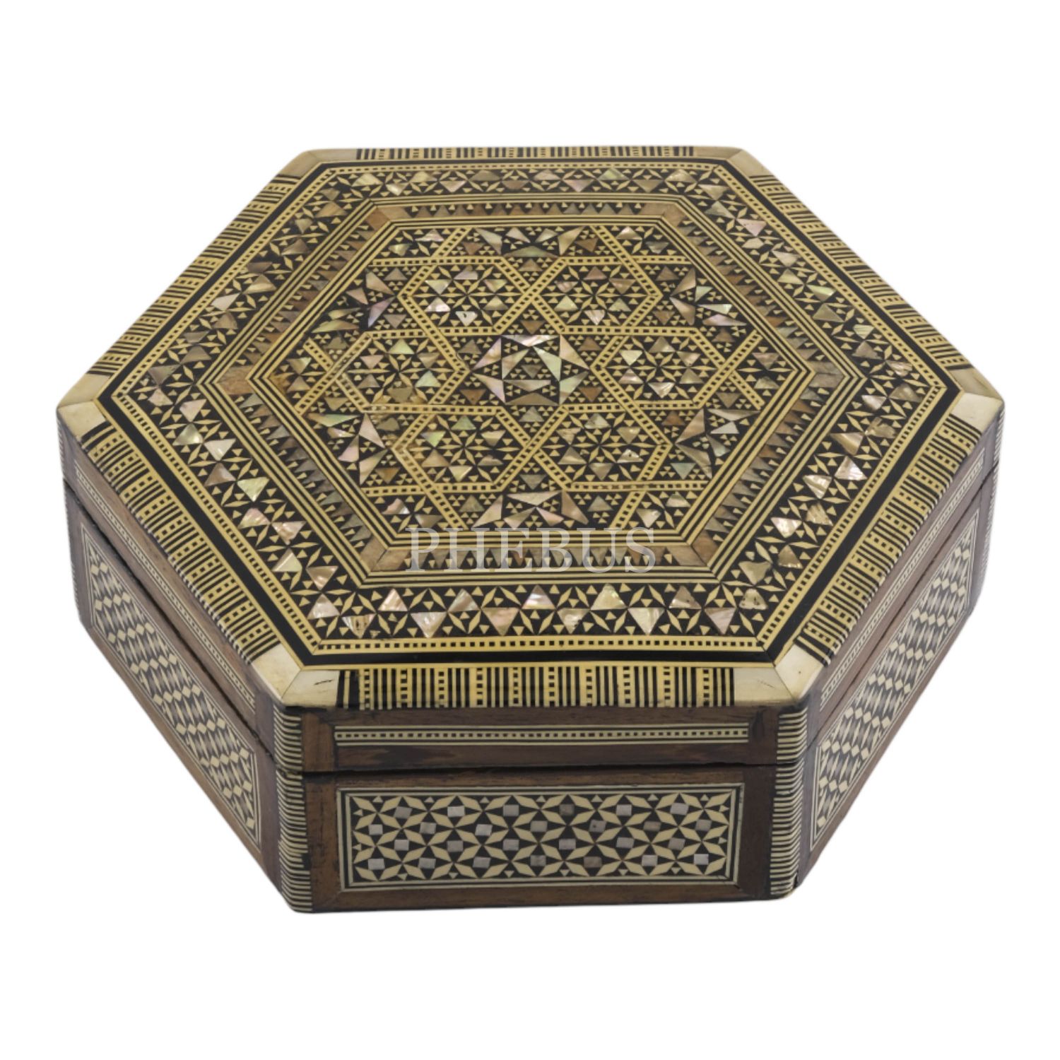 Sedef işçilikli, altıgen formda ahşap kutu, içi kadife kaplı, 21,5x19x7 cm...