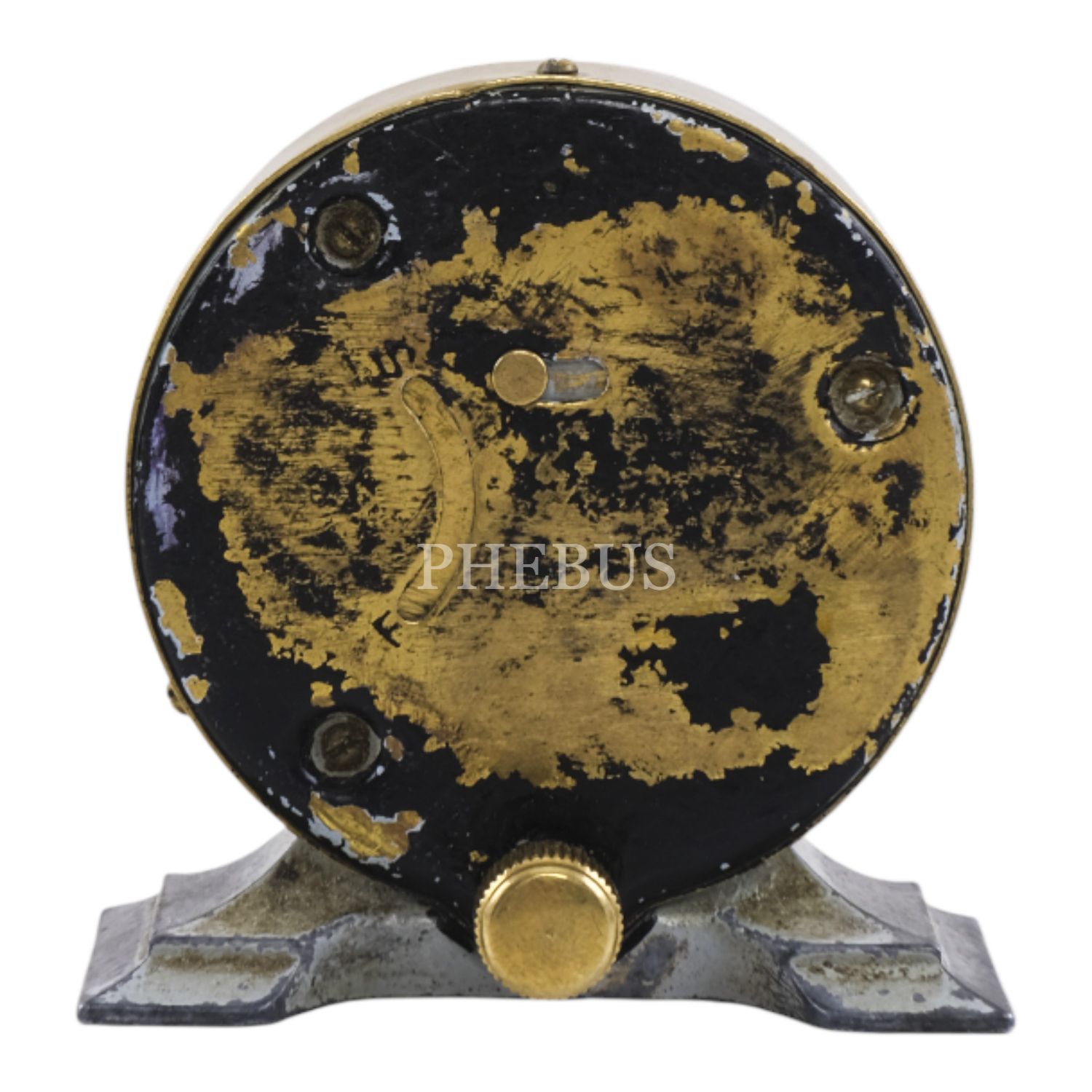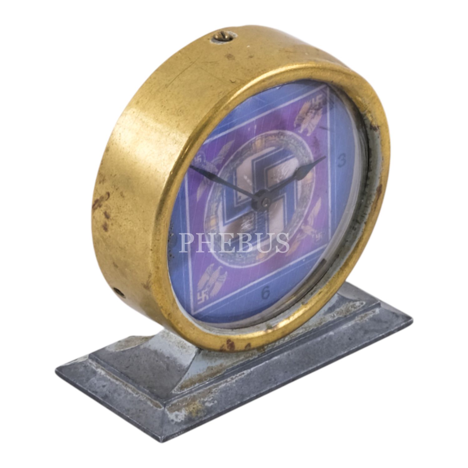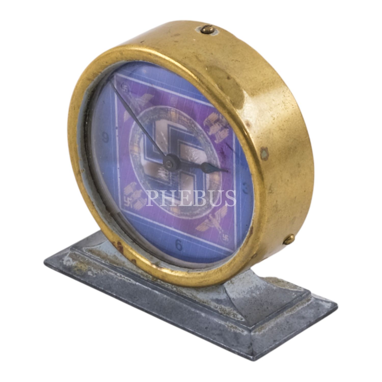 Nazi Almanyası döneminden, kadranı gamalı haç görselli, pirinç çerçeveli minyatür masa saati (kurmalı), kadran çapı 5,5 cm...