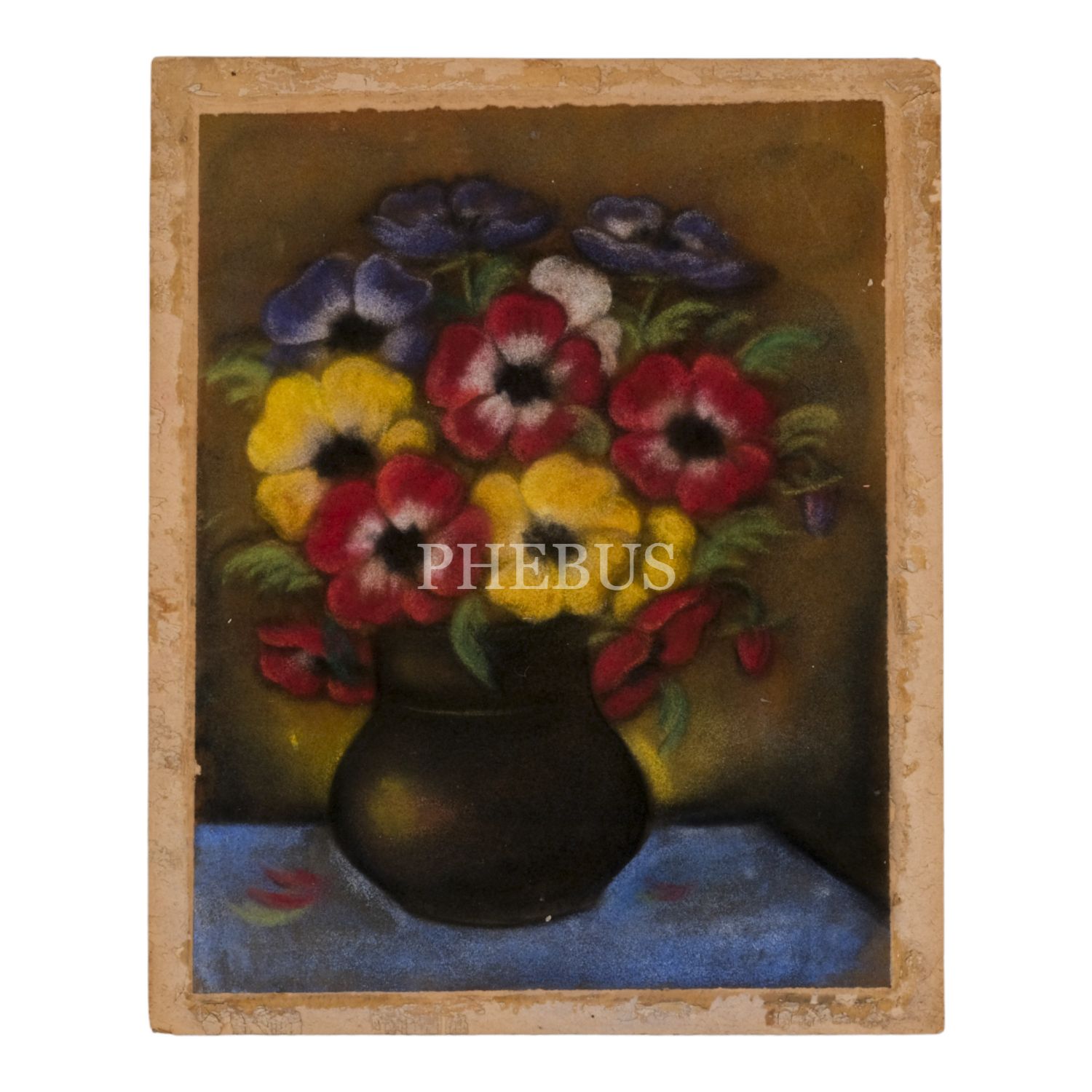 Kadife kumaş üzerine el boyama natürmort, imzasız, kartona yapışık, resim 25x32 cm, karton 29x36 cm...