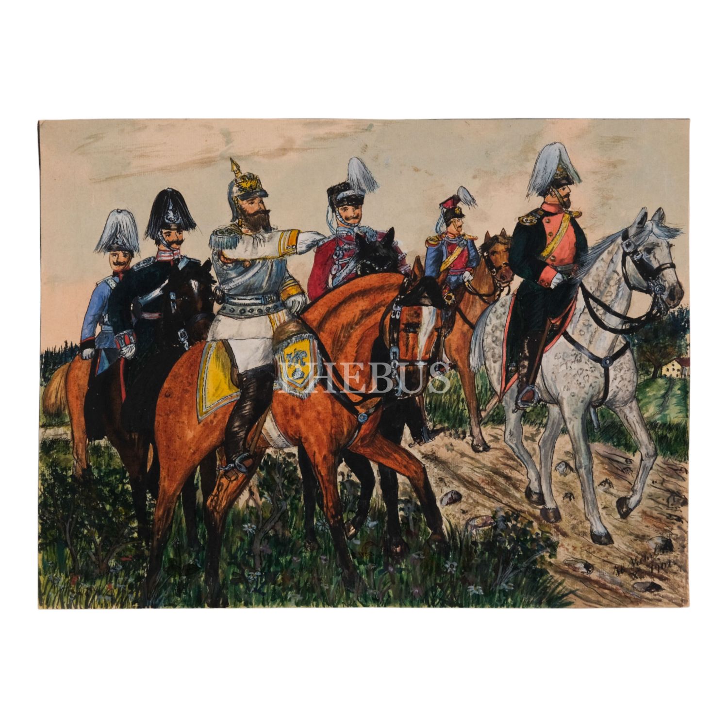 Sanatçı imzalı ve 1902 tarihli, süvariler konulu resim, kâğıt üzerine kuru boya, 27x20 cm...