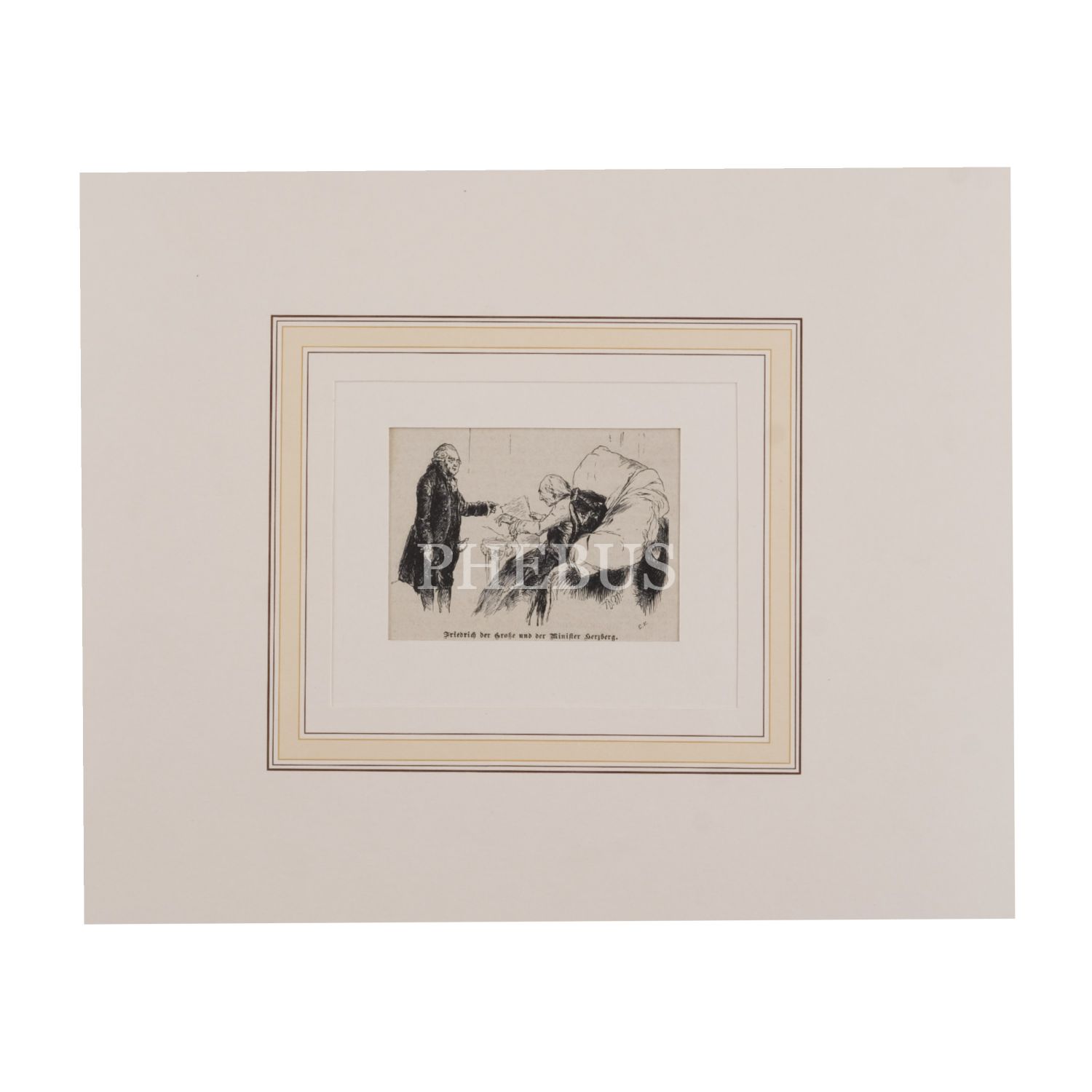Prusya Kralı II. Friedrich ve Bakan Herzberg konulu gravür, "Friedrich der Große und der Minister Herzberg.", paspartulu, gravür 11x8 cm, paspartu 30x24 cm...