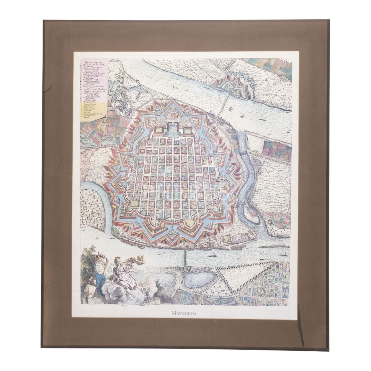 Mannheim (Almanya) şehrinin Ortaçağ dönemini tasvir eden renkli gravürün baskısı, paspartulu, paspartusuyla birlikte 67x77 cm...