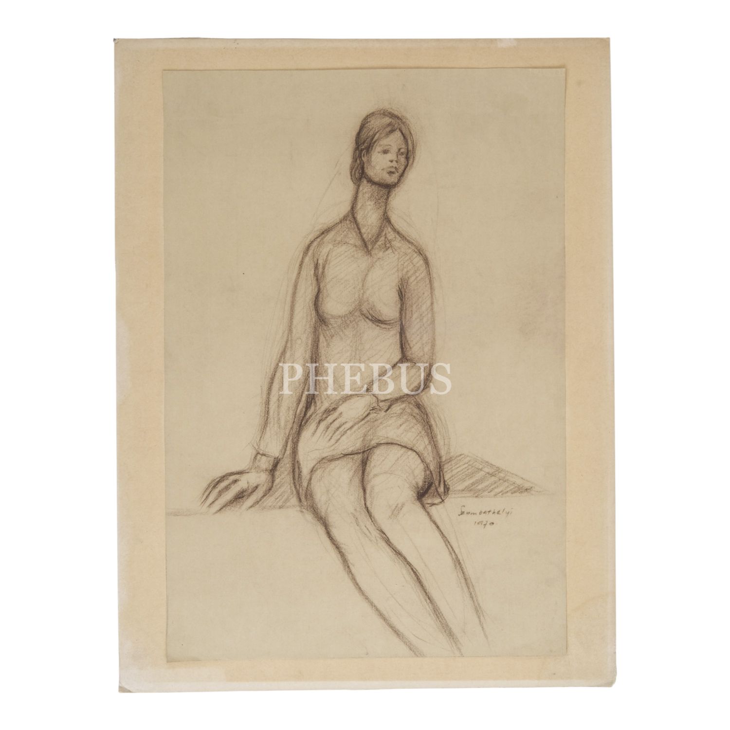 Sanatçı imzalı ve 1970 tarihli, kâğıt üzerine karakalem bir kadın eskizi, kartona yapışık, resim 40x58 cm, karton 50x64,5 cm...