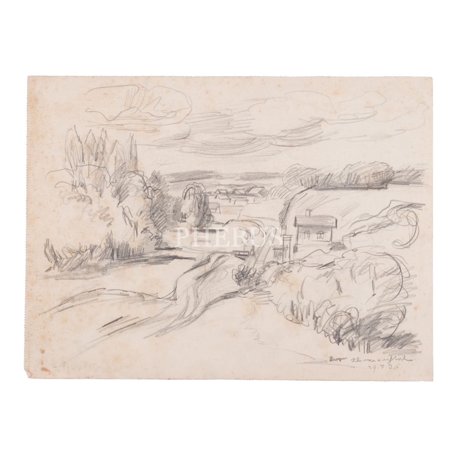 Ressam Albert Kley´den damgalı ve 1936 tarihli, kâğıt üzerine karakalem kasaba resmi, 36x27 cm...