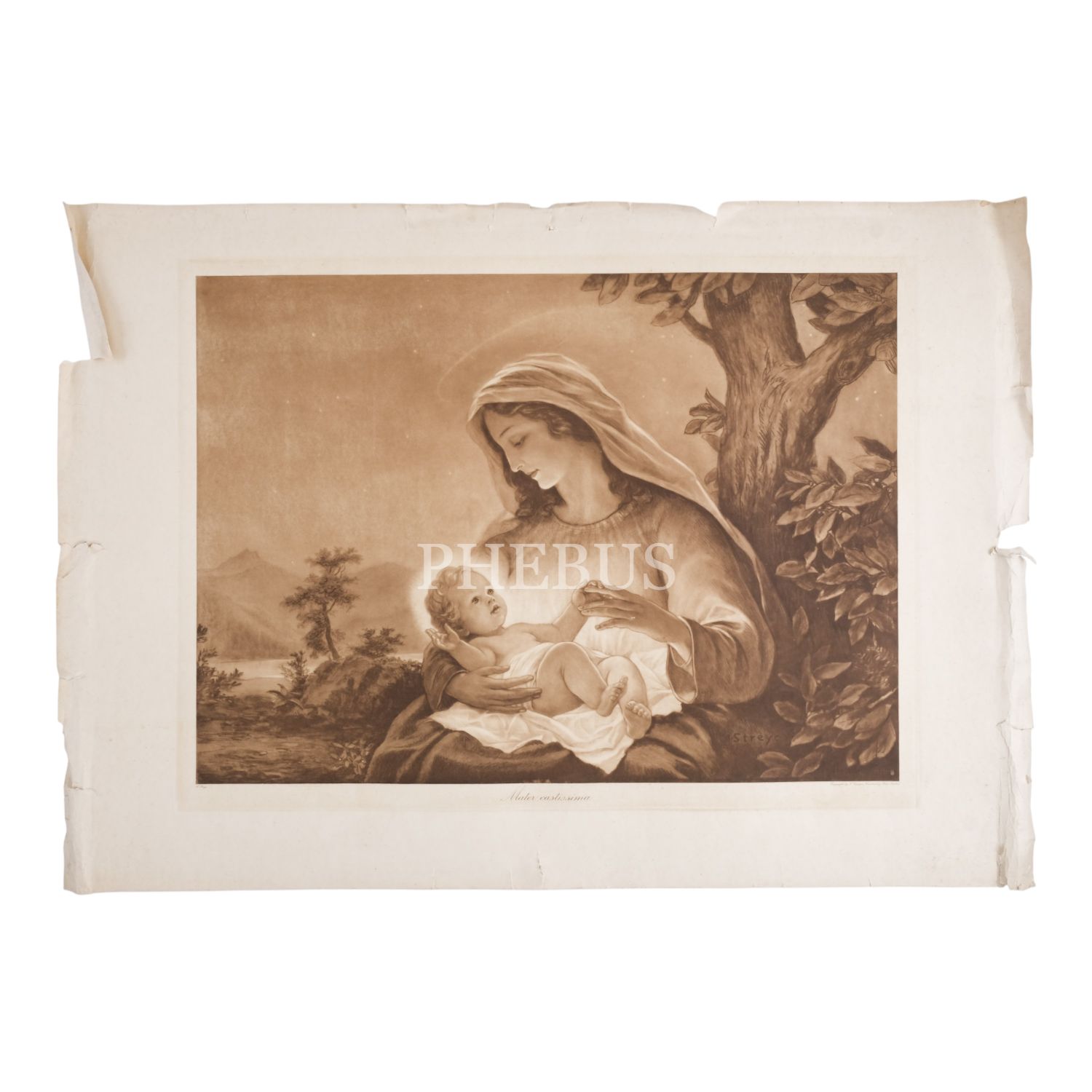 Meryem Ana ve Hz. İsa konulu büyük boy gravür, J. (Josef) Streyc imzalı, "Maler castissima" (En iffetli anne) başlıklı, Viyana baskı, 100x70,5 cm...