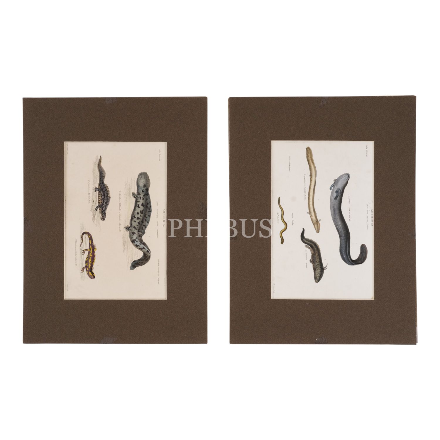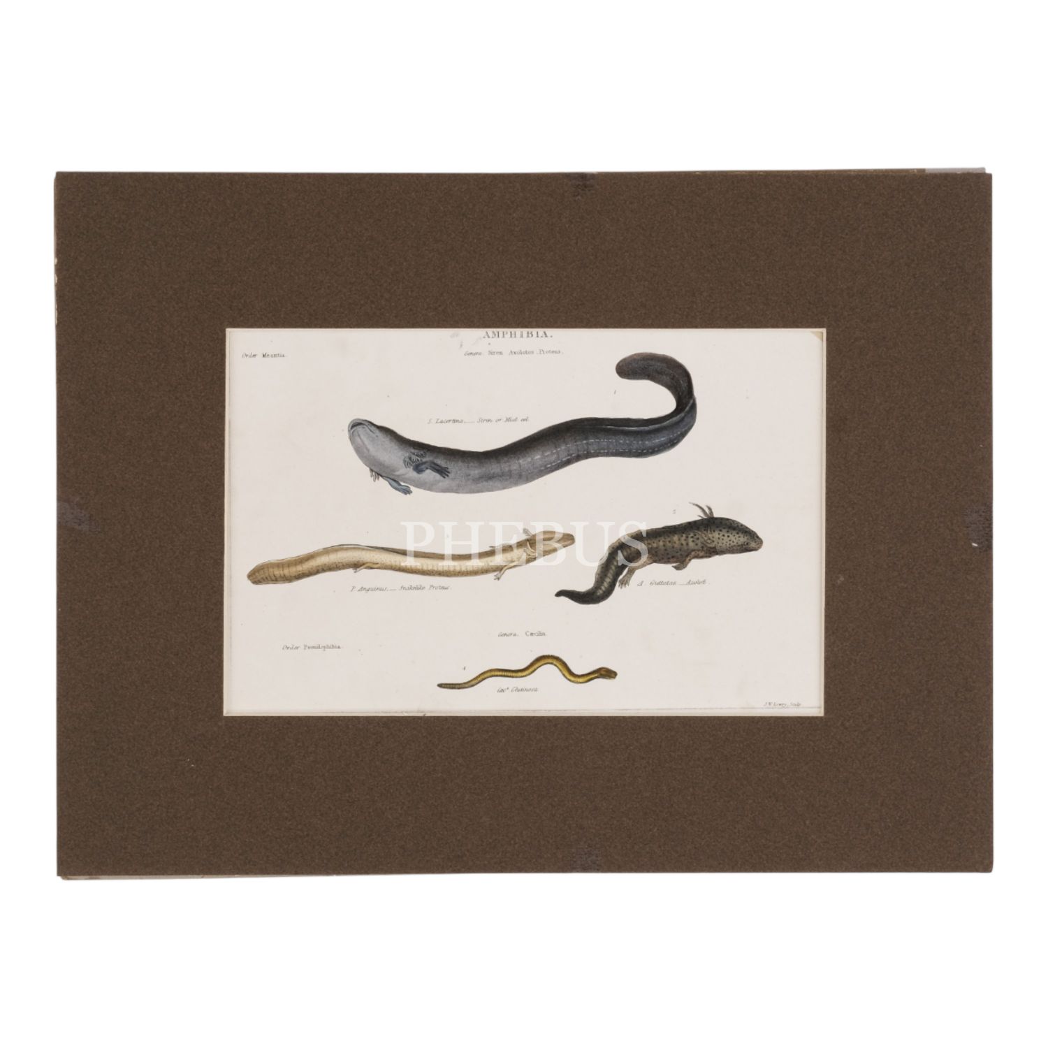 Amfibi türlerin resmedildiği 2 adet gravür, paspartusuyla birlikte 27x38 cm...