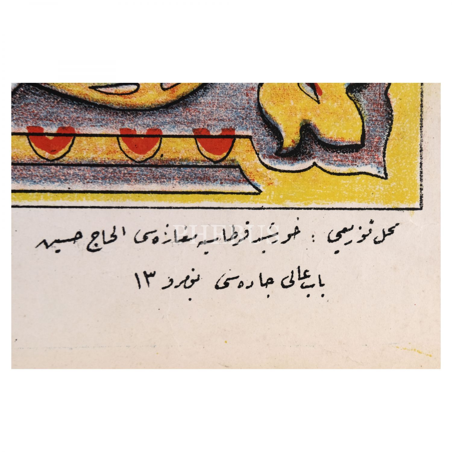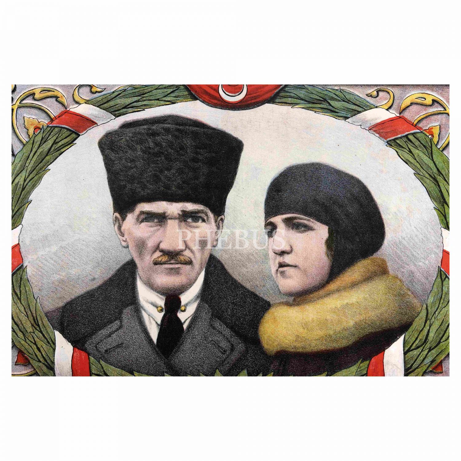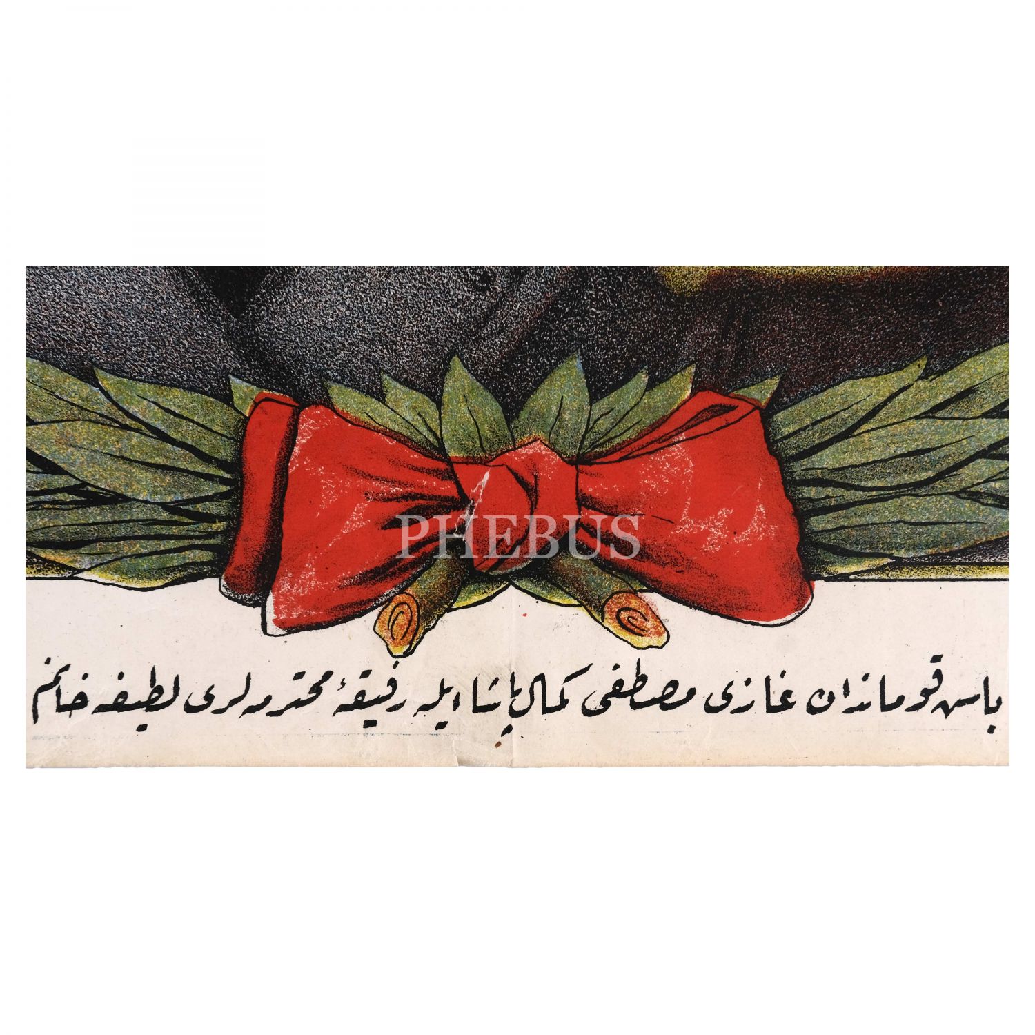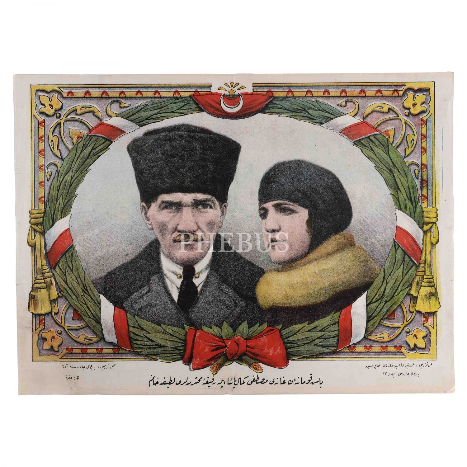 Mustafa Kemal Atatürk ve Latife Hanım'ın resmedildiği, "Başkumandan Gazi Mustafa Kemal Paşa ile Refika-i Muhteremeleri Latife Hanım" başlıklı afiş, Hurşit Kırtasiye Mağazası El-hac Hüseyin, 56x42 cm...