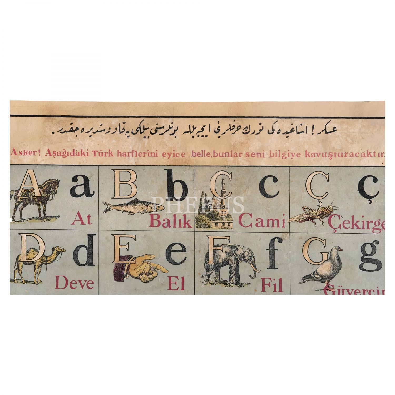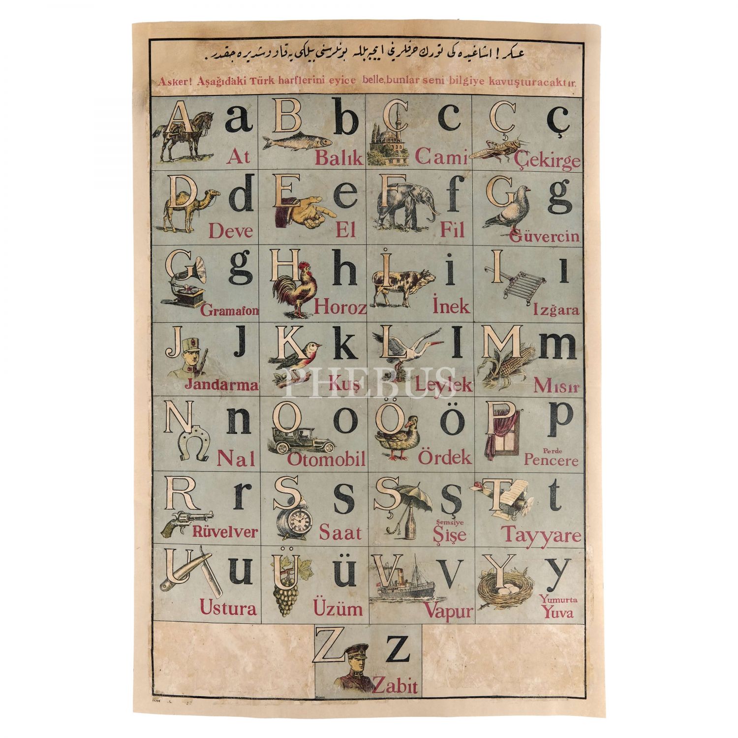 Harf İnkılabı´nın ilk döneminde ordudaki askere yeni harfleri öğretmek maksadıyla hazırlanan, Osmanlıca ve Latin harfli, "Asker aşağıdaki Türk harflerini eyice belle, bunlar seni bilgiye kavuşturacaktır." yazılı alfabe levhası, 55x80 cm...