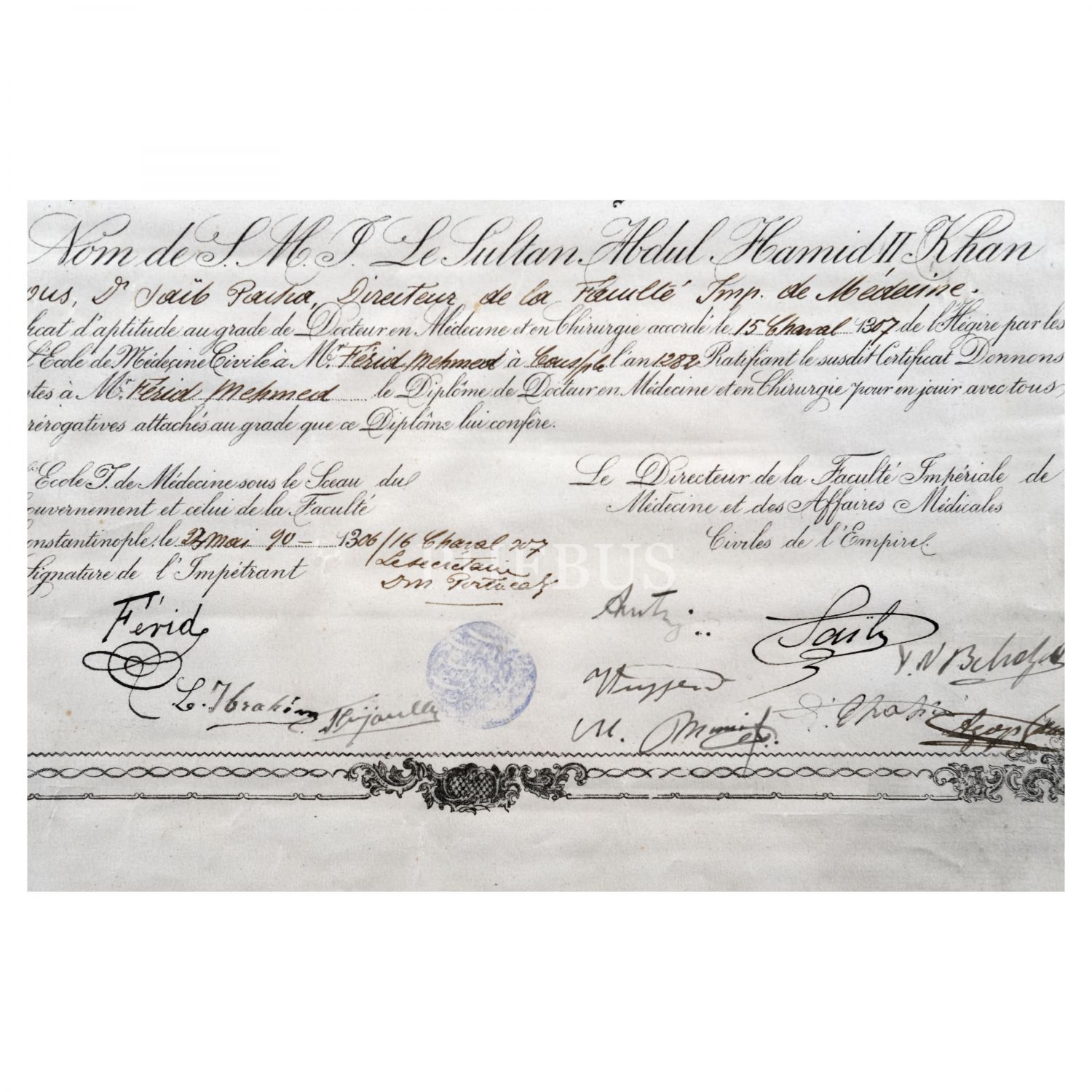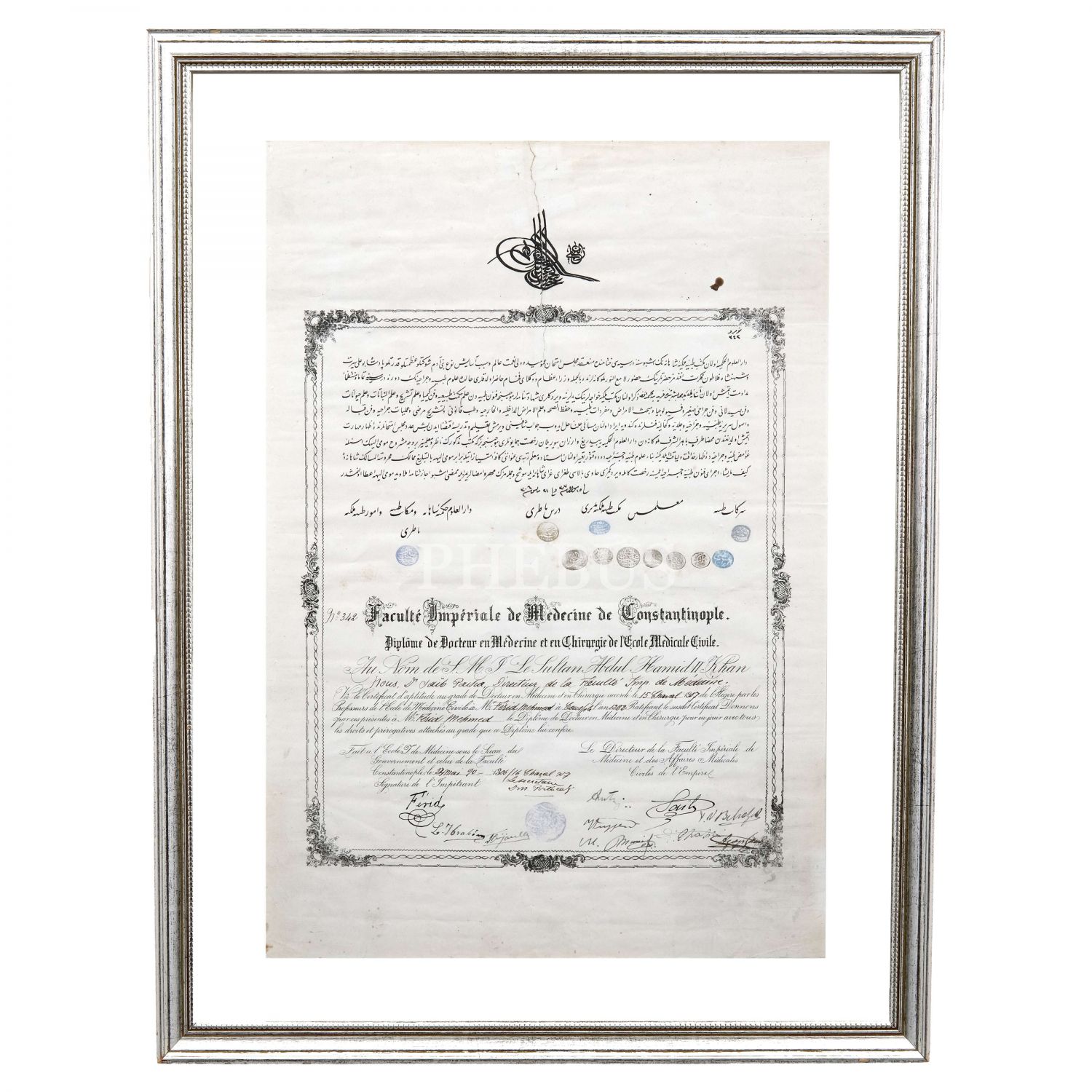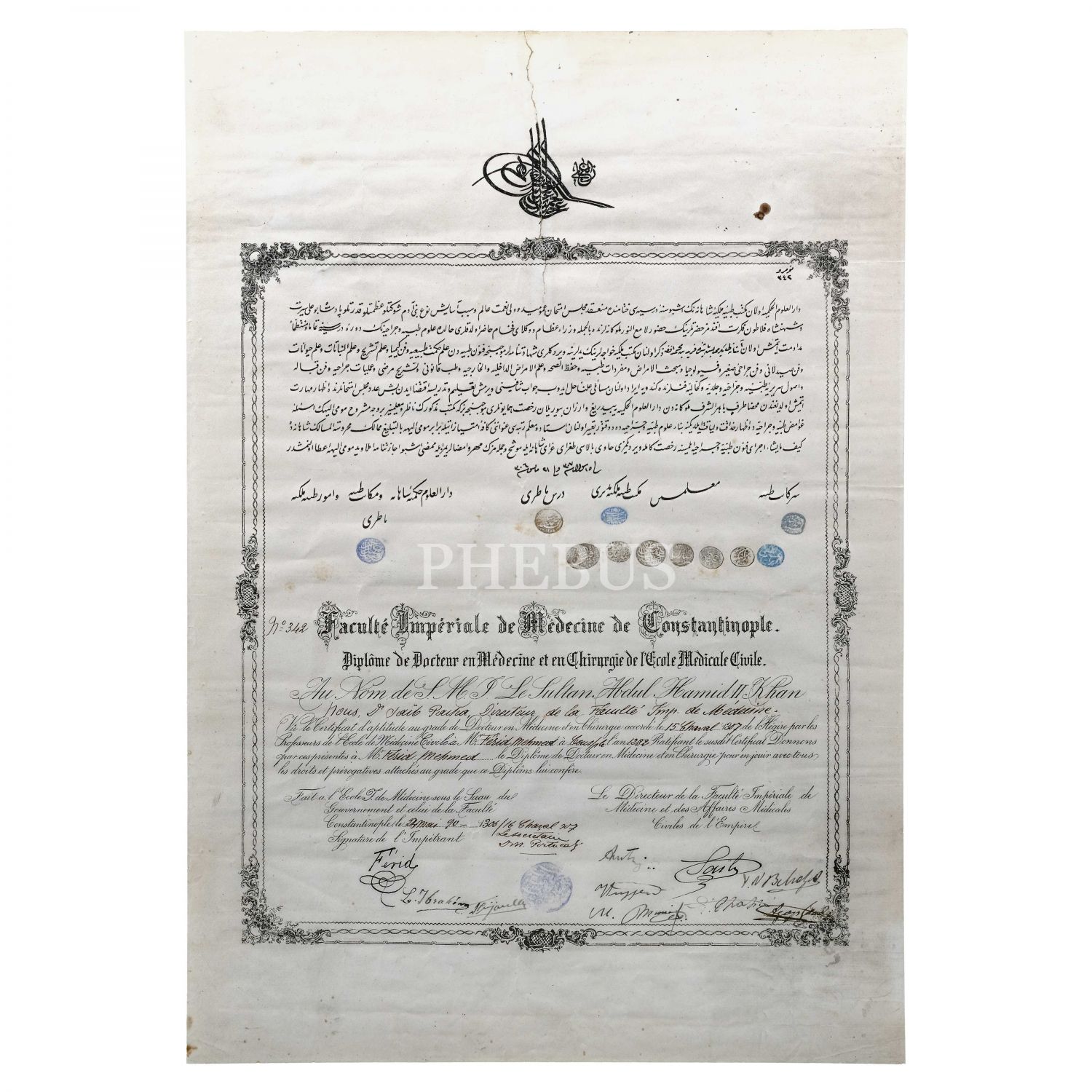 Mekteb-i Tıbbiye-i Mülkiye-i Şahane´den 1306 tarihinde mezun olan Ferit Mehmet Efendi´nin, Osmanlıca ve Fransızca tıp diploması, 40x57 cm...